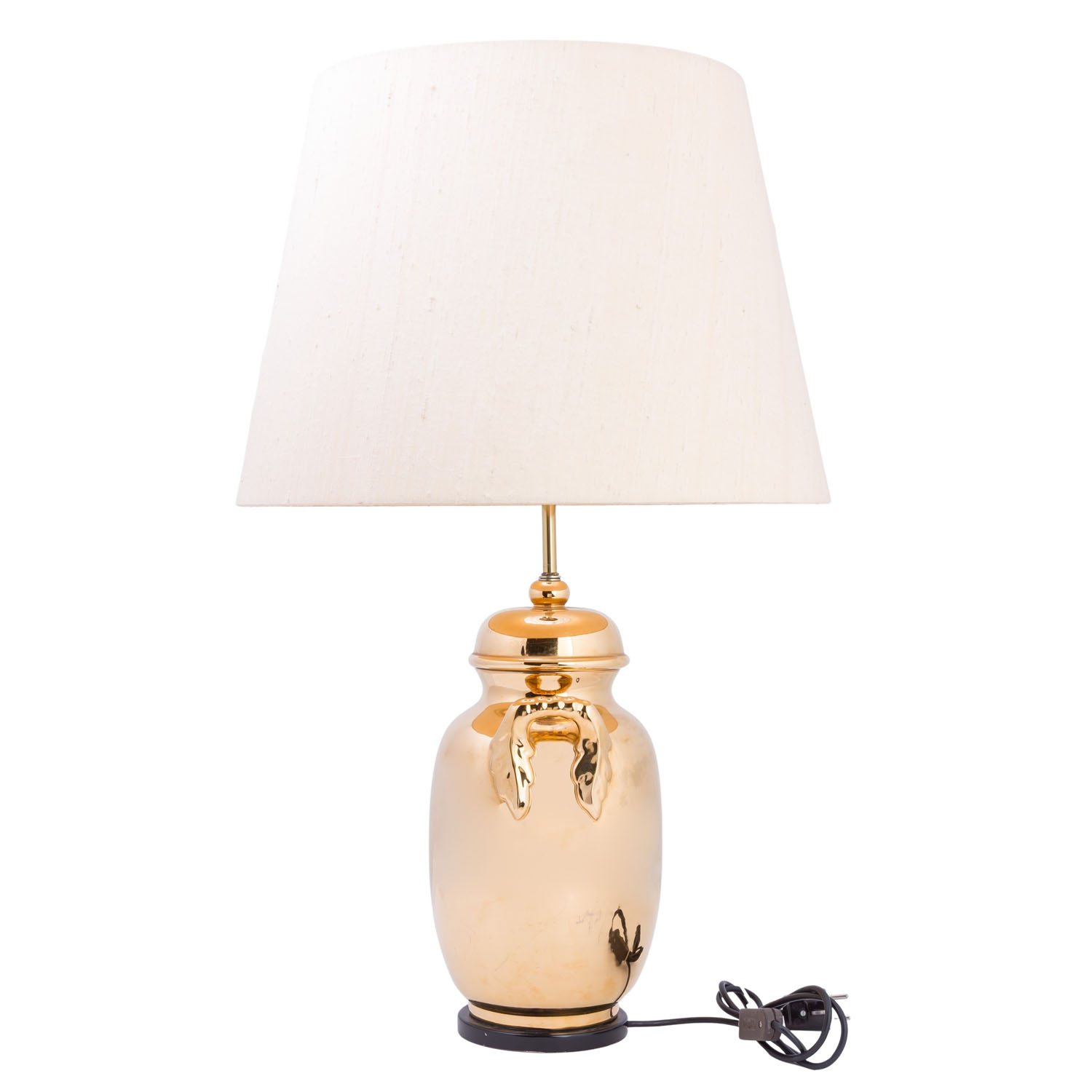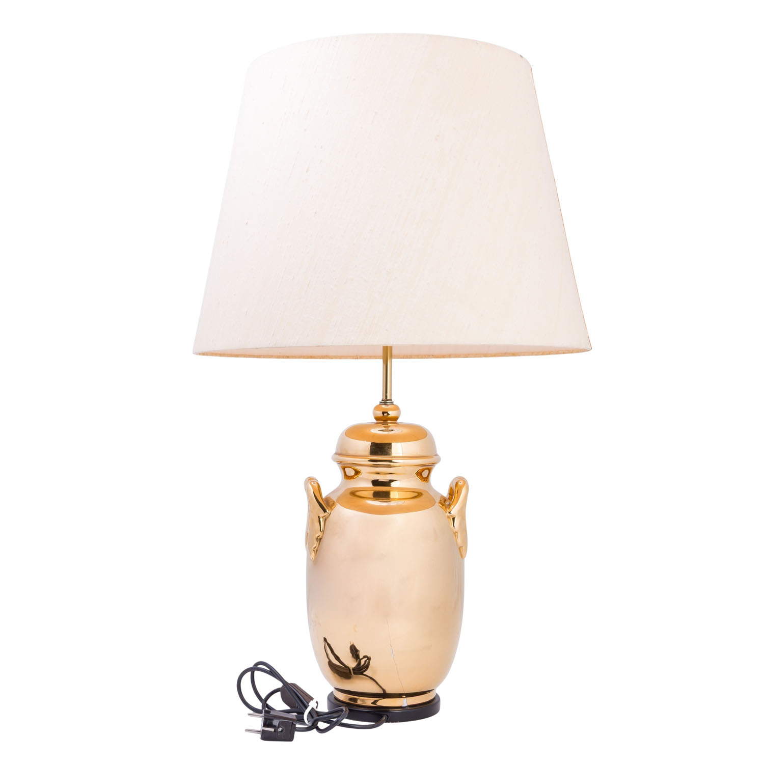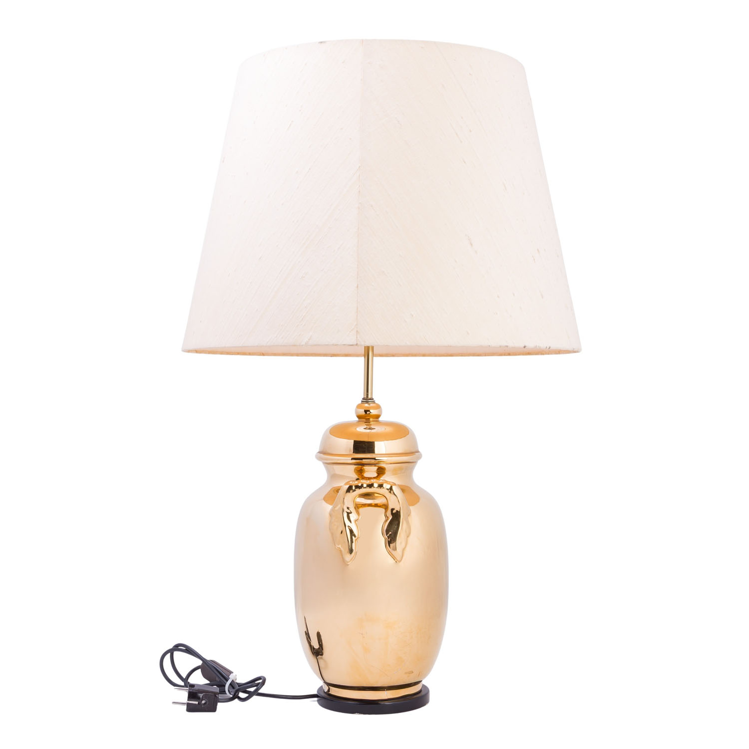 Large table lamp with gold-colored vase-shaped lamp base with a pair of side handles, two-light. Lampshade covered with cream-colored wild silk. H: 83 cm. Signs of age and wear, dam.