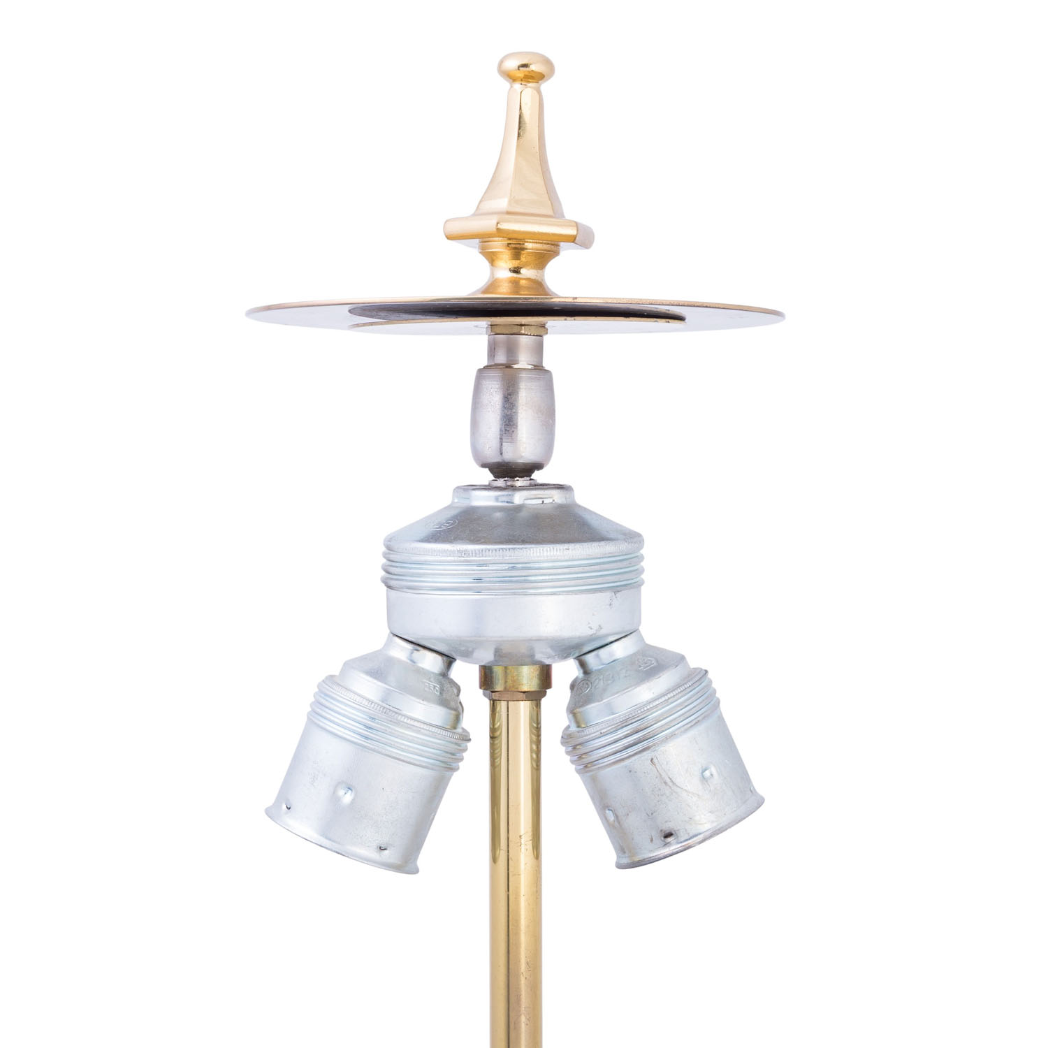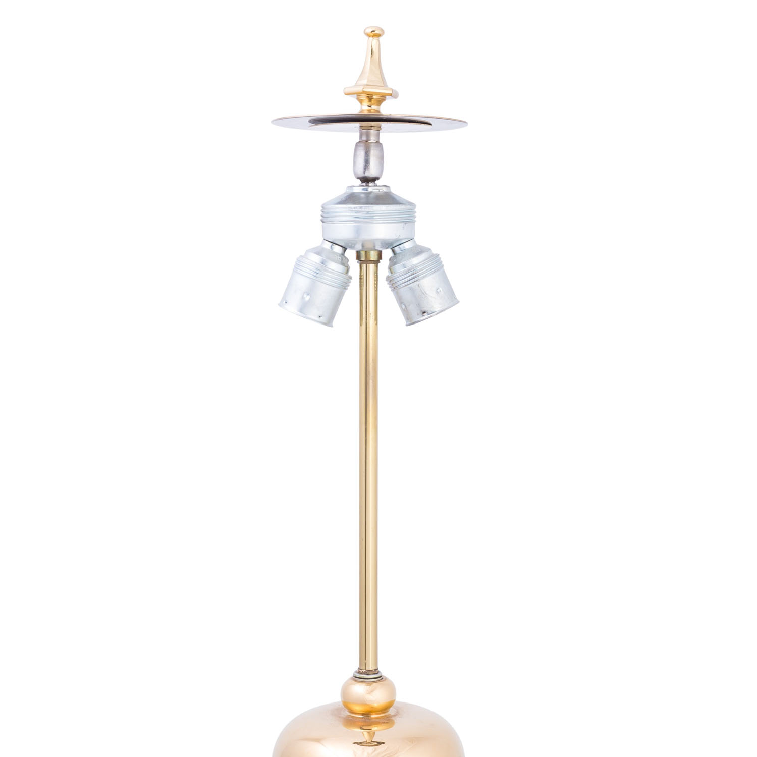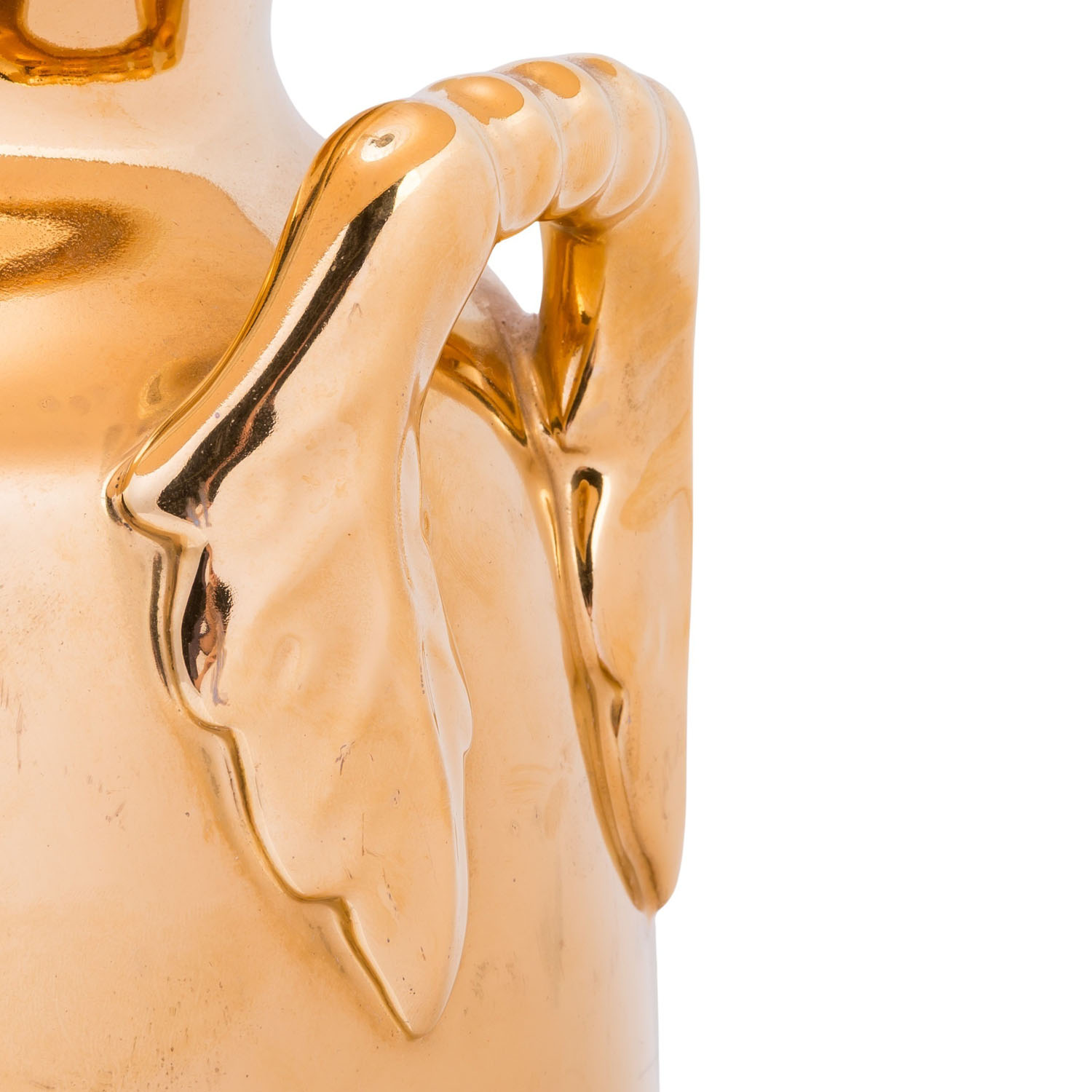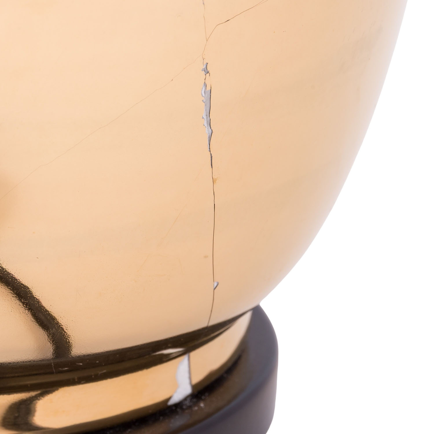 Large table lamp with gold-colored vase-shaped lamp base with a pair of side handles, two-light. Lampshade covered with cream-colored wild silk. H: 83 cm. Signs of age and wear, dam.