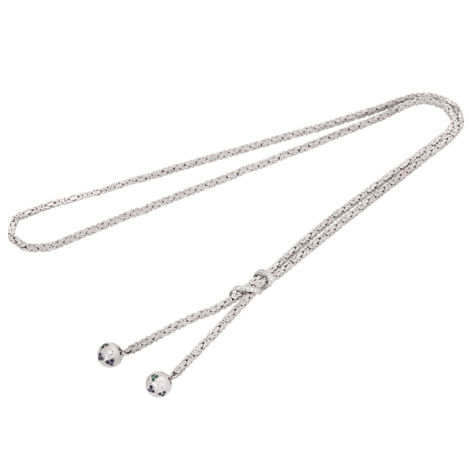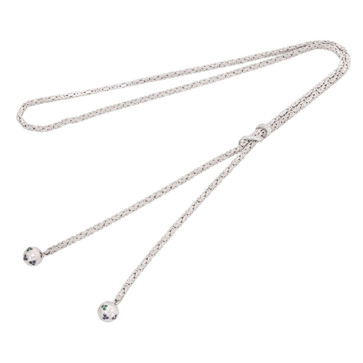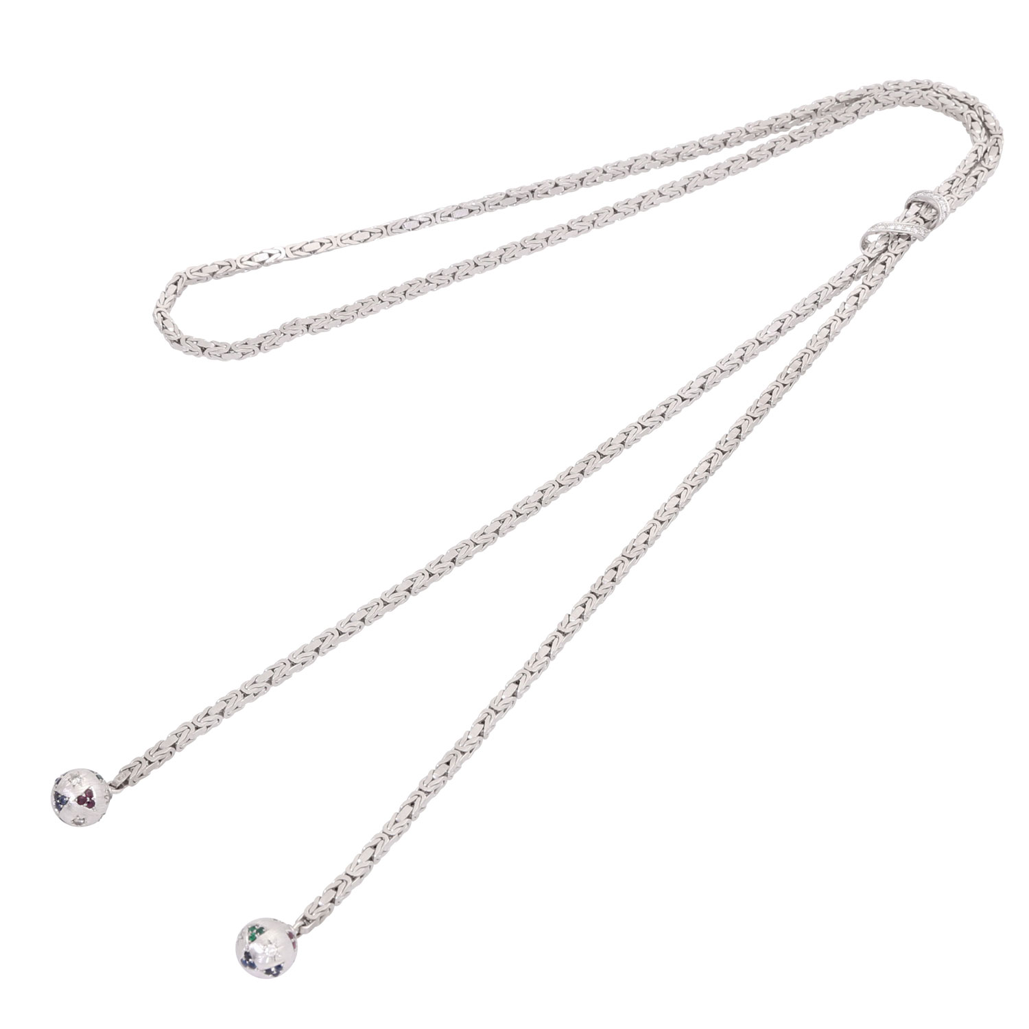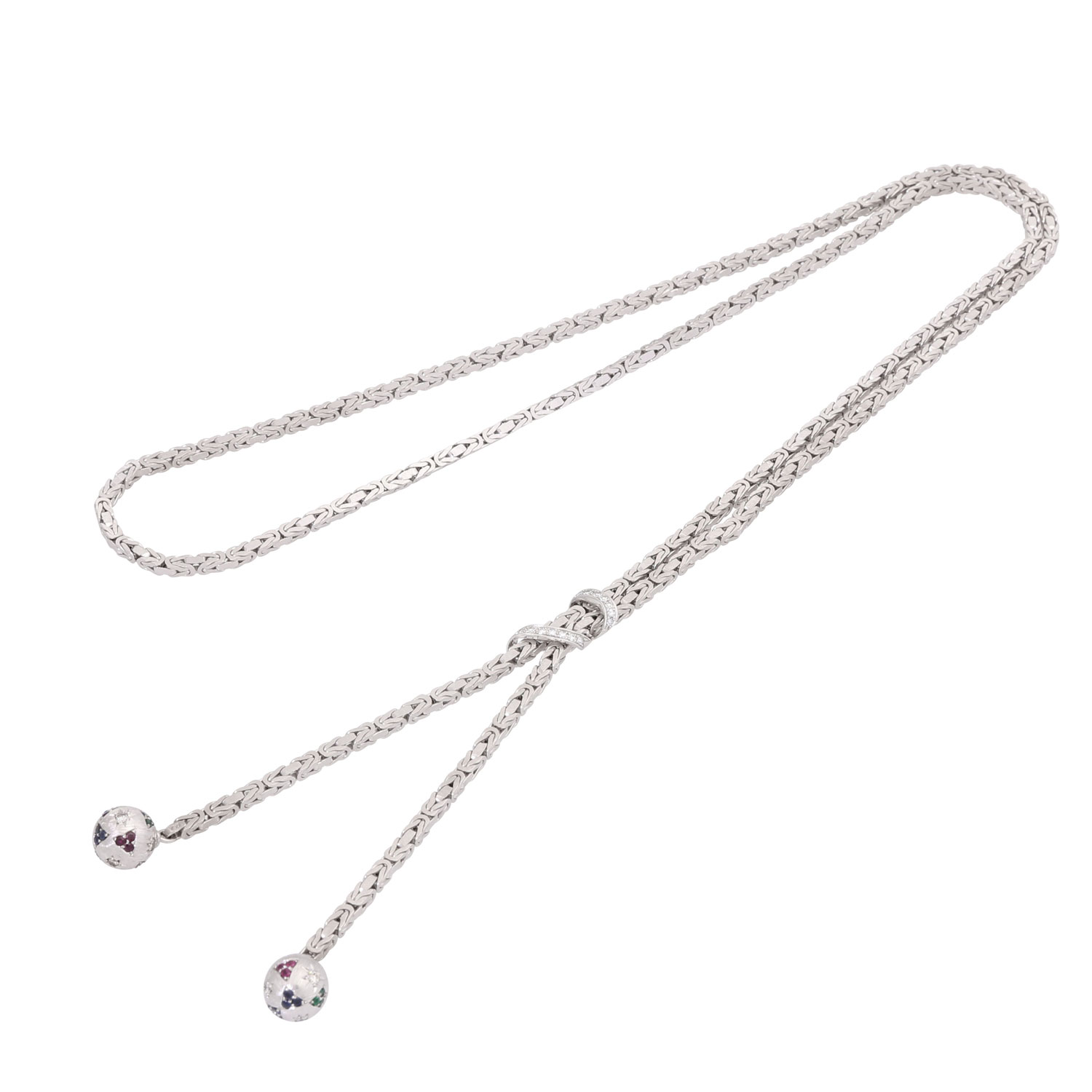 Byzantine lariat necklace, satin finish, brillant-and single- cut diamonds totall. 0.20 ct, good colour and clarity, sapphire, rubies and emeralds, 18K white gold, 118 g, L: ca. 105 cm, B: ca. 0.3 cm, late 20th century, minor signs of wear, clasp flexible, handcraftet work.