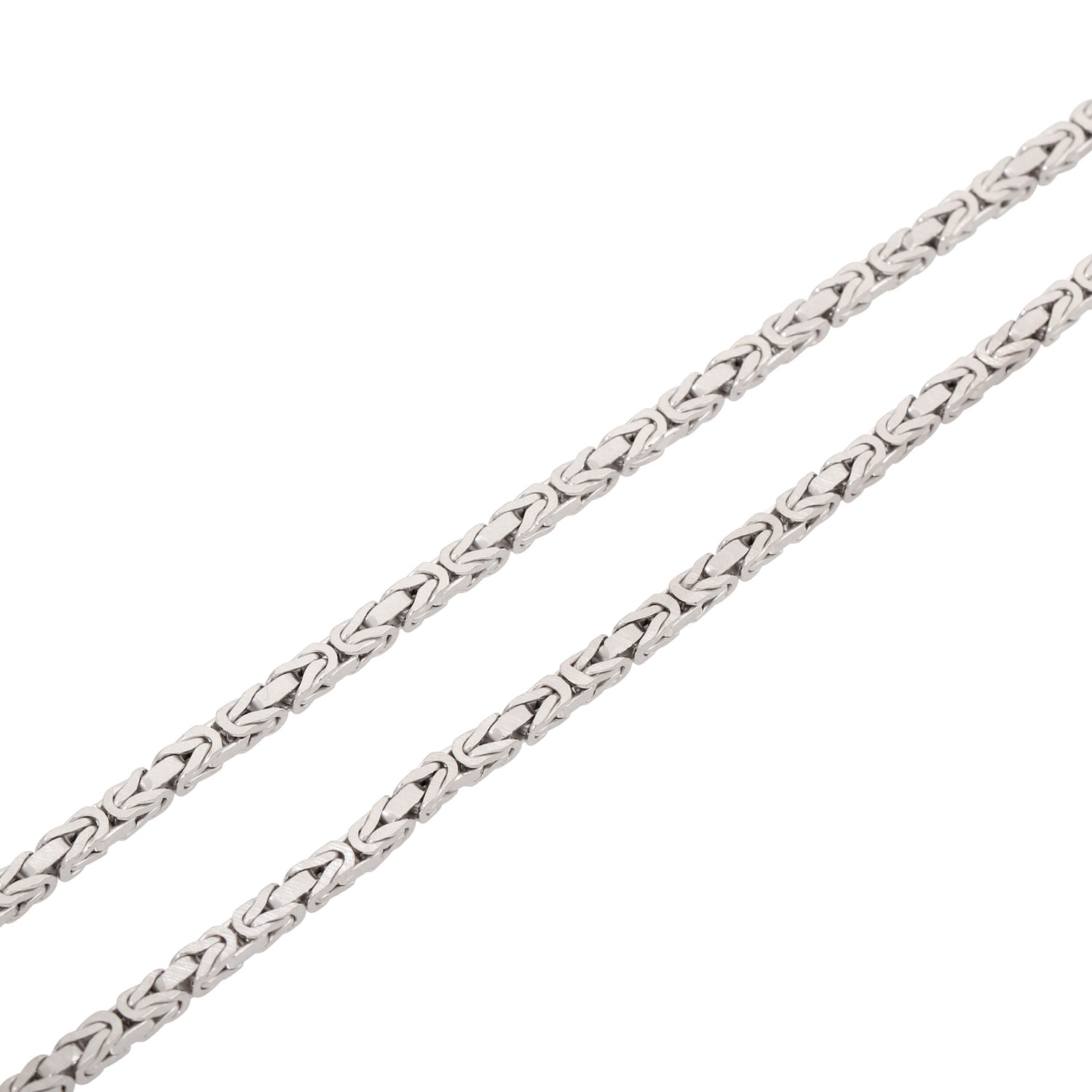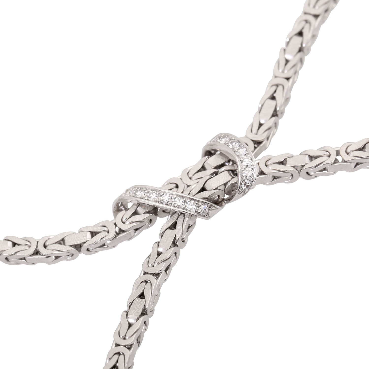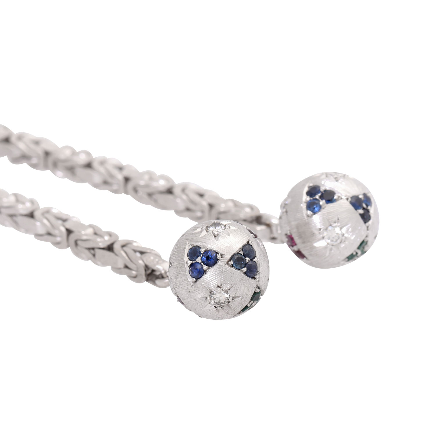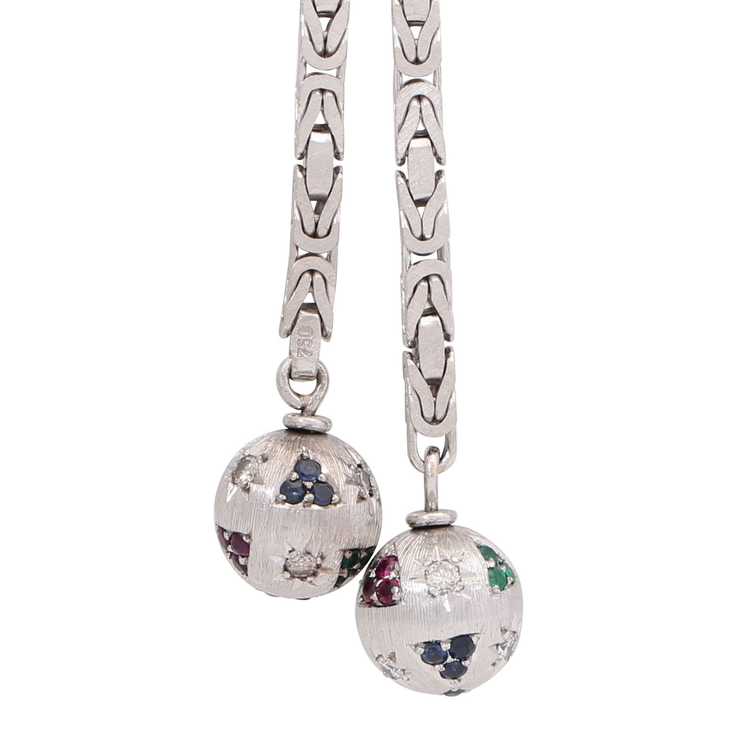 Byzantine lariat necklace, satin finish, brillant-and single- cut diamonds totall. 0.20 ct, good colour and clarity, sapphire, rubies and emeralds, 18K white gold, 118 g, L: ca. 105 cm, B: ca. 0.3 cm, late 20th century, minor signs of wear, clasp flexible, handcraftet work.