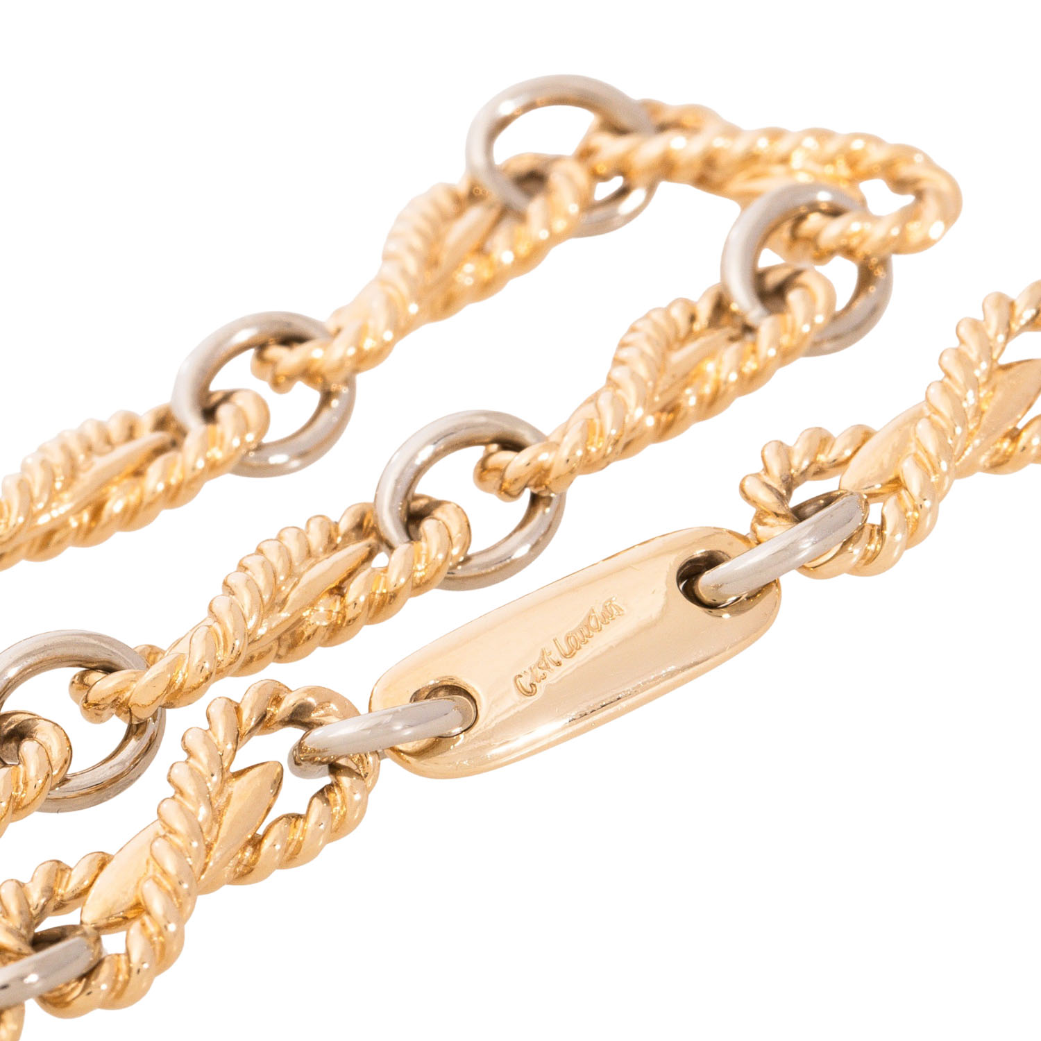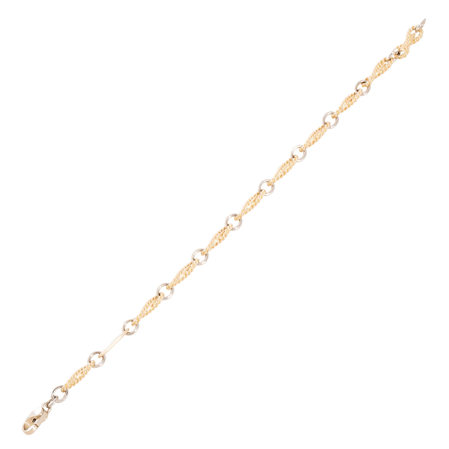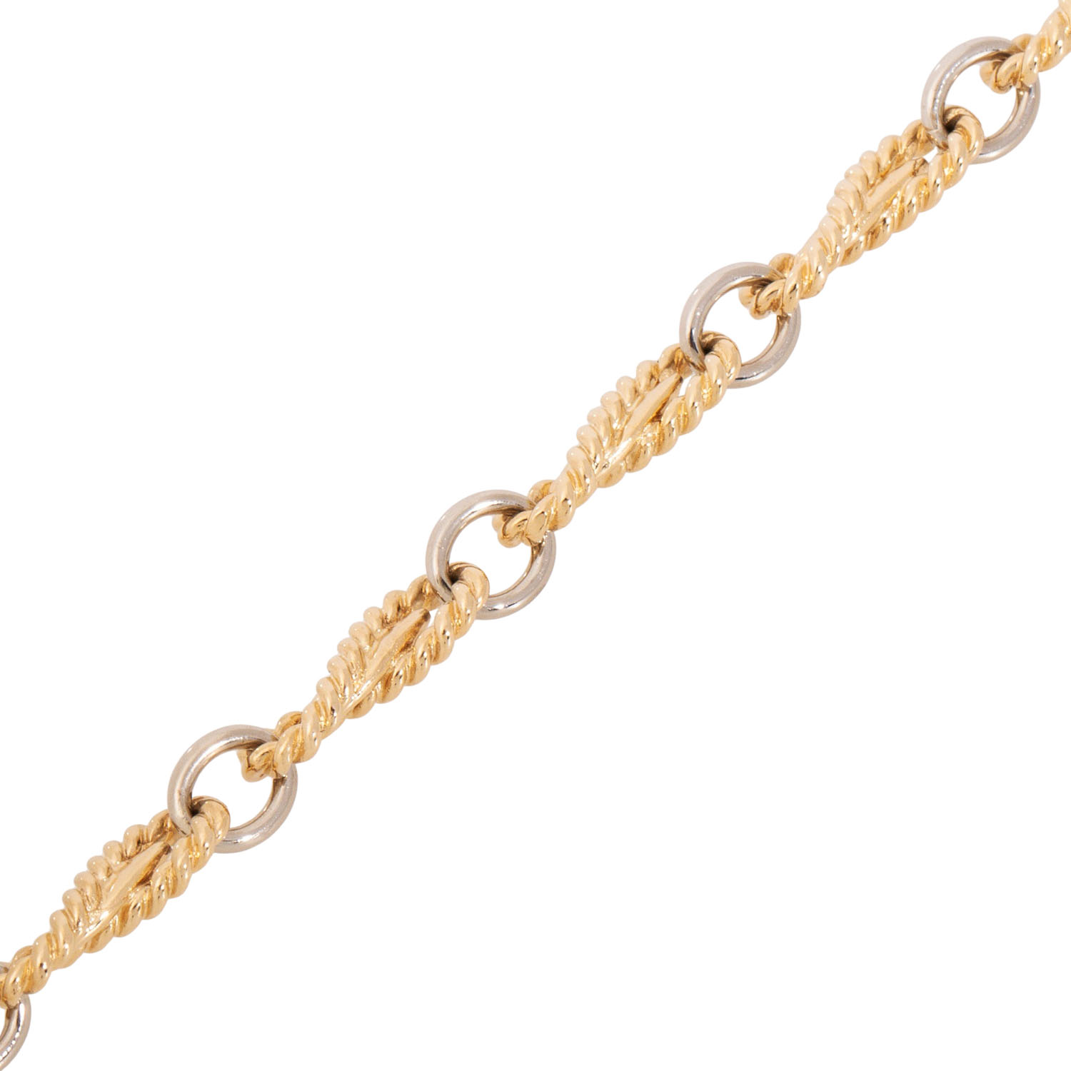 LAUDIER Bracelet, variation of anchor chain with links out of corded wire, 14K yellow and white gold, 15.5 g, L: 21 cm, W: 6 mm, carabiner clasp, late 20th century, minor signs of wear.