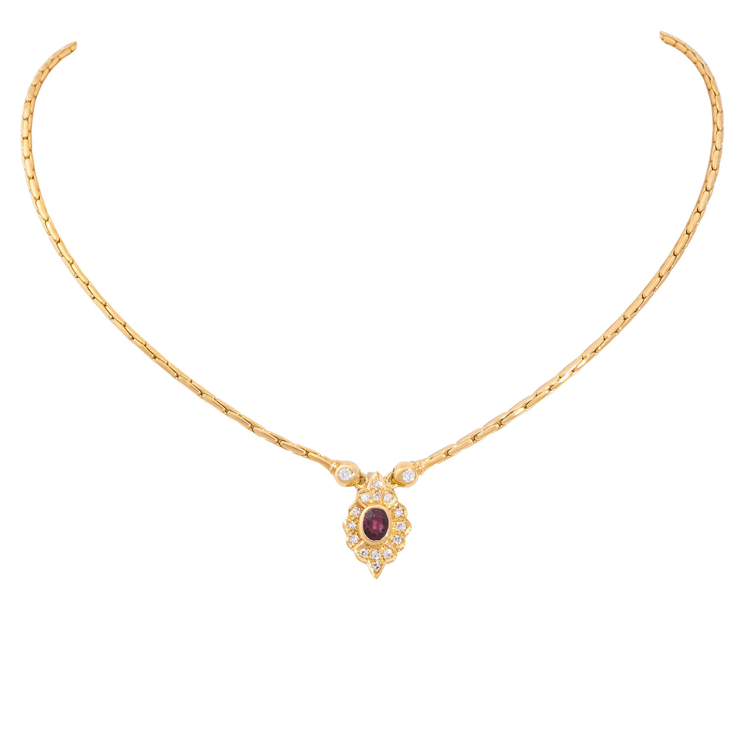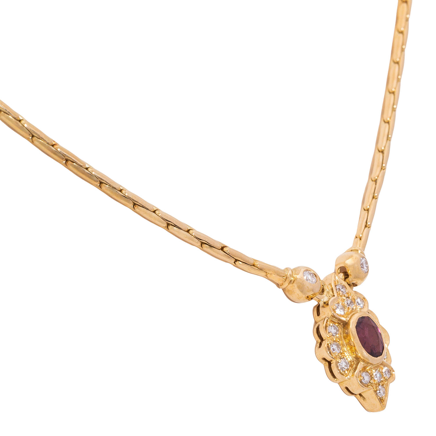 LAUDIER jewellery set with rubies and diamonds, 18K yellow gold, 17.8 g, consisting of necklace L: 38 cm, diamonds totalling ca. 0.54 ct (marked) and ring size 50, diamonds totalling ca. 0.74 ct (marked), late 20th century, good condition, with maker's mark LAUDIER.