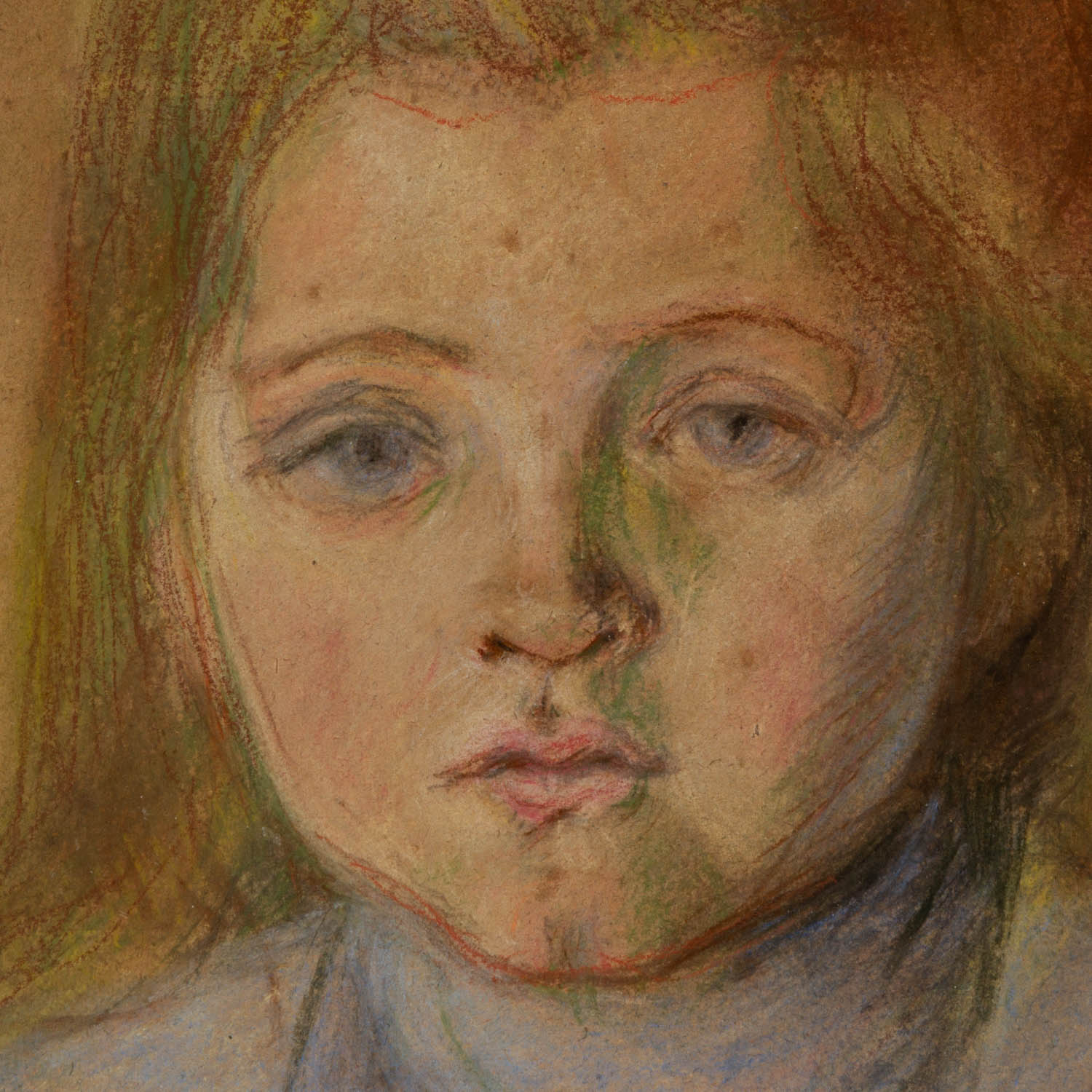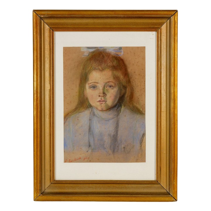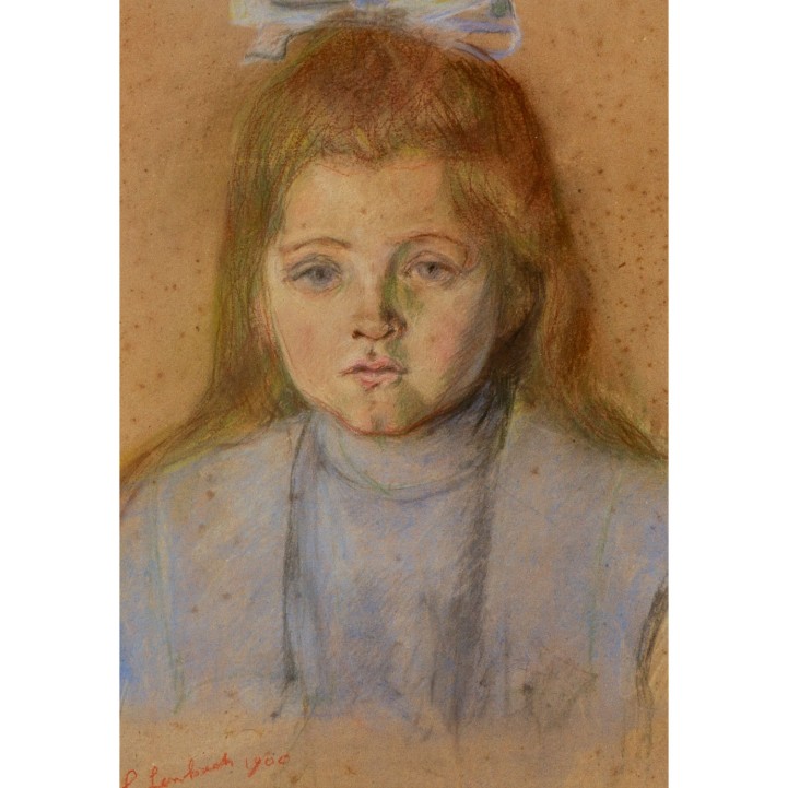 LENBACH, FRANZ VON (1836-1904), ‘Girl with Blue Ribbon’, 1900, bust portrait en face with light blue dress, inscribed and dated lower left, coloured chalk/paper, HxW: passe-partout cut-out approx. 38x27 cm (61x46 cm with frame). Signs of age, browned and stained. Framed in passe-partout behind glass. VERSO numbered in black chalk: 473/c.
