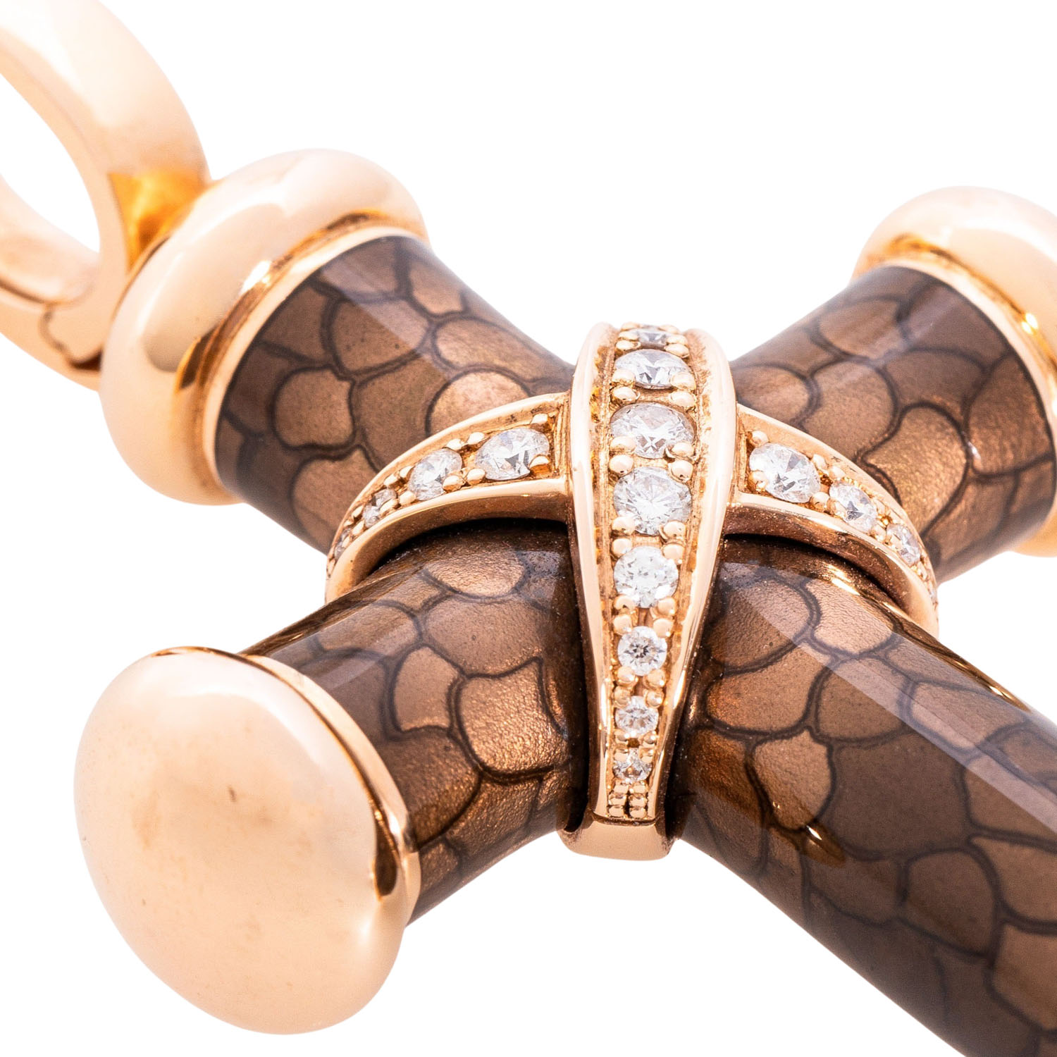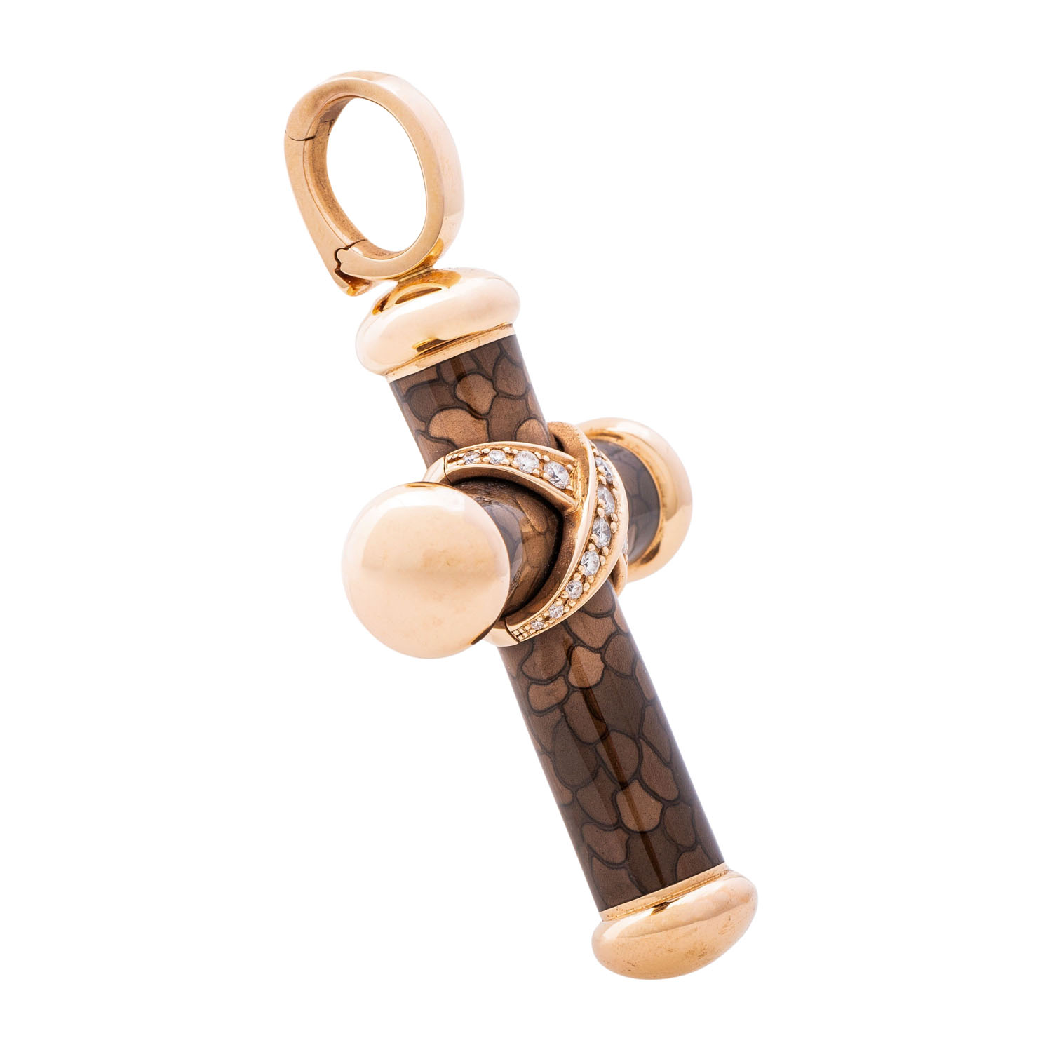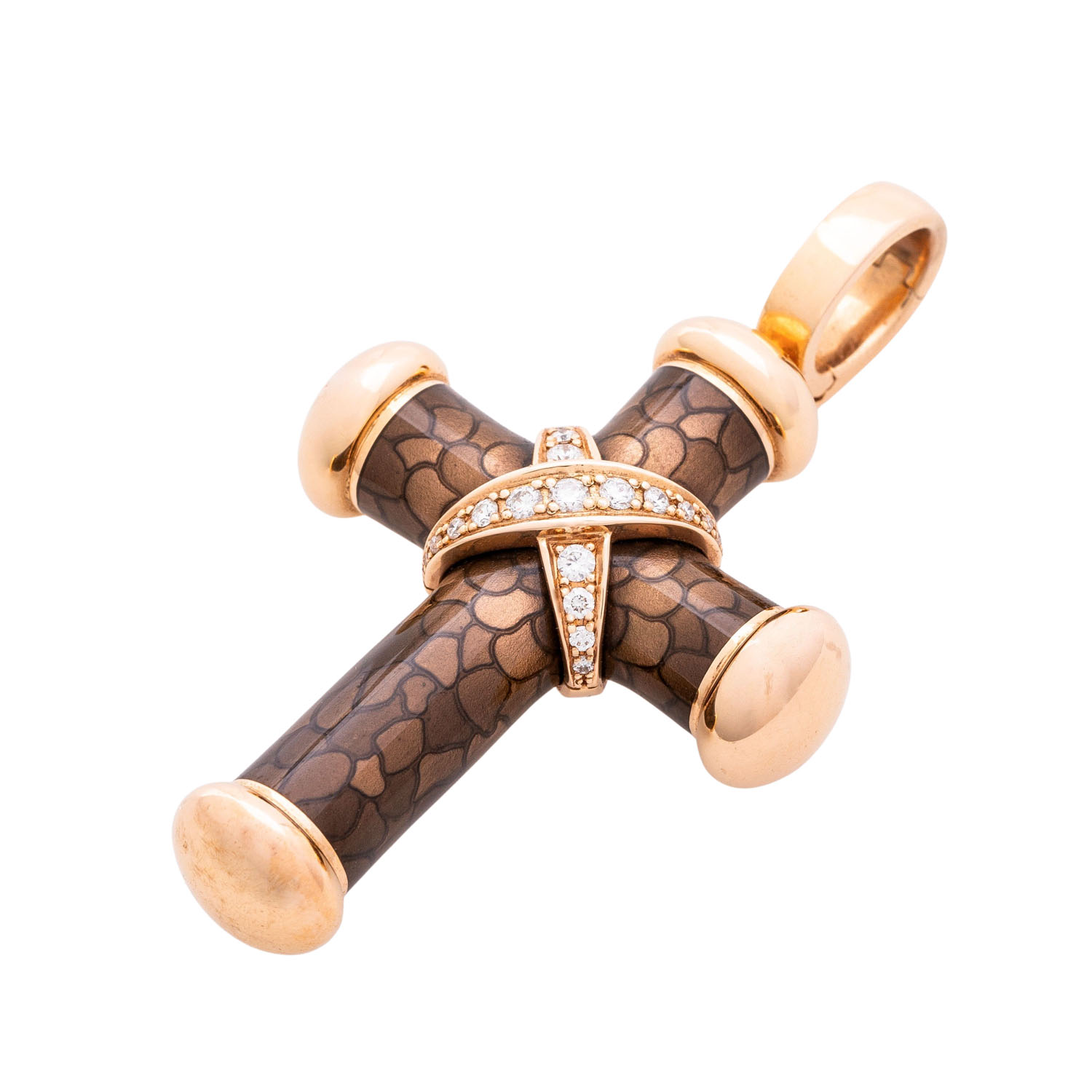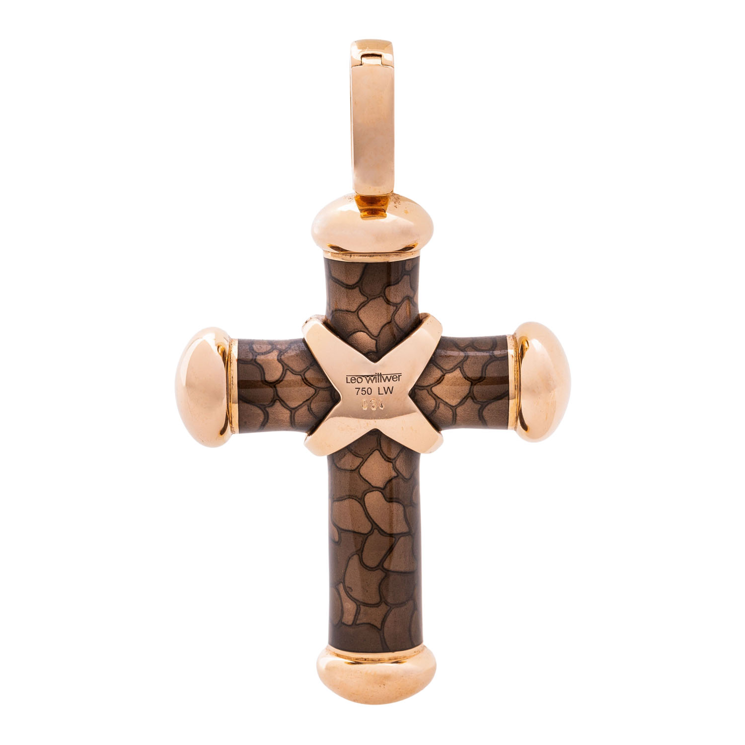LEO WITTWER cross pendant with brilliant-cut diamonds totalling approx. 0.34 ct (hallmark), good to very good colour and clarity, RSG 18K and cold enamel, 28.7 g, retail price: approx. 10,000 €, l: approx. 62.5 mm, w: approx. 36.7 mm, 21st century, minor to medium signs of wear, with maker's signature, ‘Schmuckgebiet’ certificate enclosed. Surface elaborately textured with cold enamel.