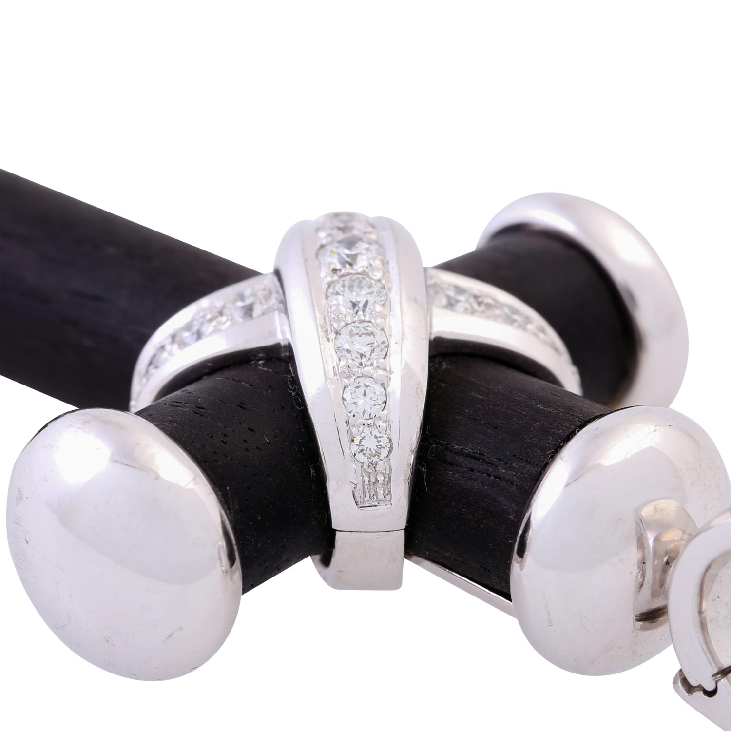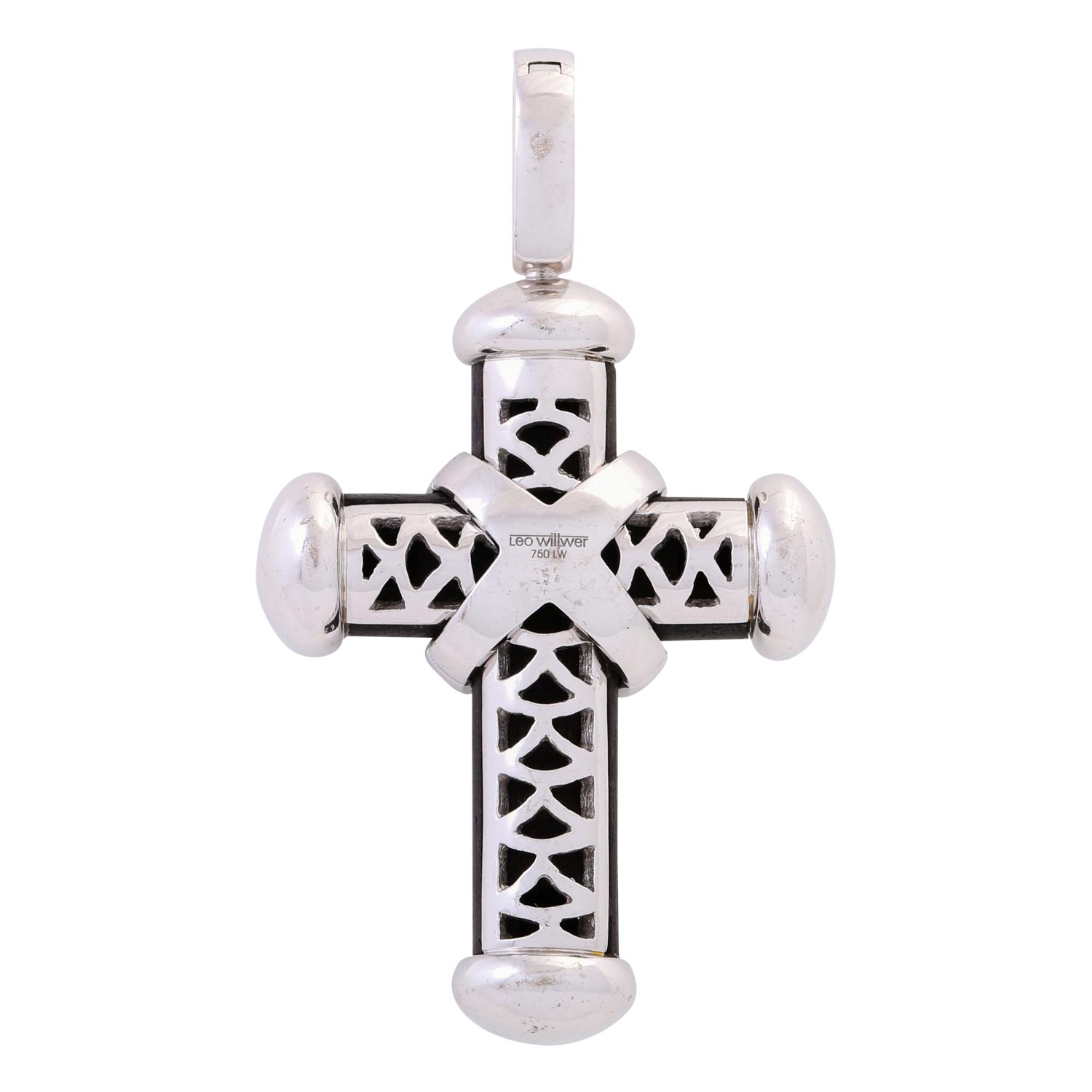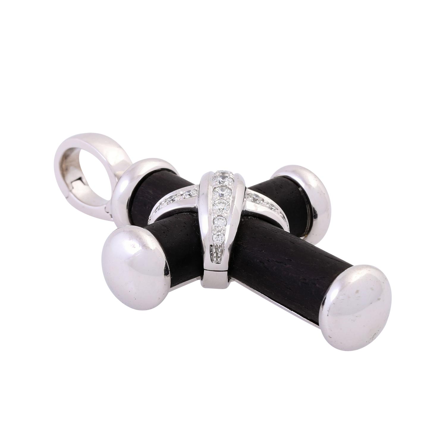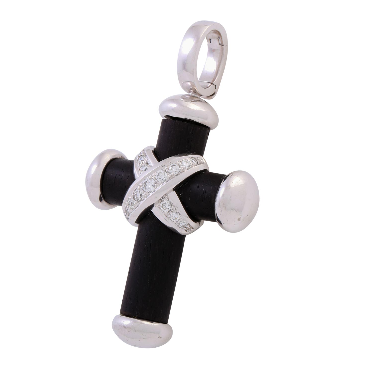LEO WITTWER Pendant/Hanger 'Cross', 15 brilliant cut diamonds, totalling 0.54 ct (marked), RW (G)/VVS, wood, 18K white gold, 32.8 g, L x W: 61 x 35 mm, 20th/21st century, distinct signs of wear.