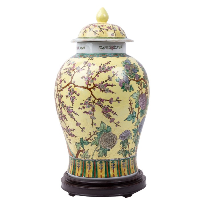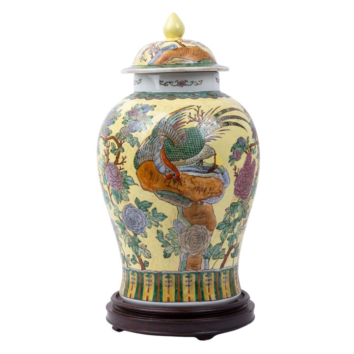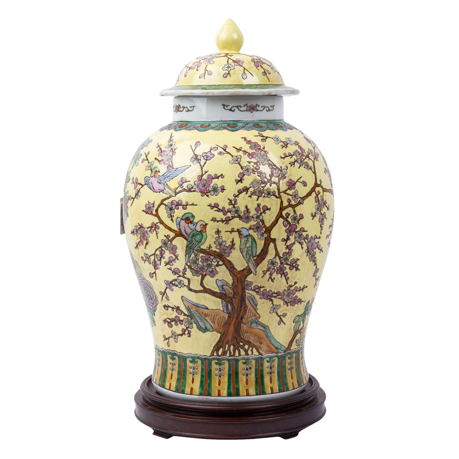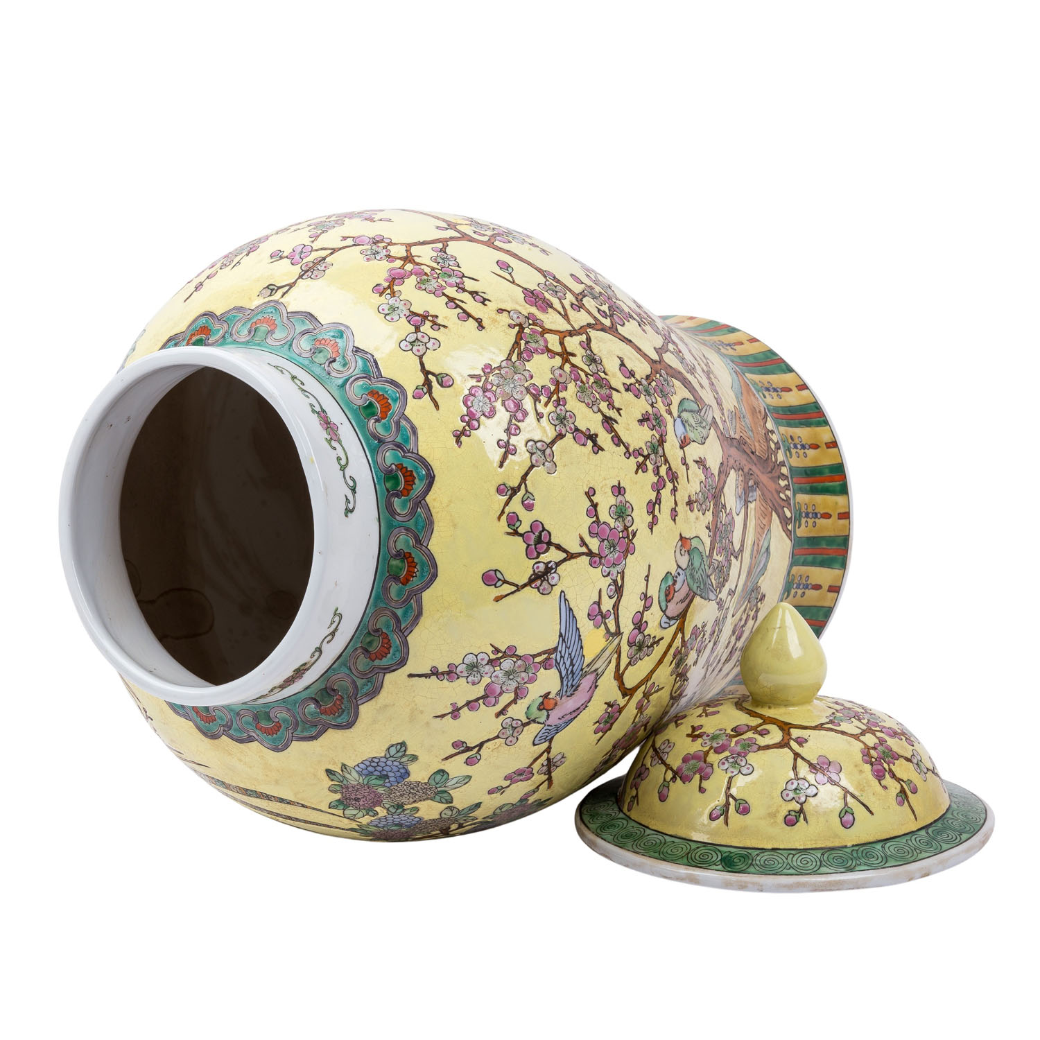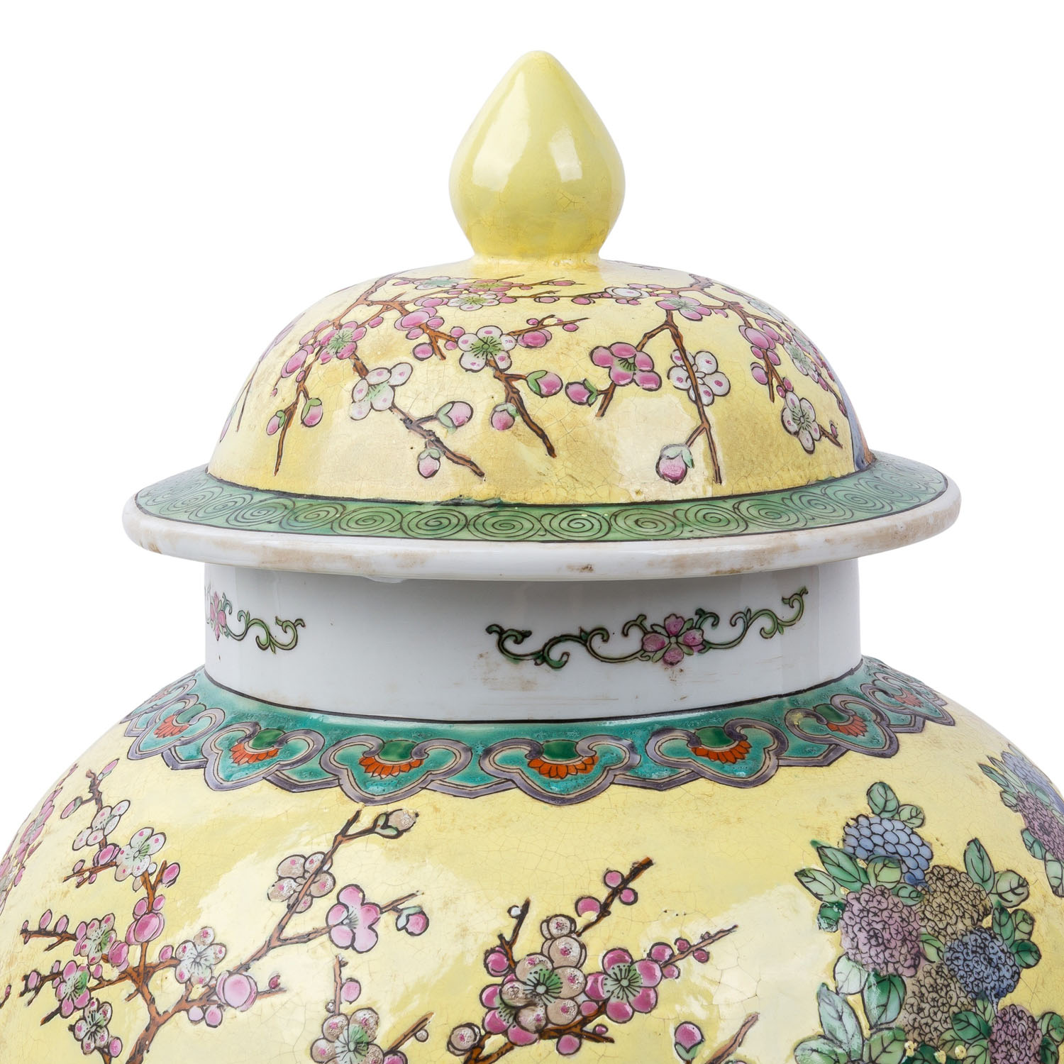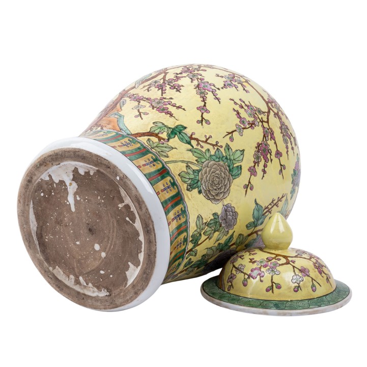 Lidded vase, CHINA, 20th century. Flower and bird painting on yellow background, H: 50 cm, damaged.
