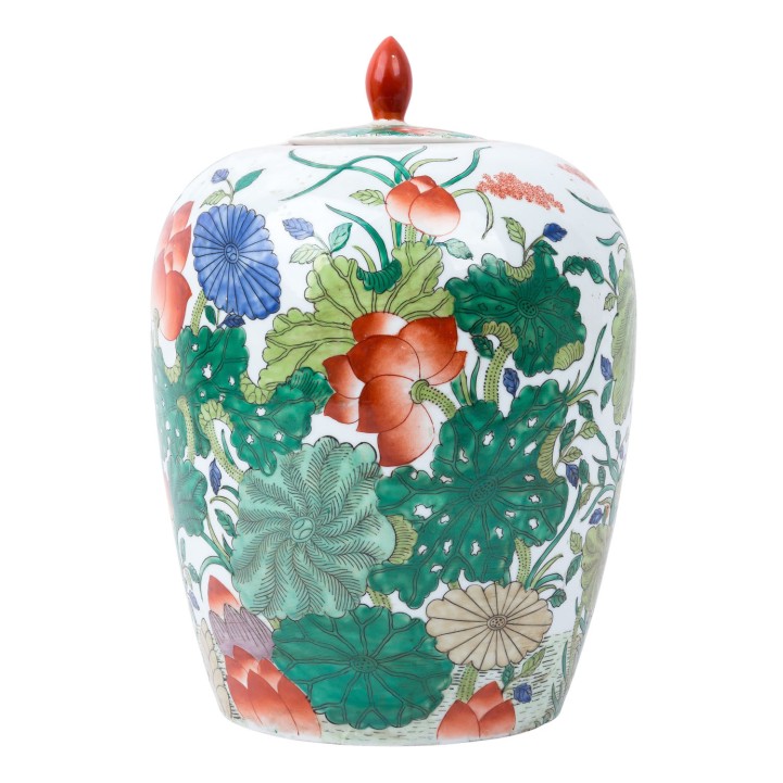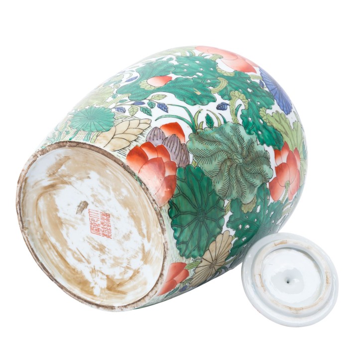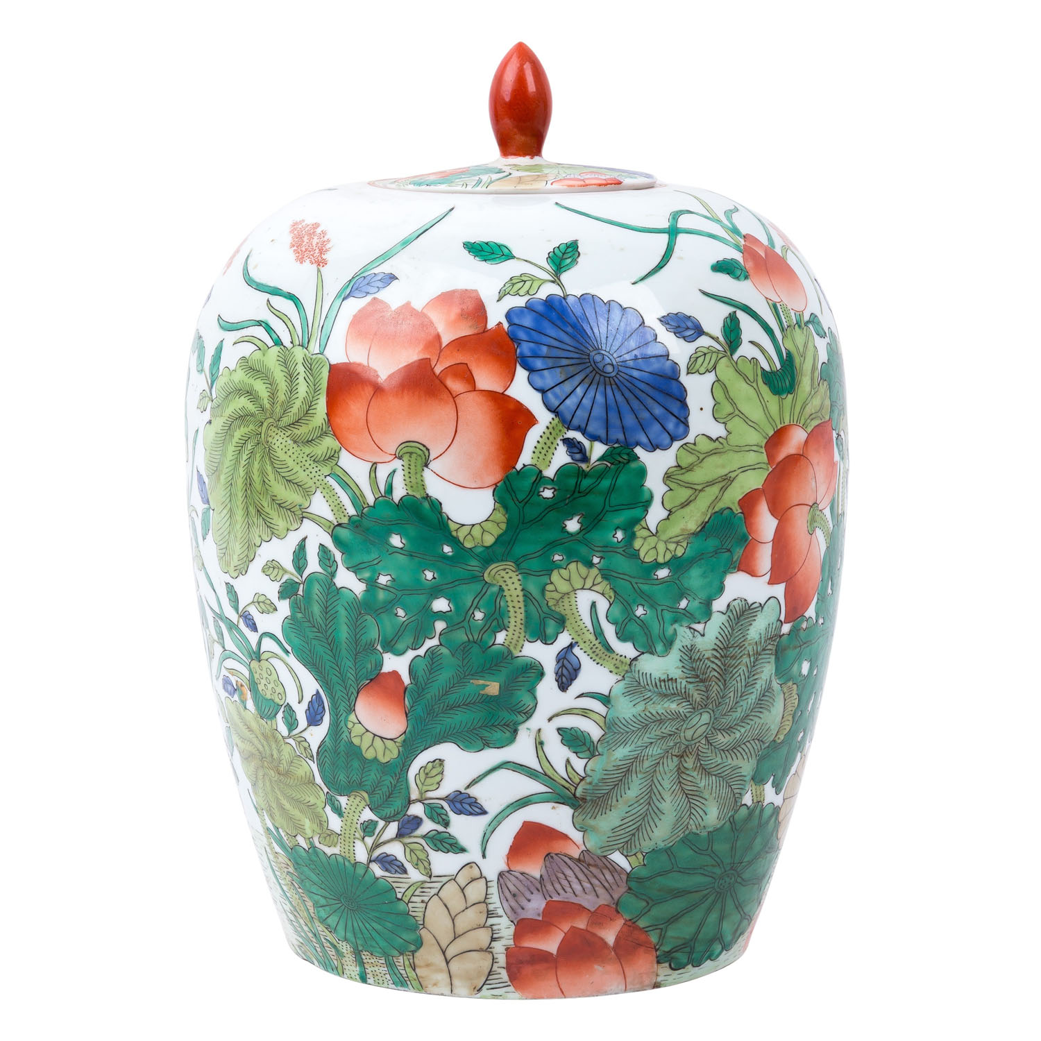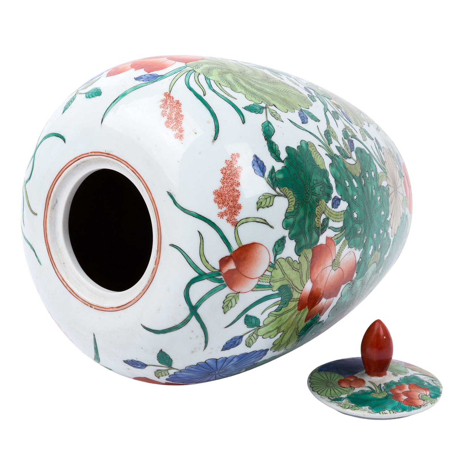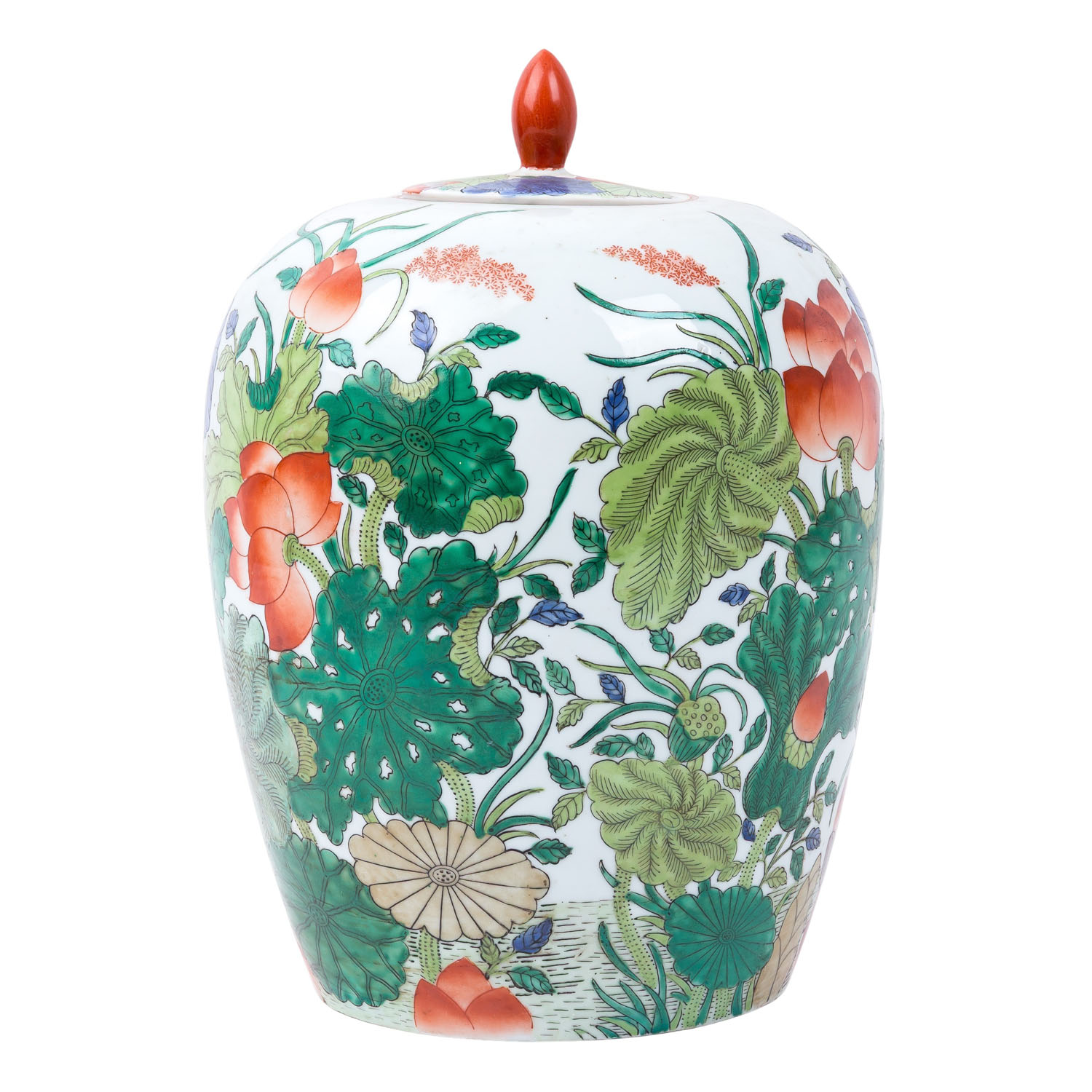 Lidded vessel “ginger pot,” CHINA, 20th century, decorated with water lily painting, H: 33 cm, damaged.