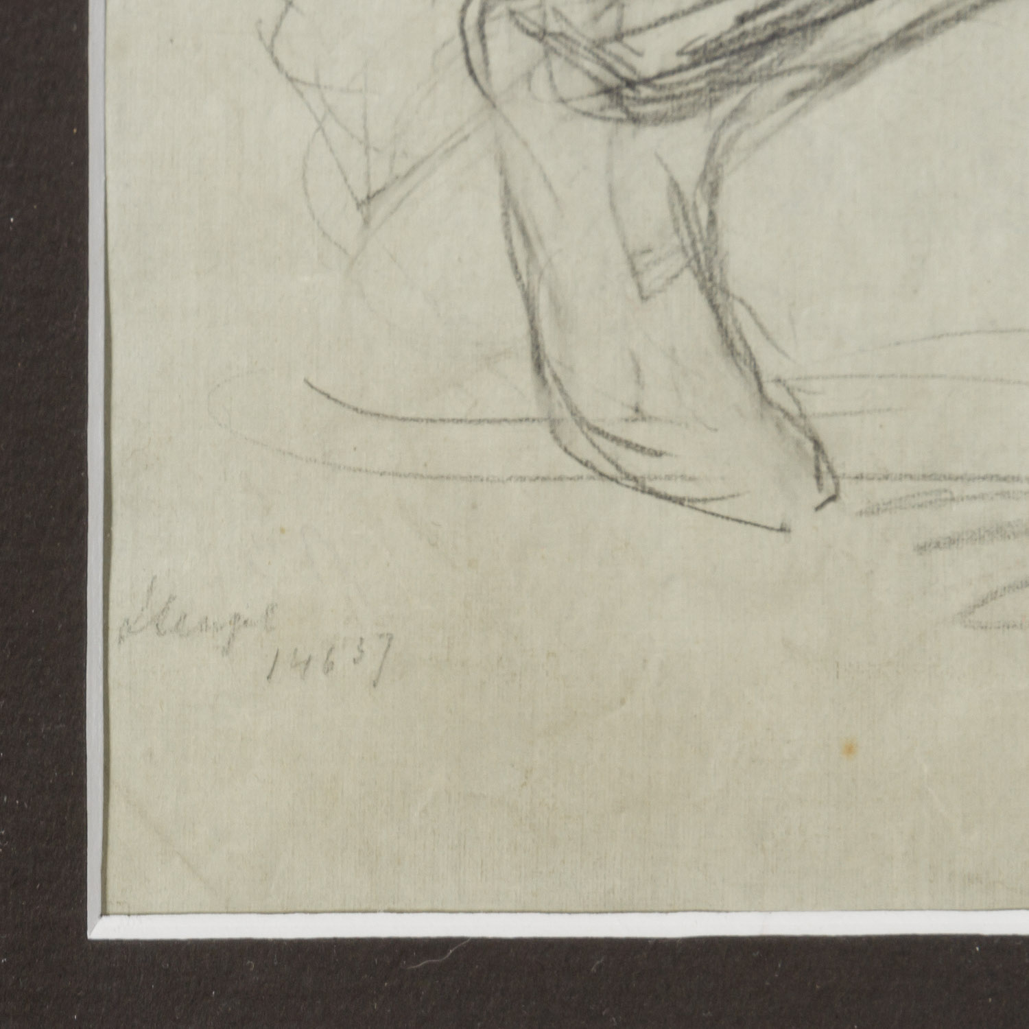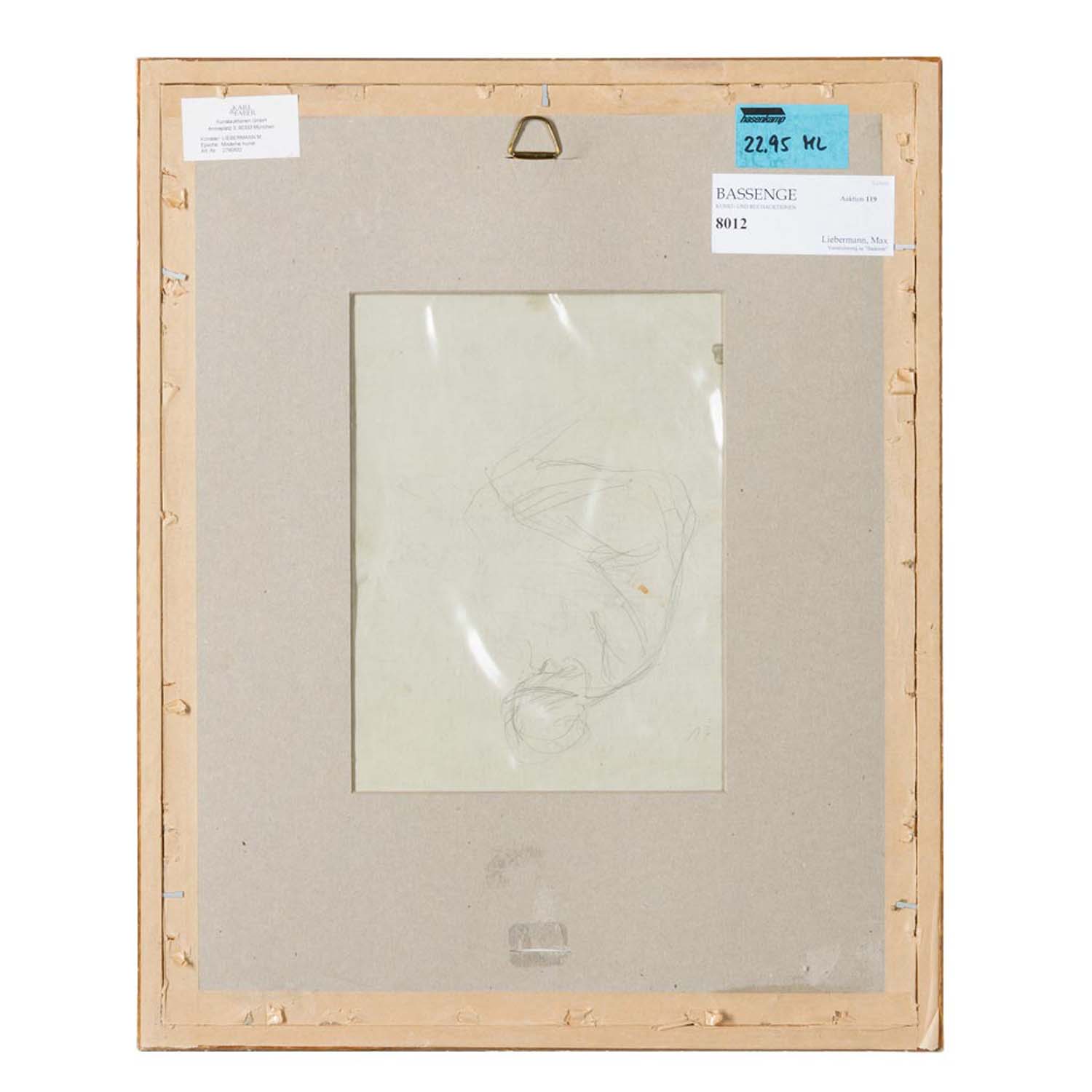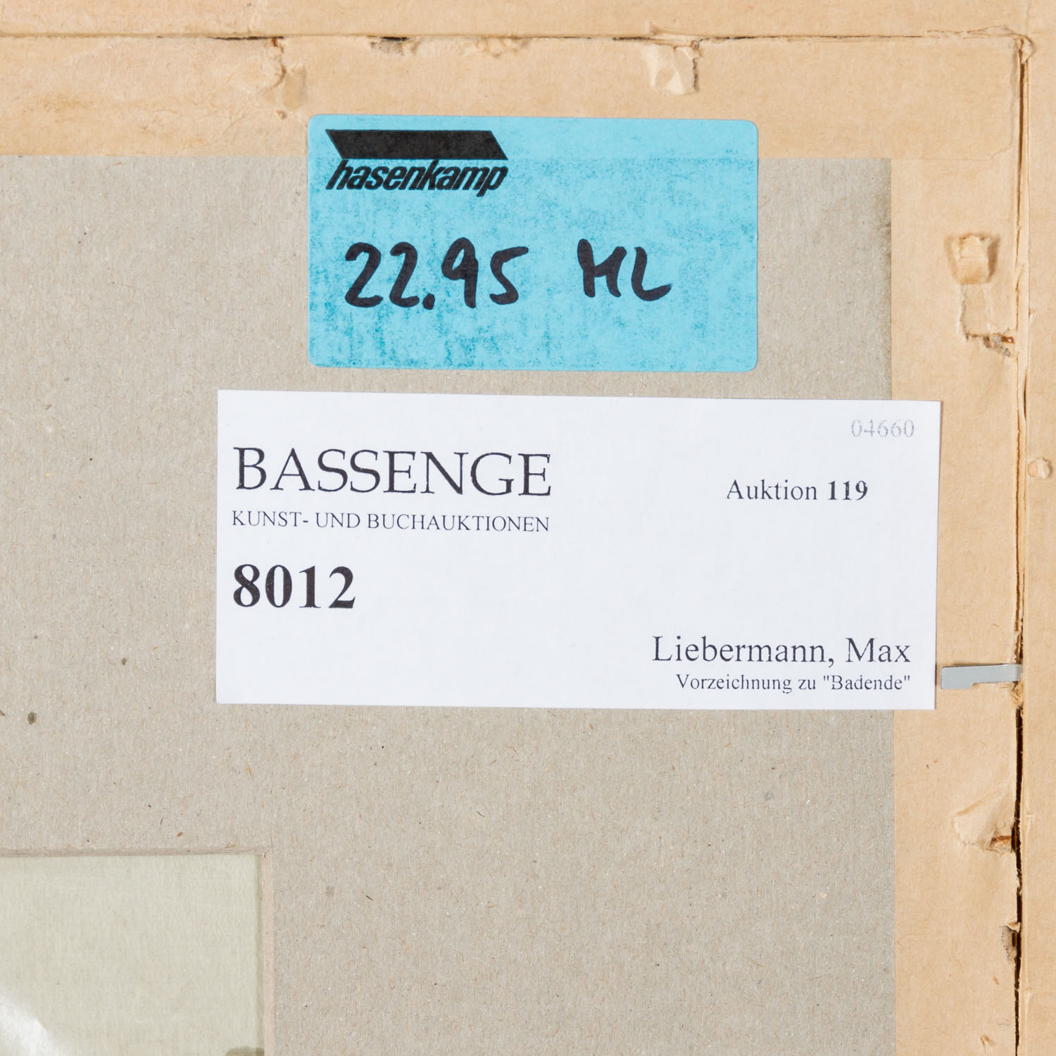 LIEBERMANN, MAX (1847-1935), preparatory drawing for 'Badende', pencil/light green paper, indistinctly inscribed lower left (Stengel 14637 ?), verso pencil study of a seated woman, c. 1926, HxW: mat opening c. 27x21 cm (outer frame dimensions c. 53x43 cm). Signs of age, slightly browned, creases, part. Stains, repaired tear in margin. Framed behind glass in passepartout, verso passepartout cut-out with foil. VERSO labels: Kunstauktionen Karl & Faber, Munich and Bassenge, auction 119. PROVENANCE: Bassenge Kunst- und Buchauktionen, Berlin, auction 4.6.2022.