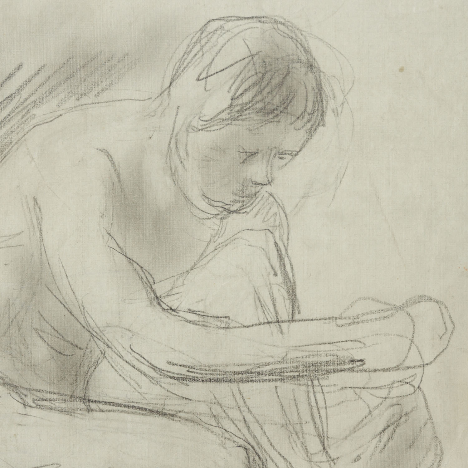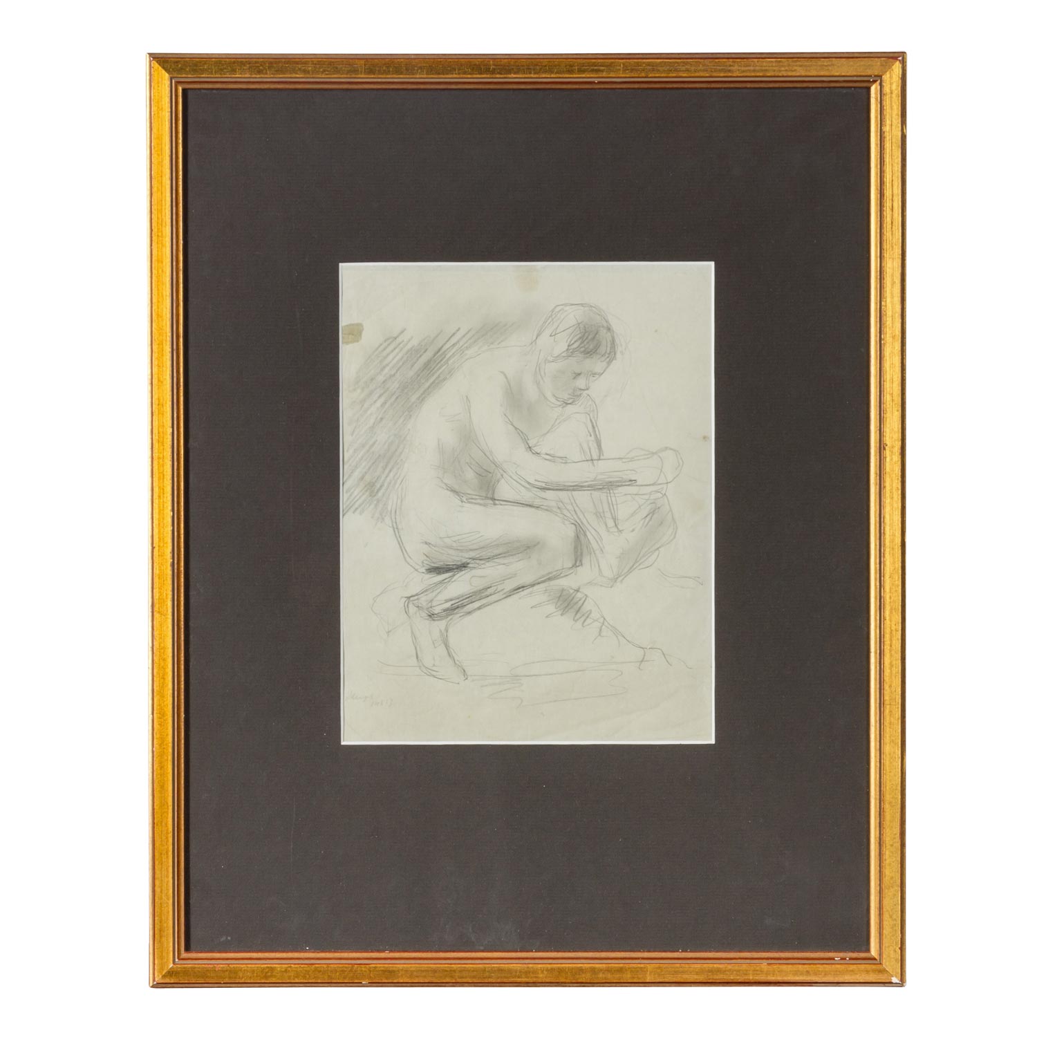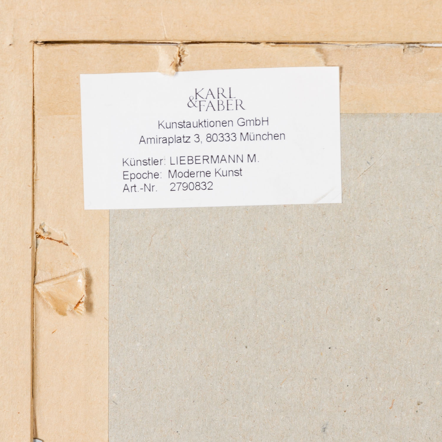 LIEBERMANN, MAX (1847-1935), preparatory drawing for 'Badende', pencil/light green paper, indistinctly inscribed lower left (Stengel 14637 ?), verso pencil study of a seated woman, c. 1926, HxW: mat opening c. 27x21 cm (outer frame dimensions c. 53x43 cm). Signs of age, slightly browned, creases, part. Stains, repaired tear in margin. Framed behind glass in passepartout, verso passepartout cut-out with foil. VERSO labels: Kunstauktionen Karl & Faber, Munich and Bassenge, auction 119. PROVENANCE: Bassenge Kunst- und Buchauktionen, Berlin, auction 4.6.2022.