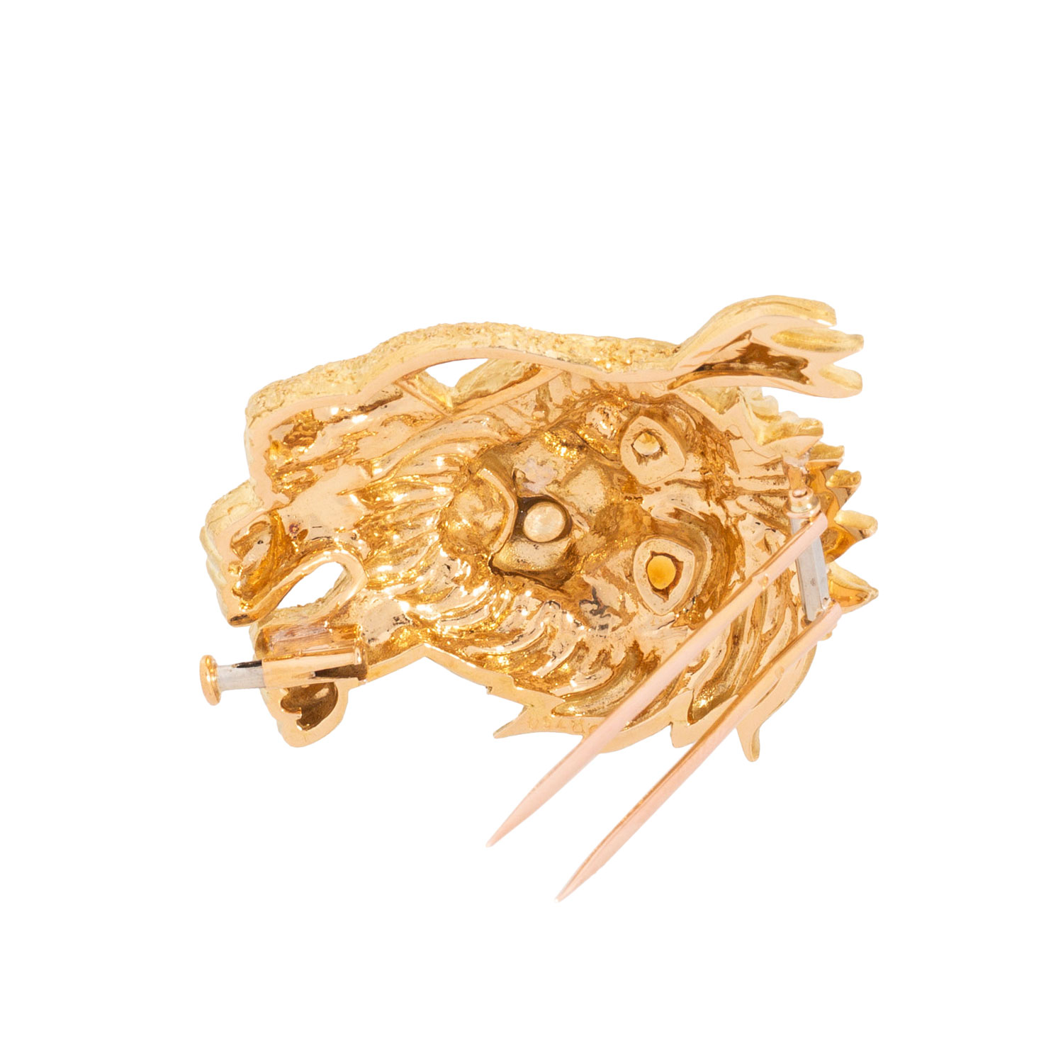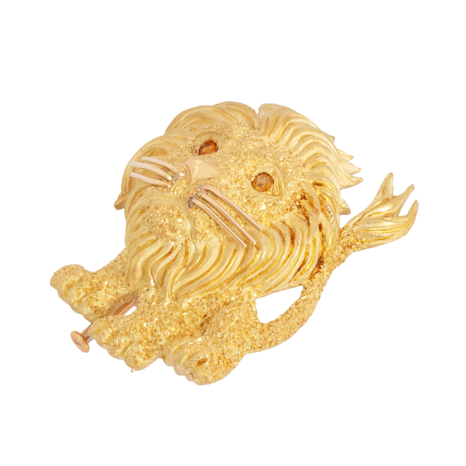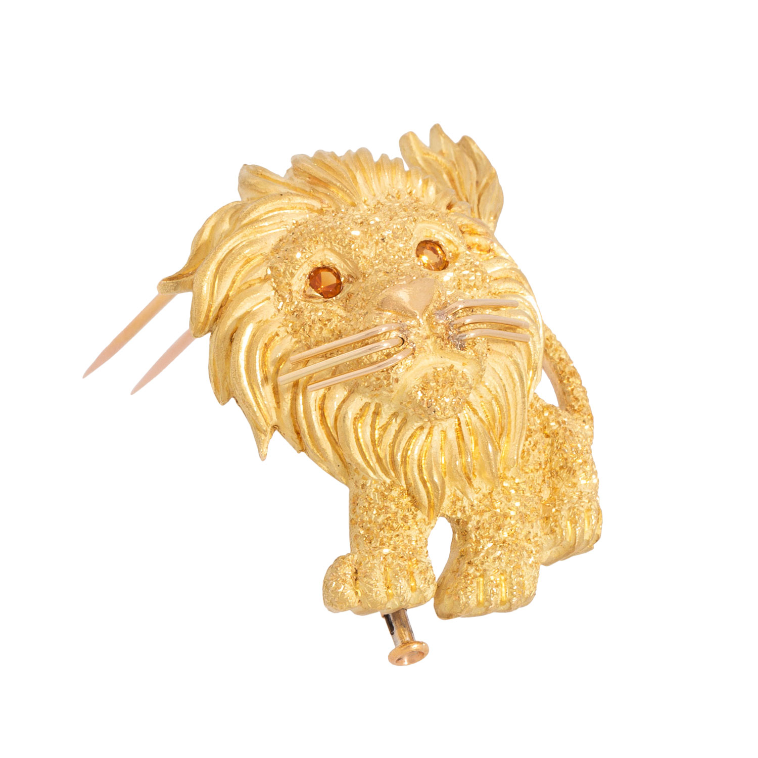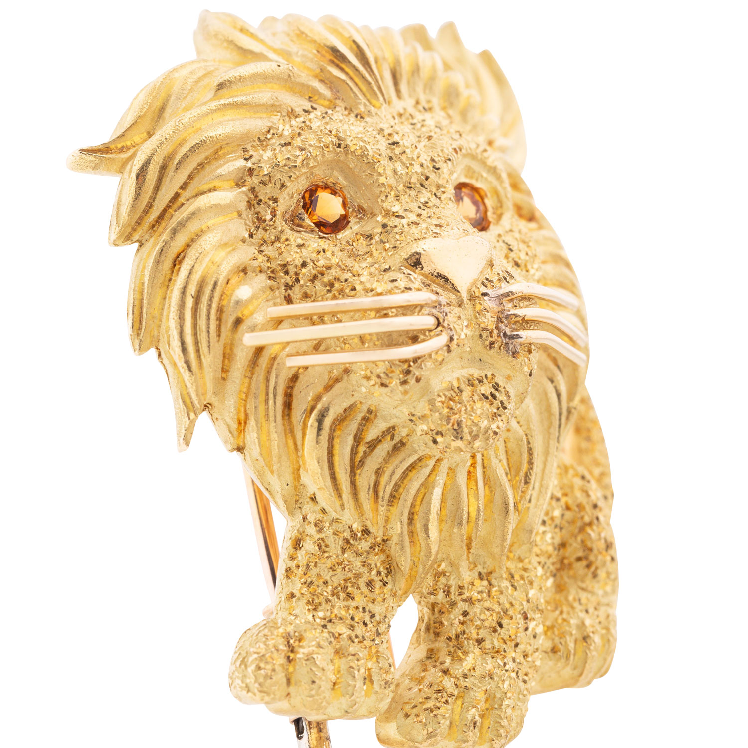 Brooch 'Lion' with eyes of round faceted yellow gemstones, prob. citrine, 18K yellow gold, 22.7 g, 4x3 cm, nice depiction with elaborately structured surface, late 20th century, good condition.