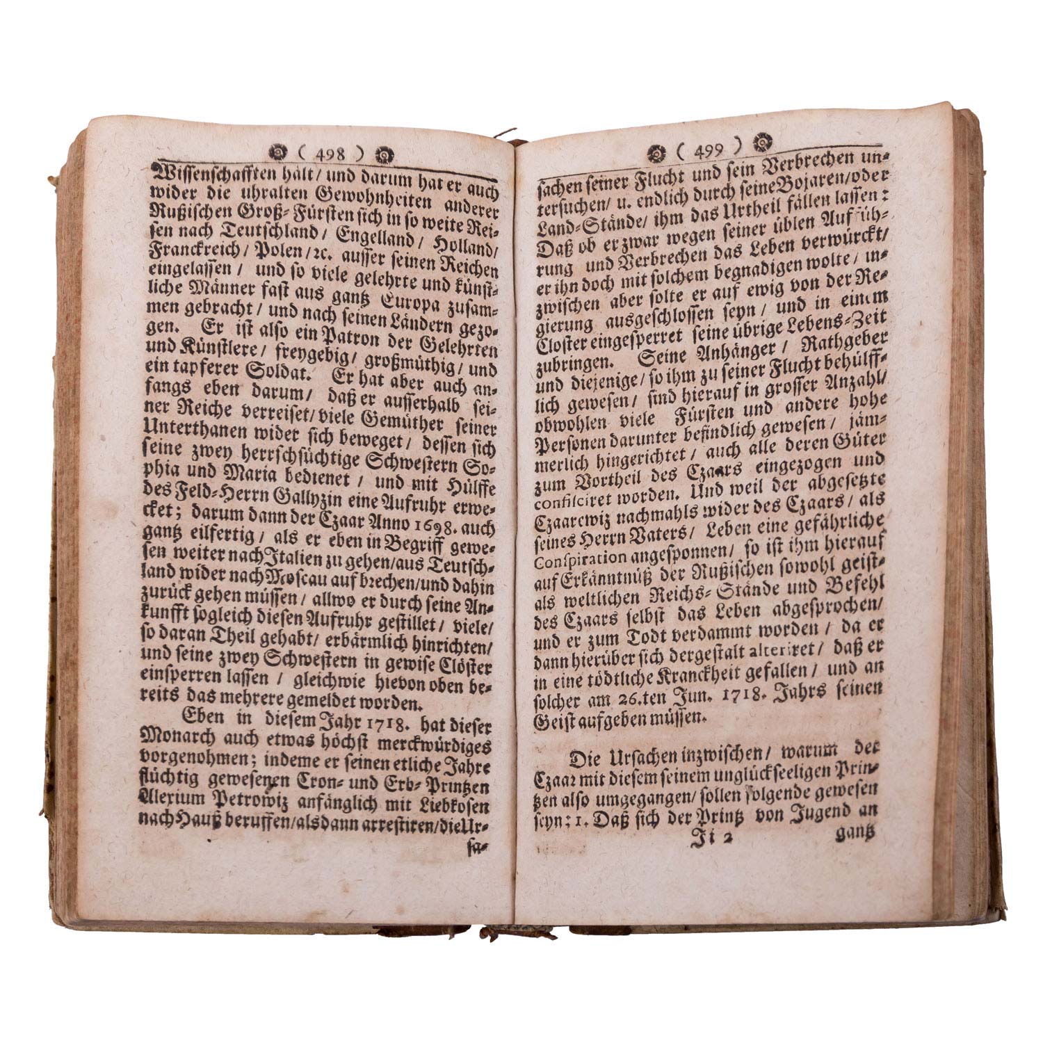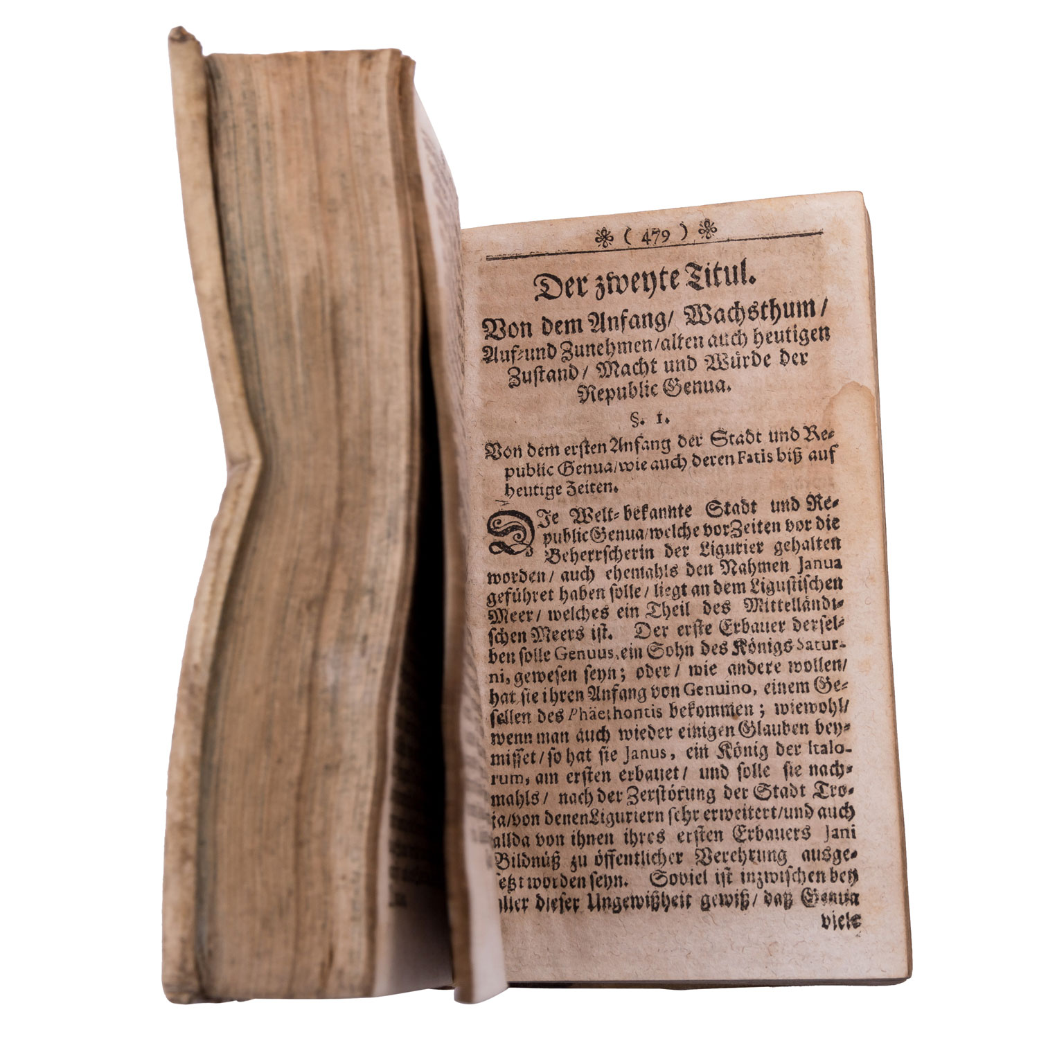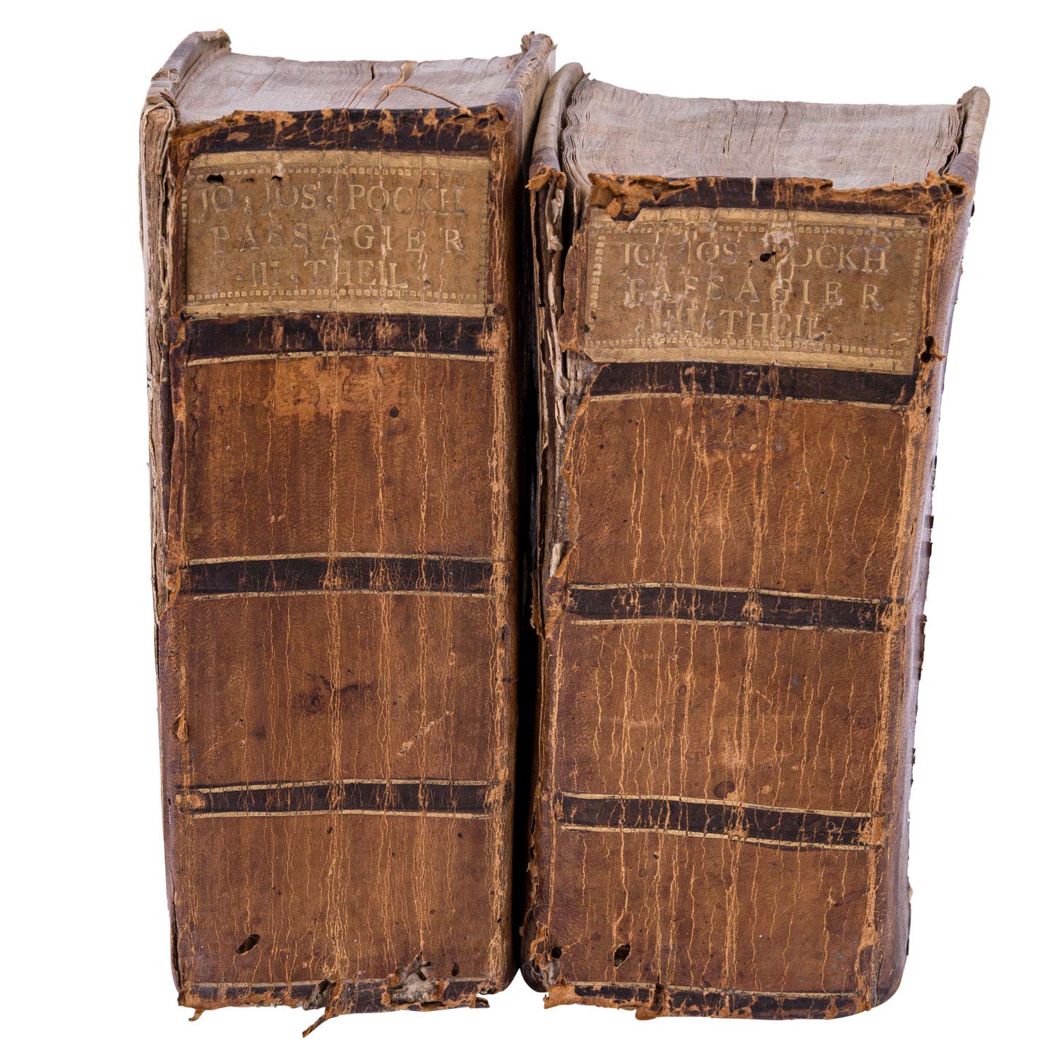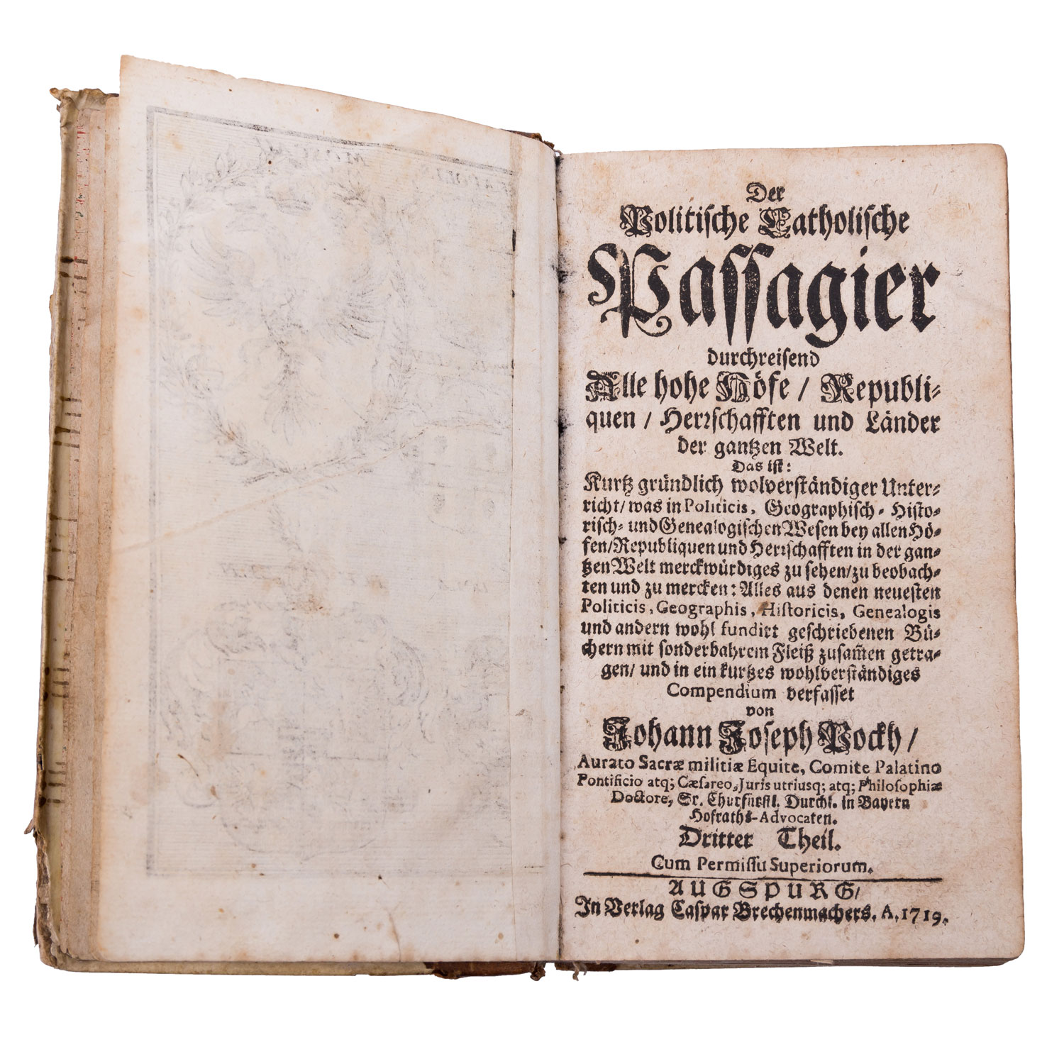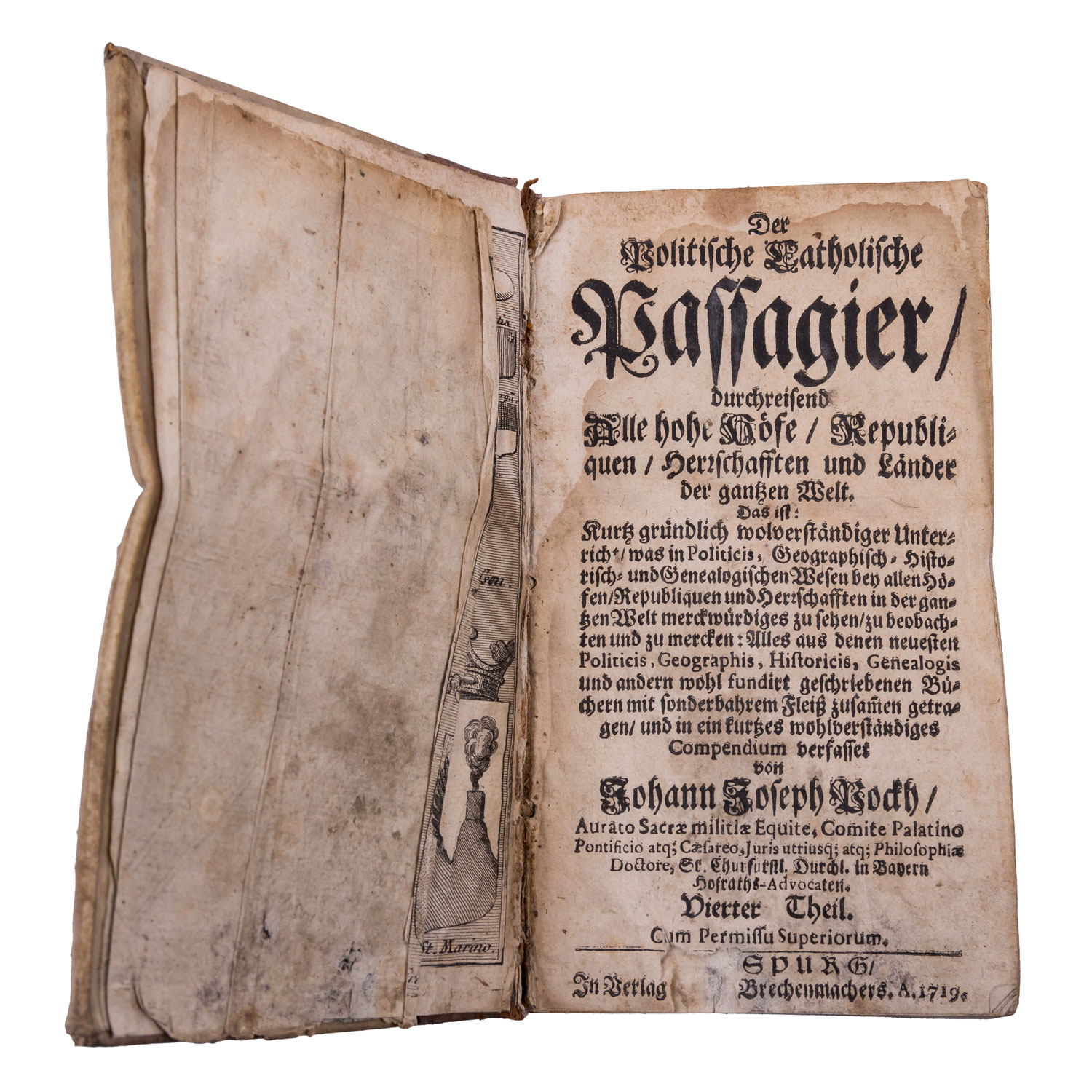 Literature, Germany 18th century - Johann Joseph Bockh, 'The political Catholic passenger traveling through all the high courts, republics, dominions and countries of the whole world', 3. and 4. part, Augsburg 1719, publisher Caspar Brechenmacher. Not collated. Significant signs of age and use on both volumes, discoloration, creases, stains, tears, covers with incisions, stamps, handwritten notes.