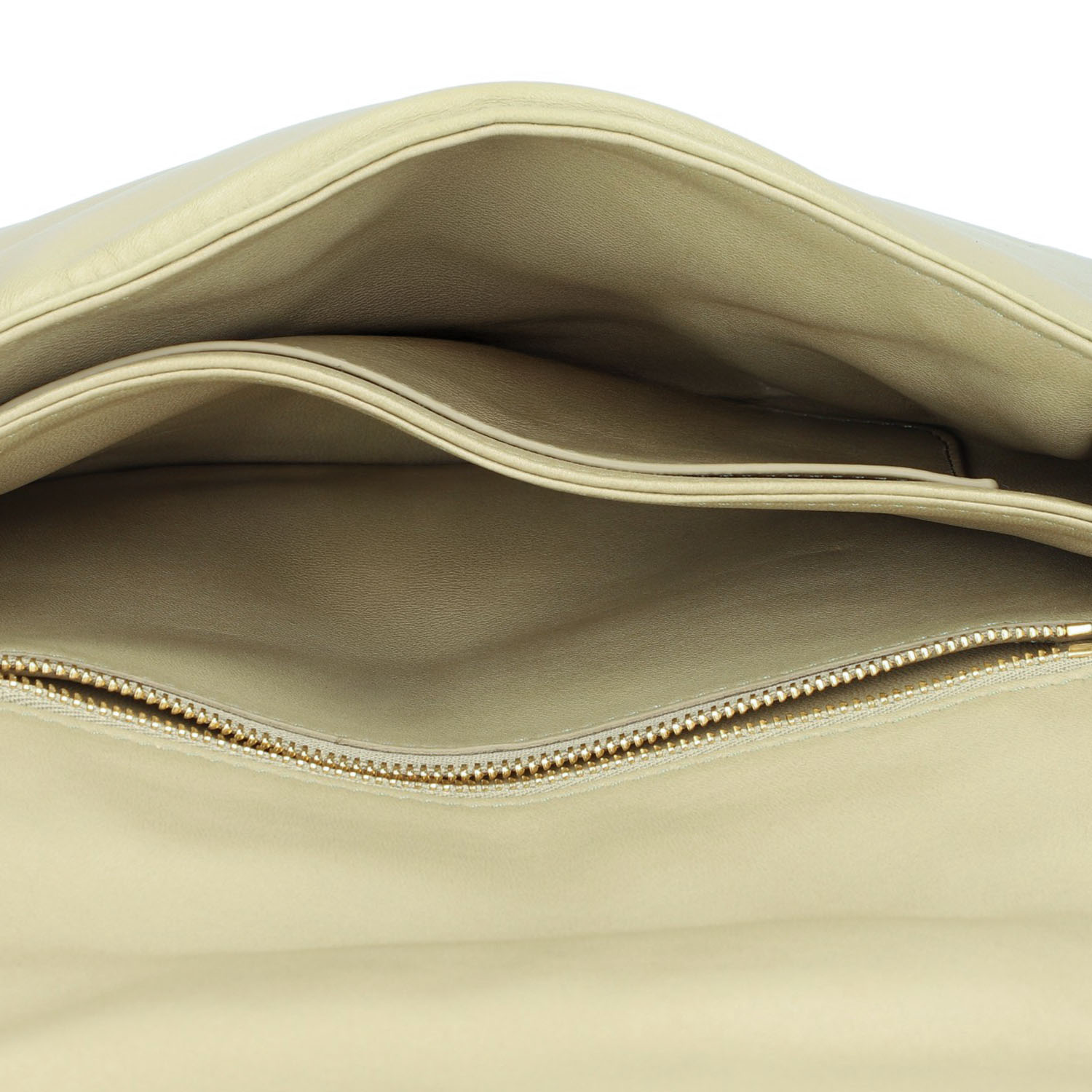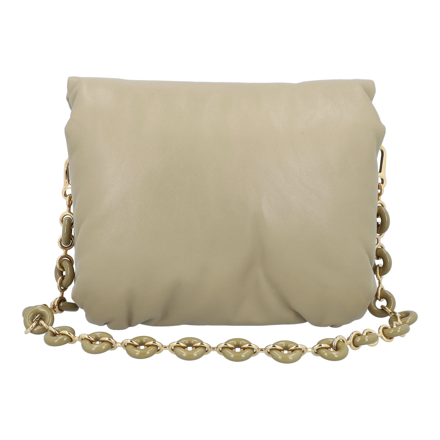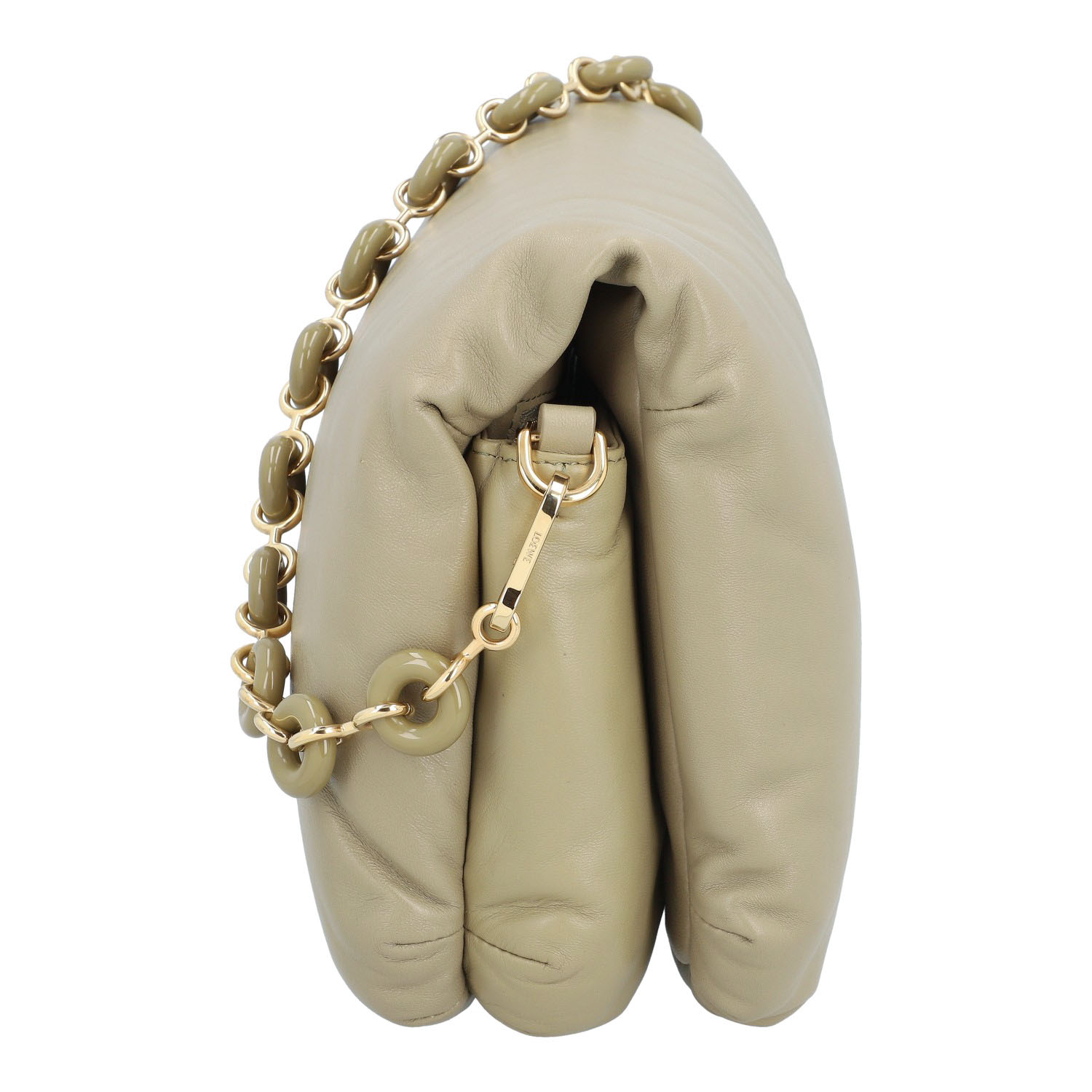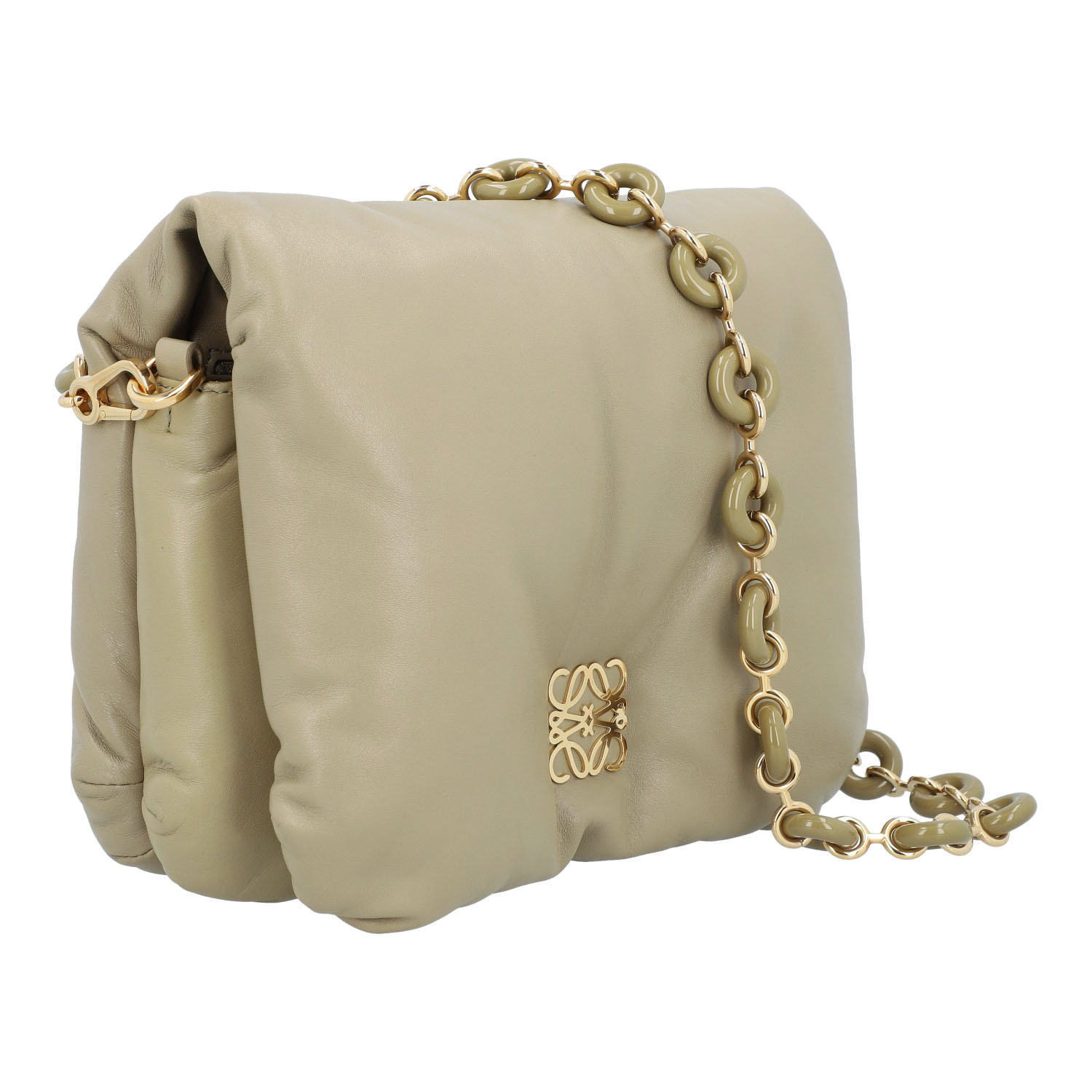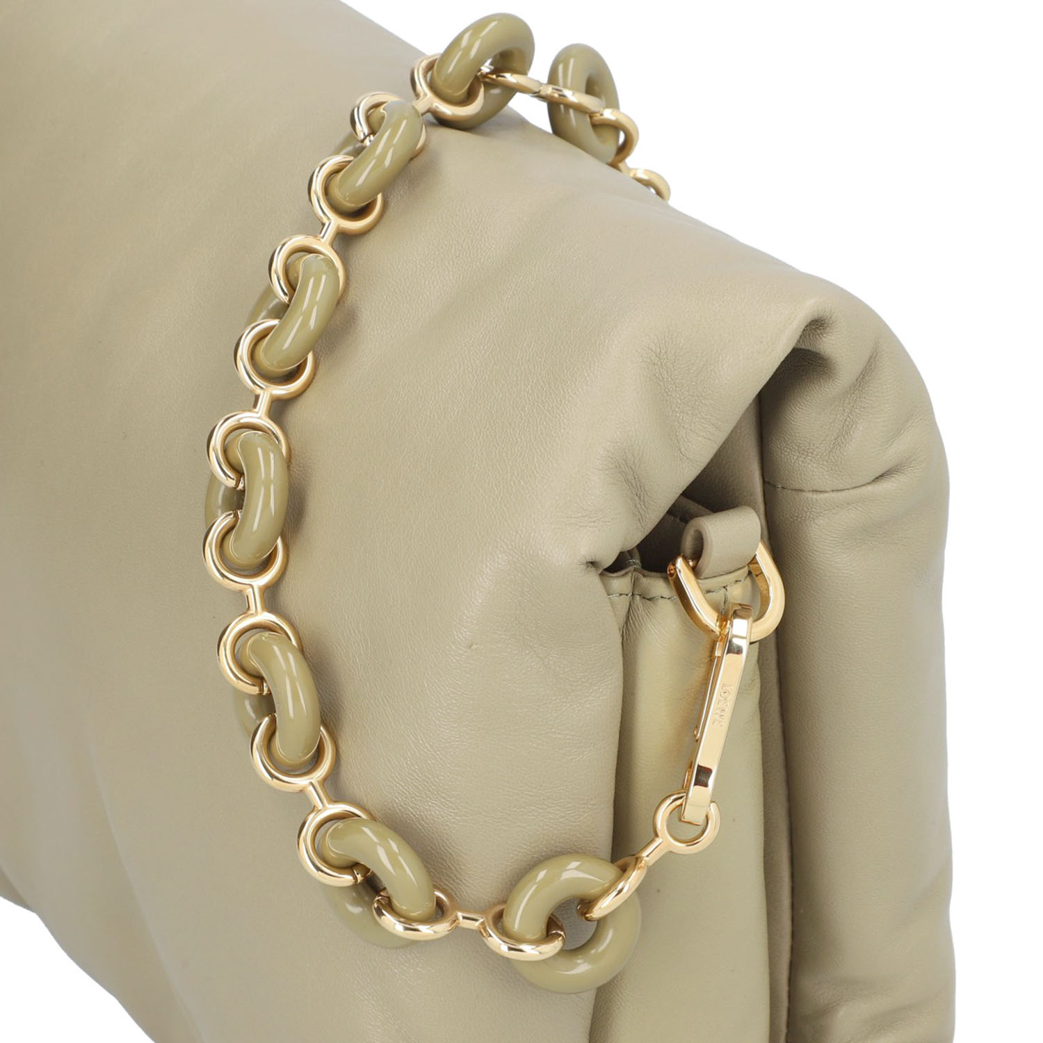 LOEWE shoulder bag 'GOYA PUFFER', retail price: approx. 2.000,-€. Sage-coloured lambskin leather with gold-coloured hardware, logo on the flap and decorative, removable chain shoulder strap. Interior with two compartments and two pockets, one with a zip. Good condition. 24 x 9 x 18 cm.
