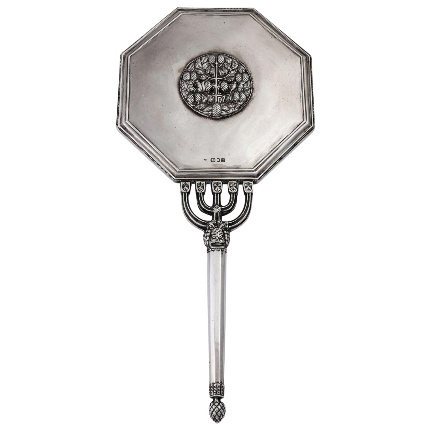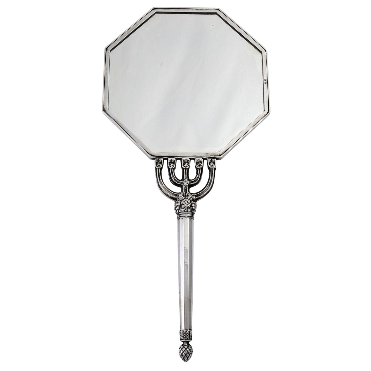 LONDON hand mirror with 925 silver mount, 1927. THE ARTIFICER'S GUILD LTD., mirror in octagonal frame, at the back side profiled framed, in the middle the relief depiction of a tree of life with a squirrel and a bird, 5 curved arms connect the mirror with the faceted handle, tapering down and ending in a pine cone, l. approx. 34.5cm. Signs of age and use.