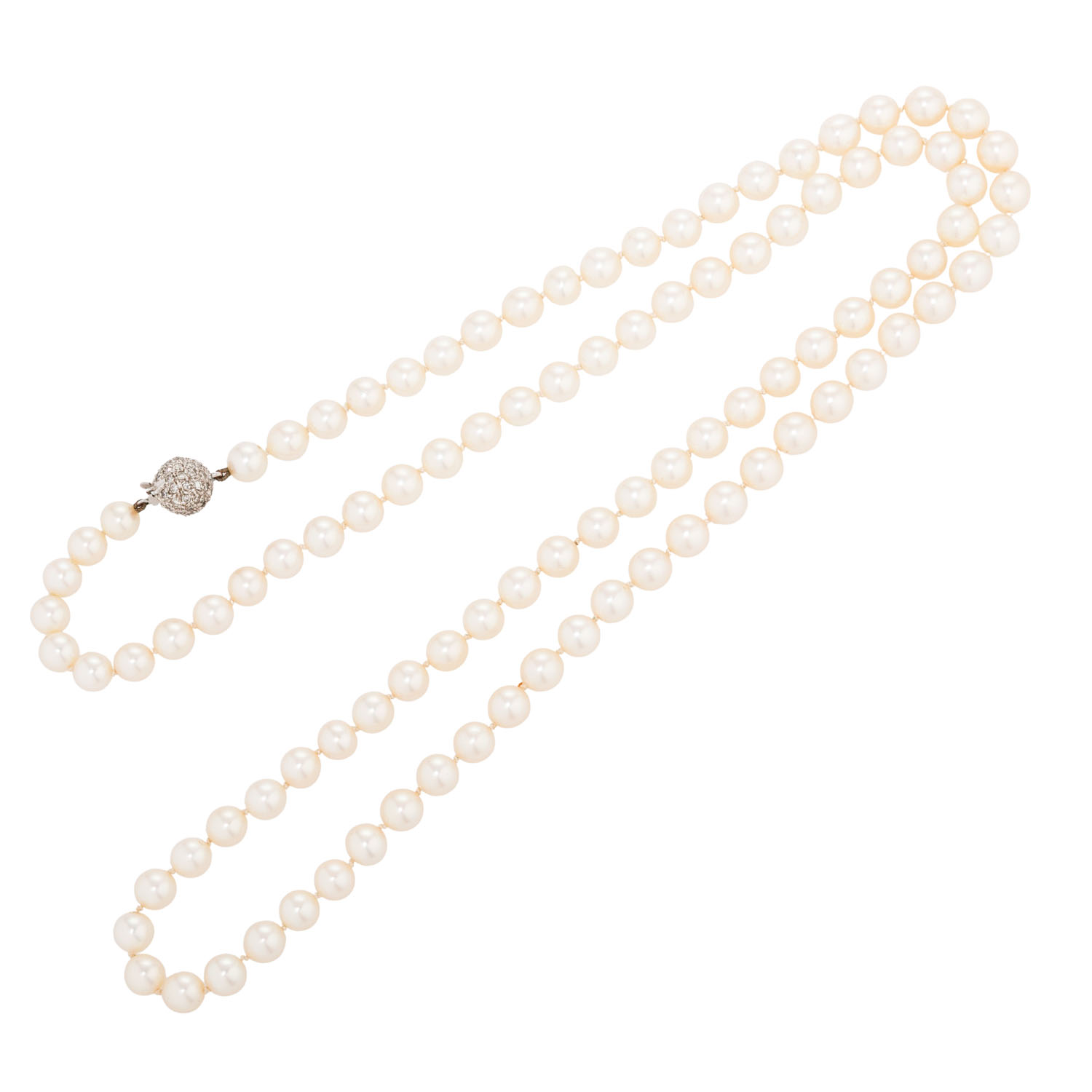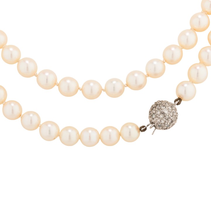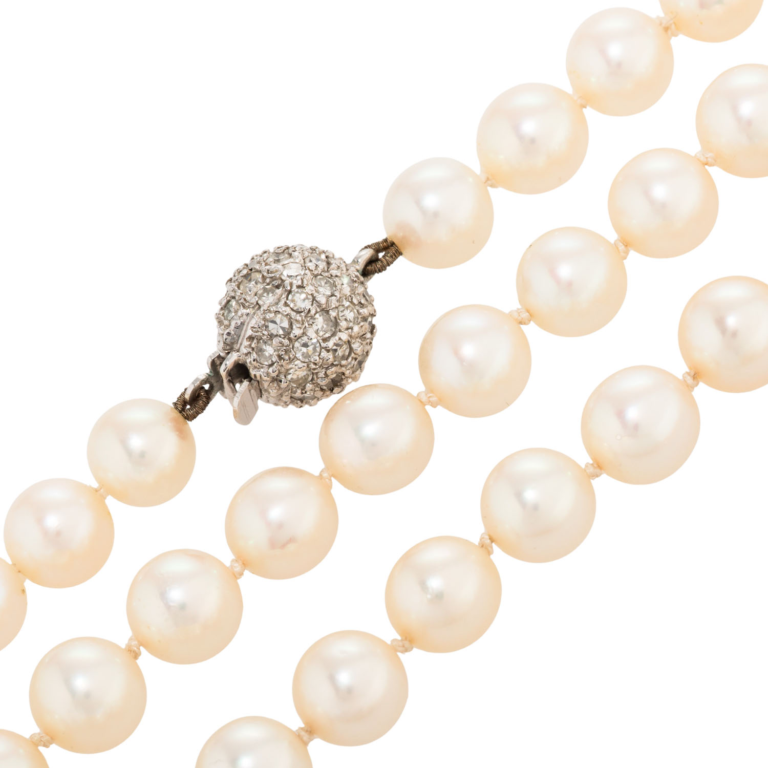Long necklace from Akoya cultured pearls 7 mm, good lustre, L: 80 cm, clasp of 14K white gold, with diamonds, 2nd half of 20th century, good condition.