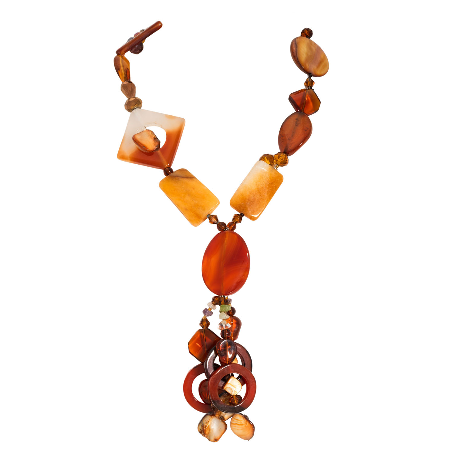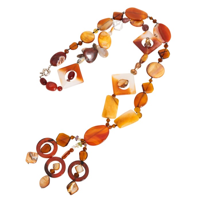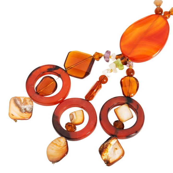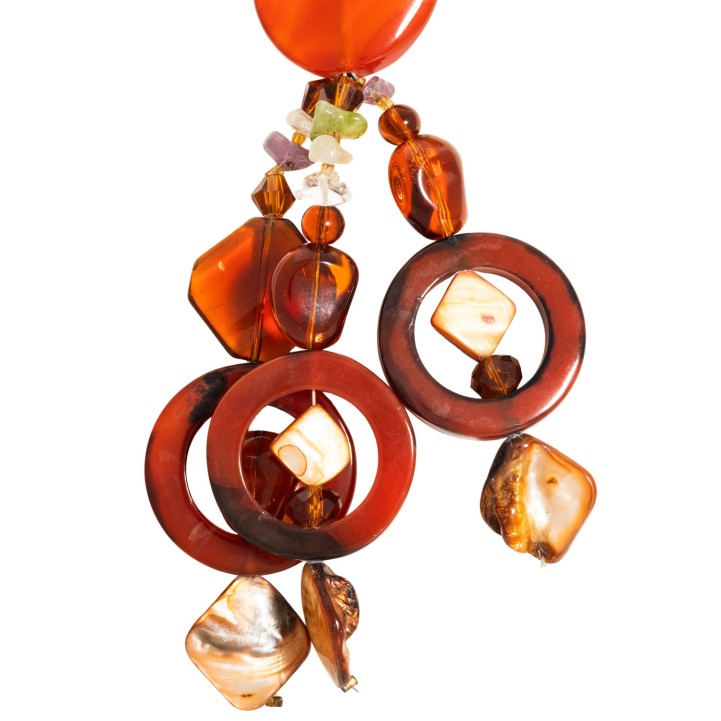 Long stone necklace adorned with agate, jasper, mother-of-pearl, and partially imitation or dyed stones, ca. 238.2 g, L: ca. 95 cm, 20th/21st century, signs of wear.