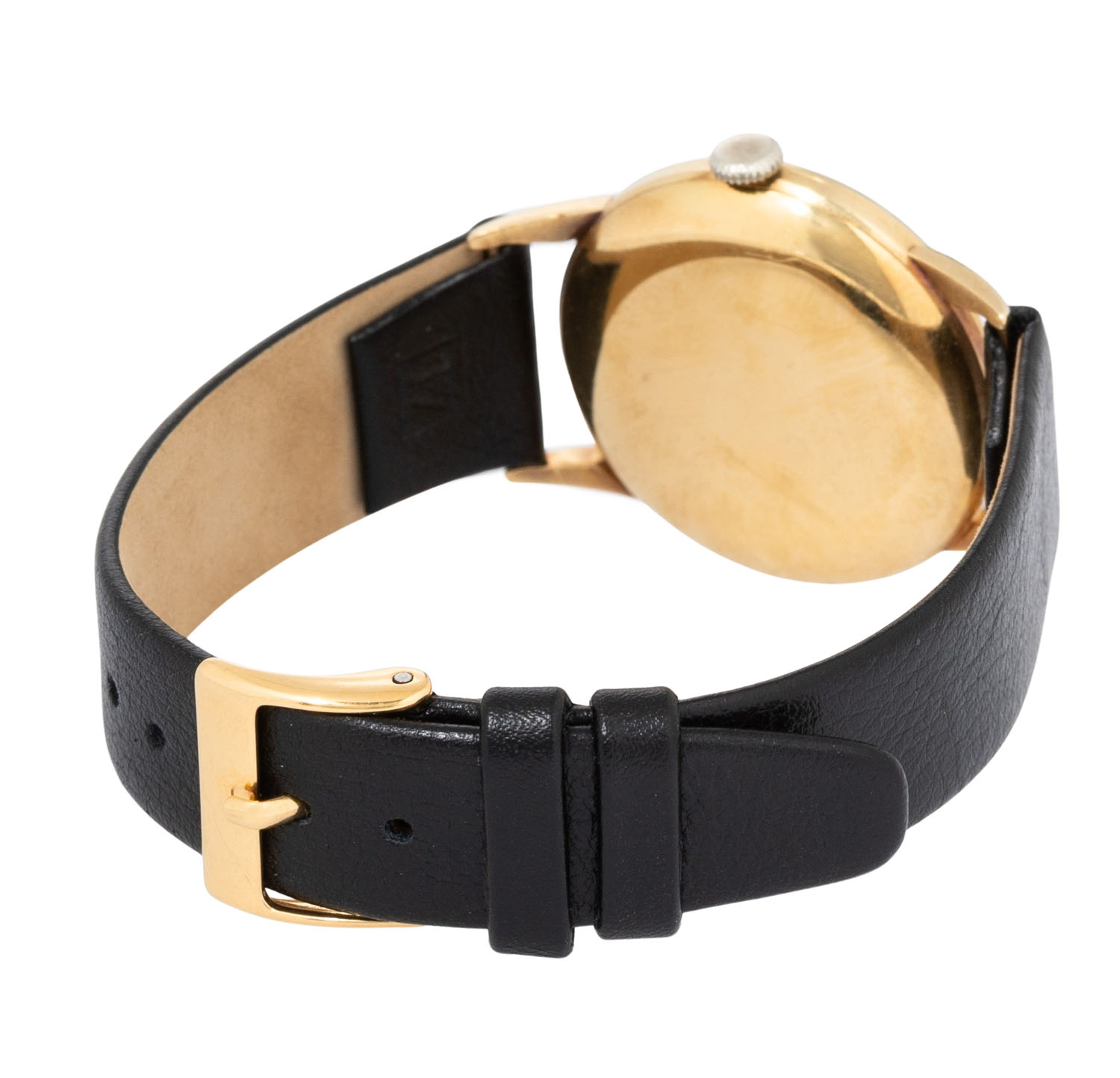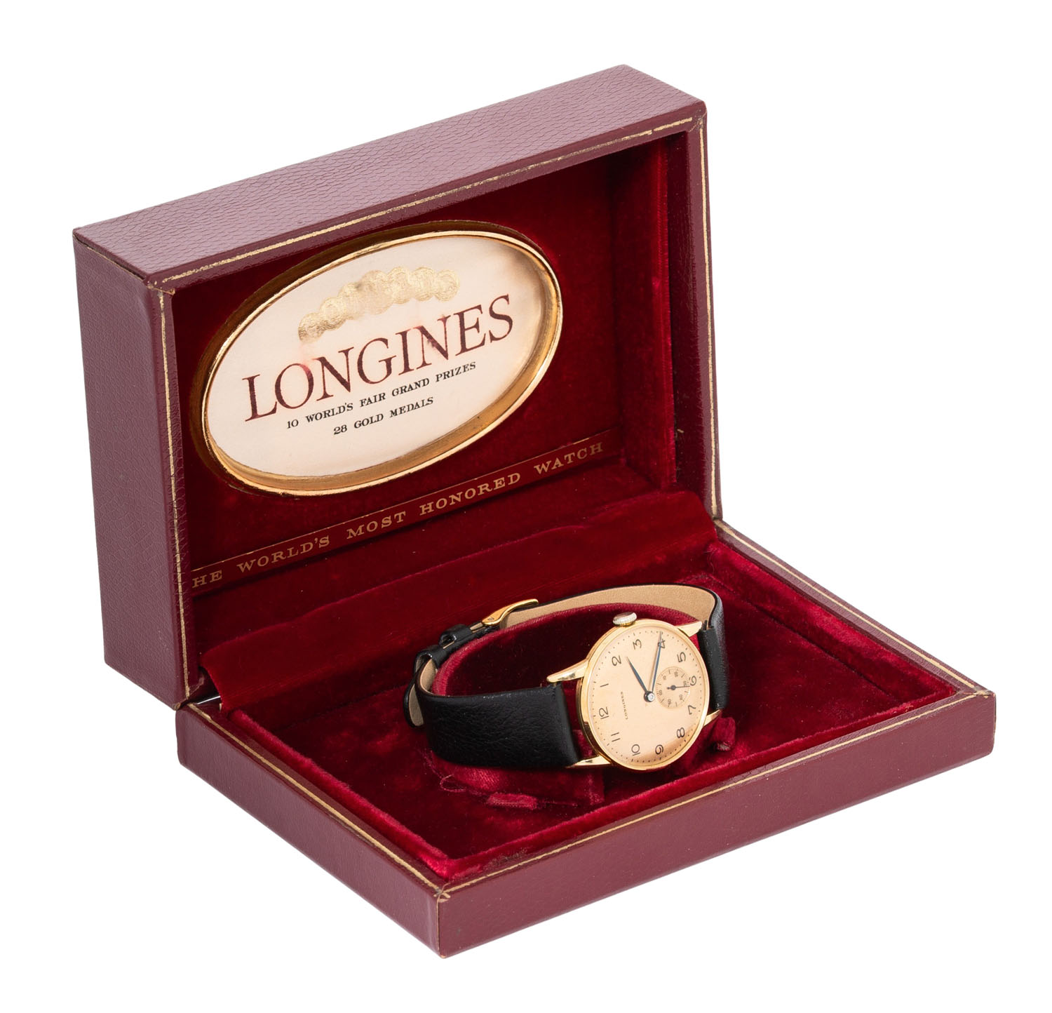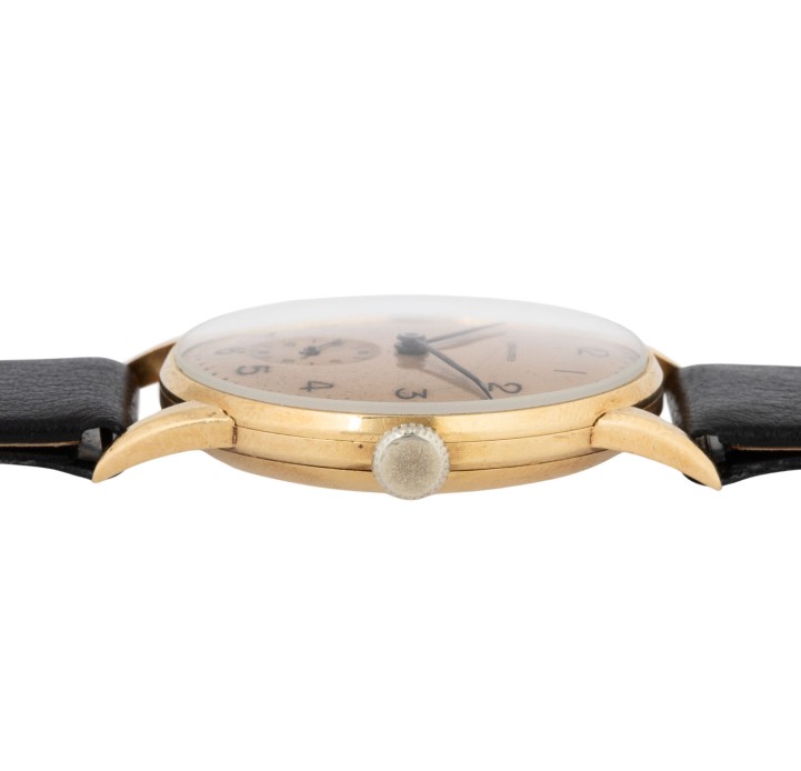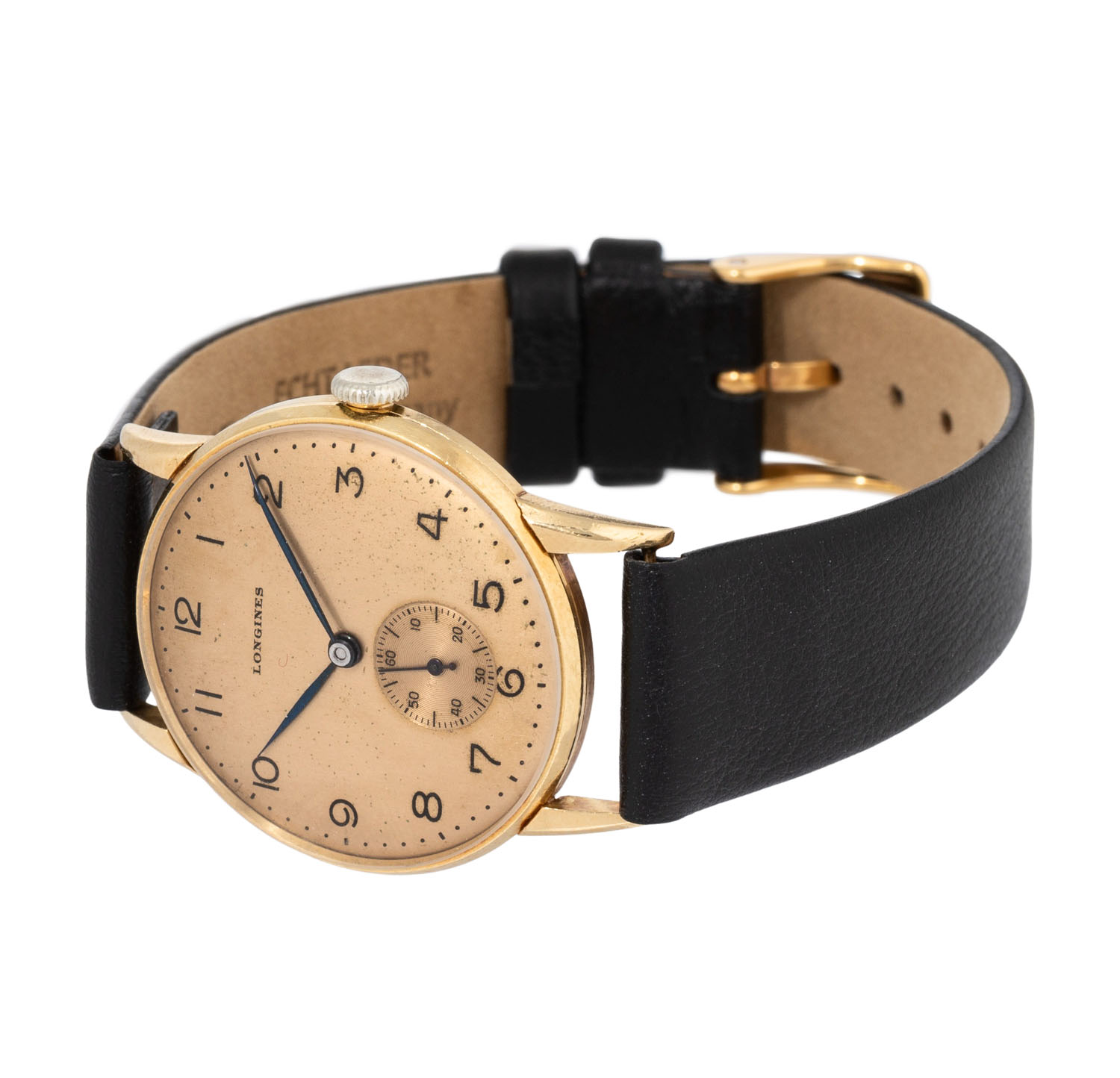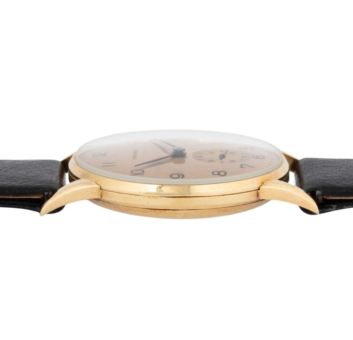 LONGINES attractive Vintage men's wristwatch, approx. from the 40s, coming with the presentation box. 18K yellow gold, case stamped “124” & “5727”. Manually wound movement cal. 23.O with good working order (+7 s/d, 302° amplitude). Champagne-colored dial with Arabic numerals and sunken small seconds, blued hands. New black leather strap with gold-plated buckle. Used condition with signs of wear, dial with slight oxidation marks. Diameter approx. 31.5 mm measured without crown.