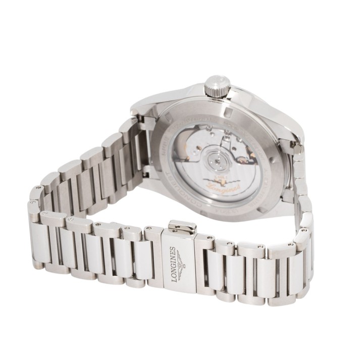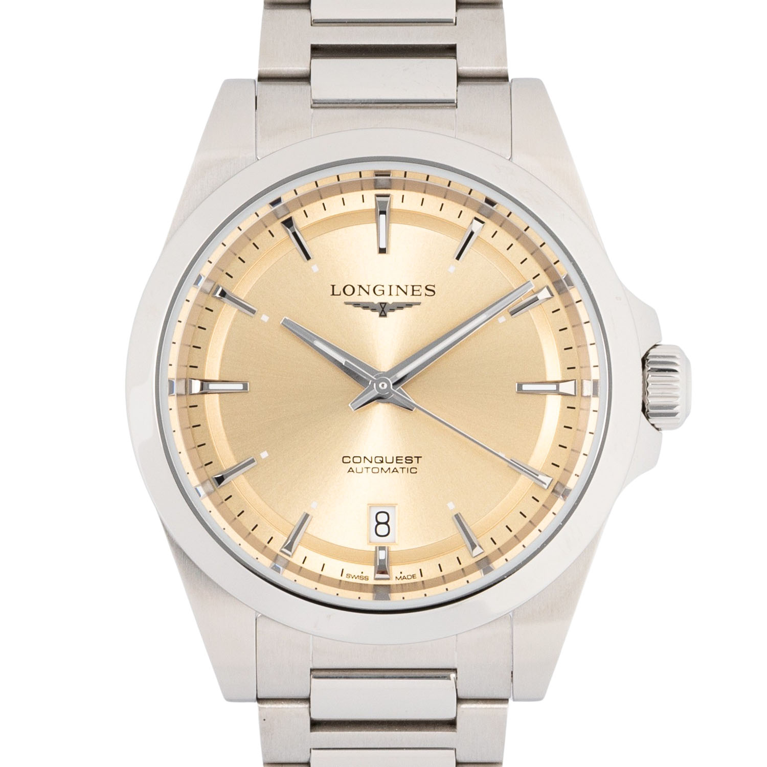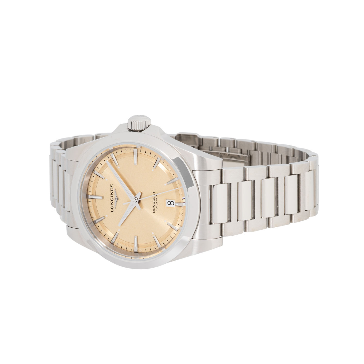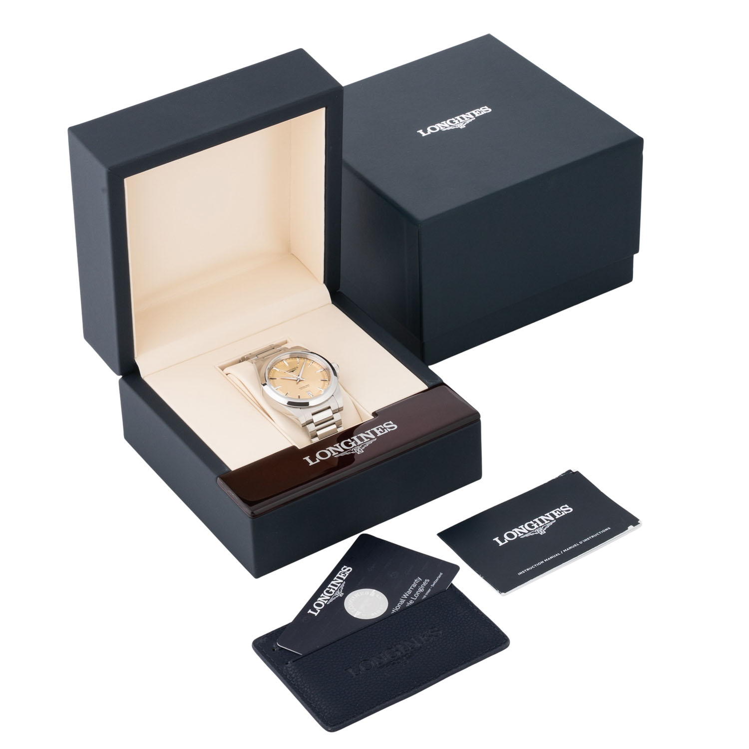 LONGINES Conquest Ref L3.720.4.62.6 Men's Chronograph from 2024. Box and papers. Stainless steel. Glass back. Serial number 56898910. Automatic movement calibre L888 with very good performance (+5 s/d. 268° amplitude). Gold-coloured dial with sunburst finish, applied indices and date display at 6 o'clock. Longines stainless steel bracelet with folding clasp. Very good condition with slight signs of wear. Original box, instructions, card folder and warranty card included. Purchased in December 2024 in Germany. Diameter approx. 38 mm (measured without crown). Suitable for wrist sizes up to approx. 19.5 cm.