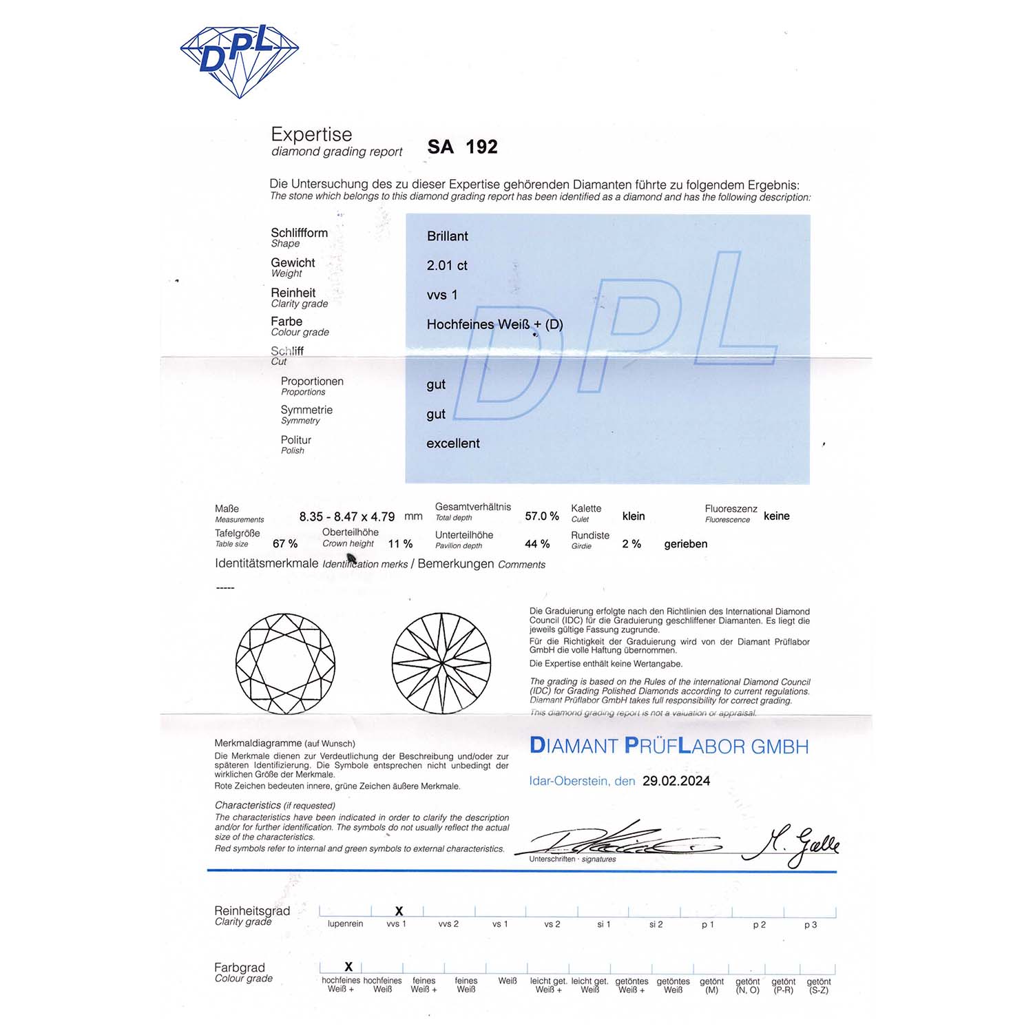 Loose brilliant-cut diamond 2.01 ct, EW+ (D)/VVS1, DPL certificate no.: SA 192 from 02/2024 enclosed.