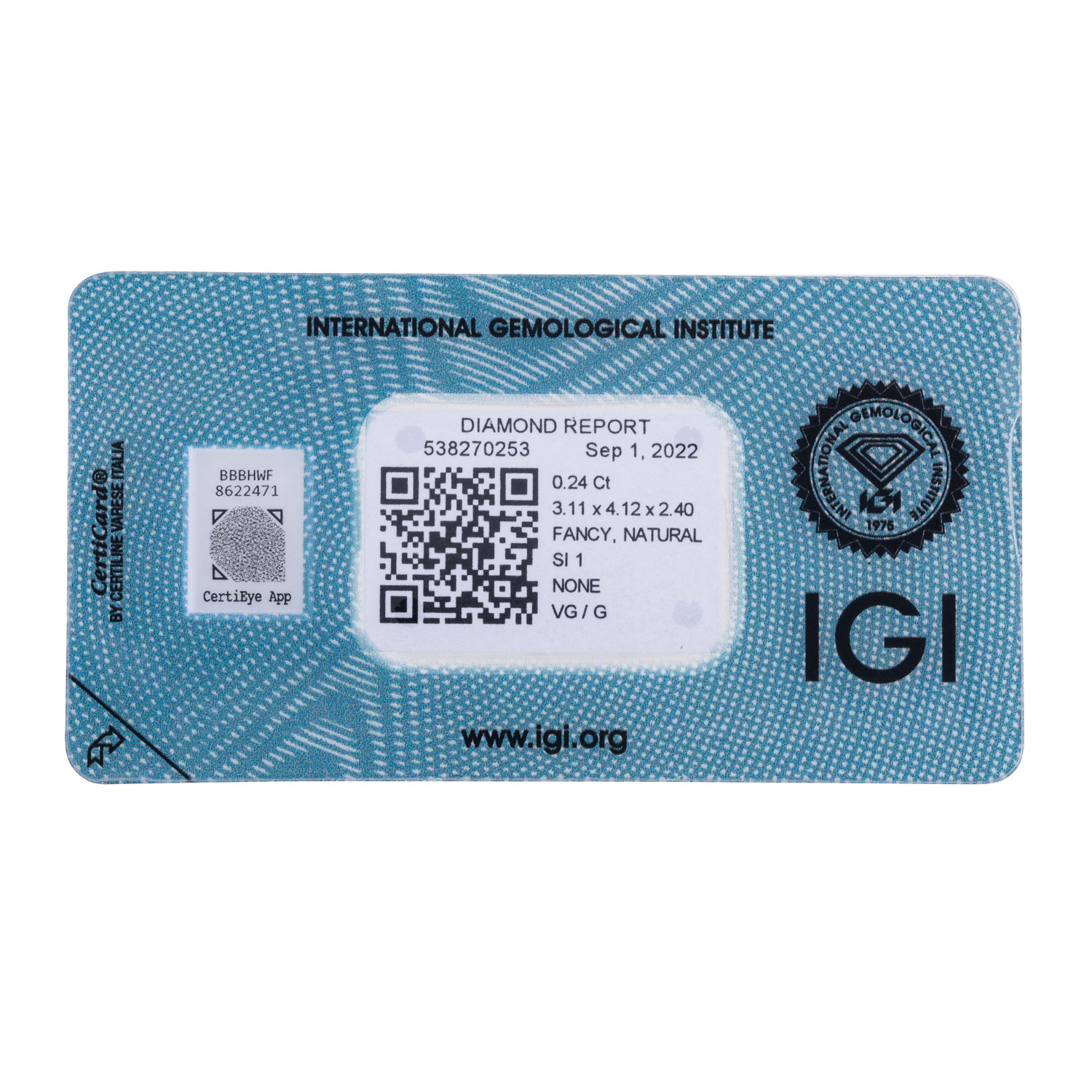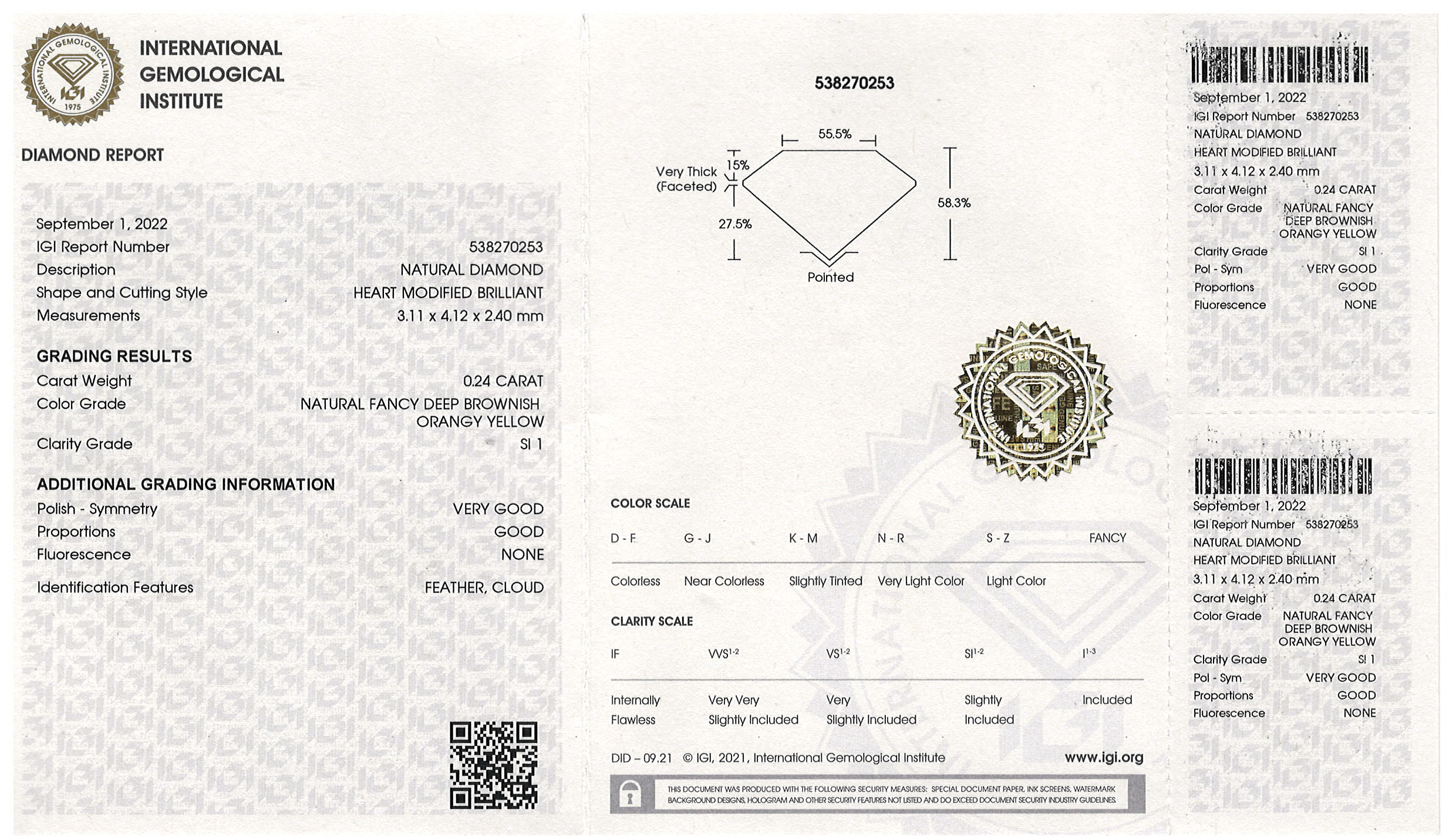 Loose heart-cut diamond 0.24 ct, NFDBOY (natural fancy deep brownish orangy yellow), replacement value ca. 500 €, mint condition, in blister, incl. IGI certificate (2022).