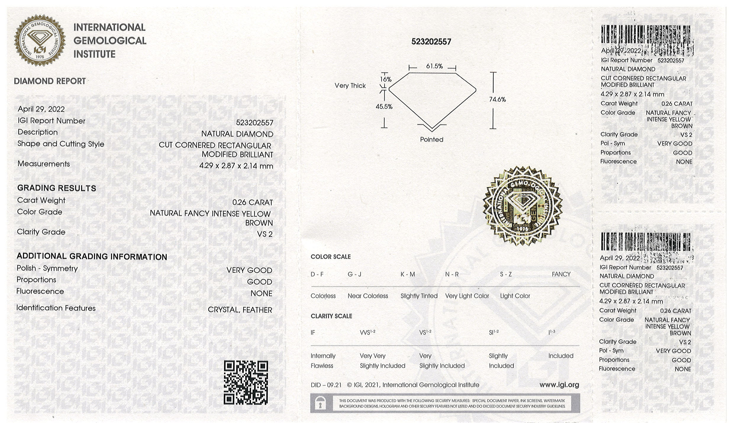 Loose octagonal-cut diamond Natural Fancy Intense Yellow Brown, replacement value ca. 1,300 €, in blister, incl. IGI certificate.