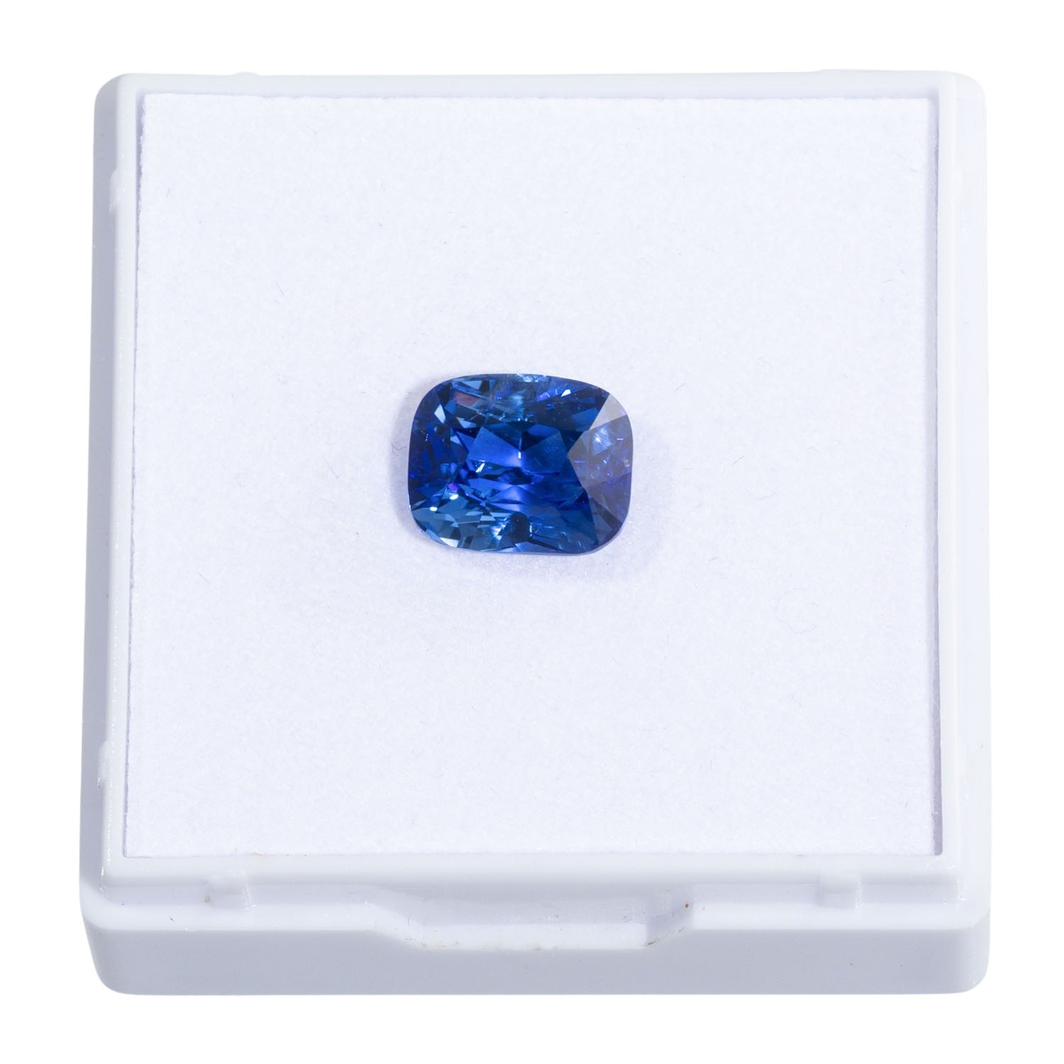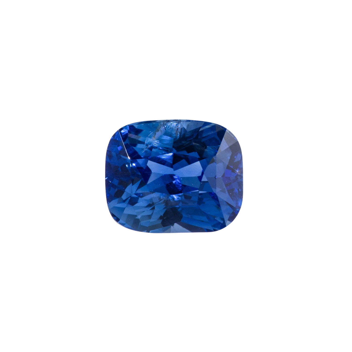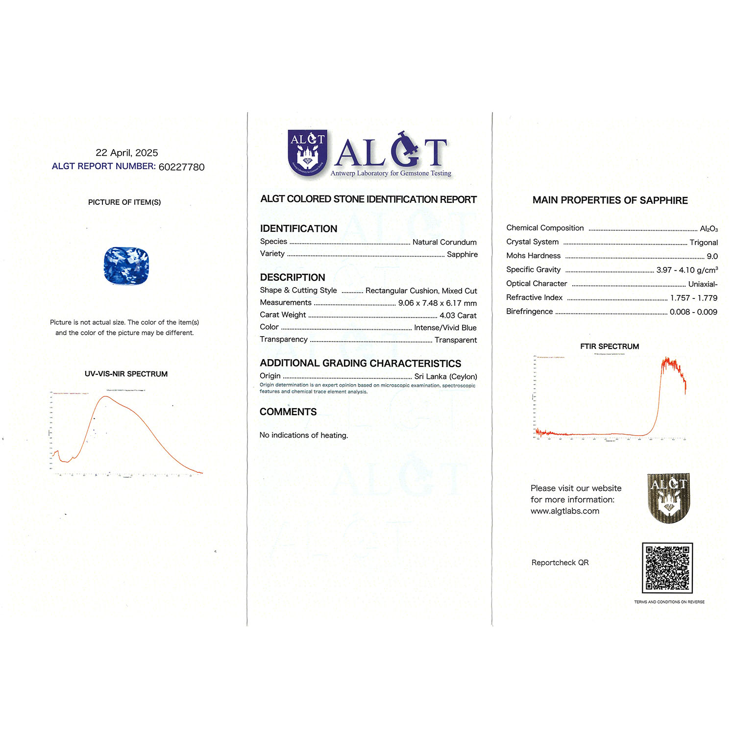 Loose sapphire of 4.03 ct, intense/vivid blue color, mixed cut, cushion, 9.06 x 7.48 x 6.17 mm, no indications of heating, origin: Sri Lanka (Ceylon) with ALGT report (04/2025).