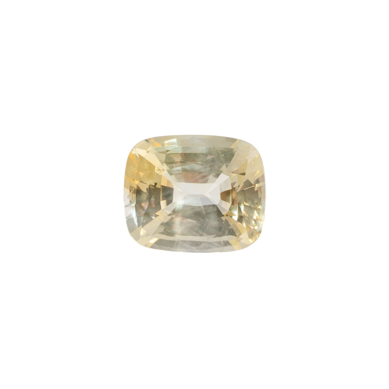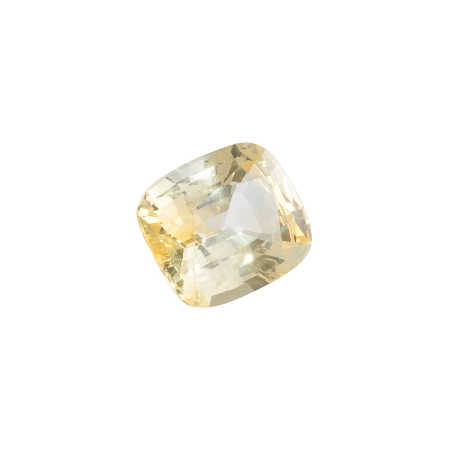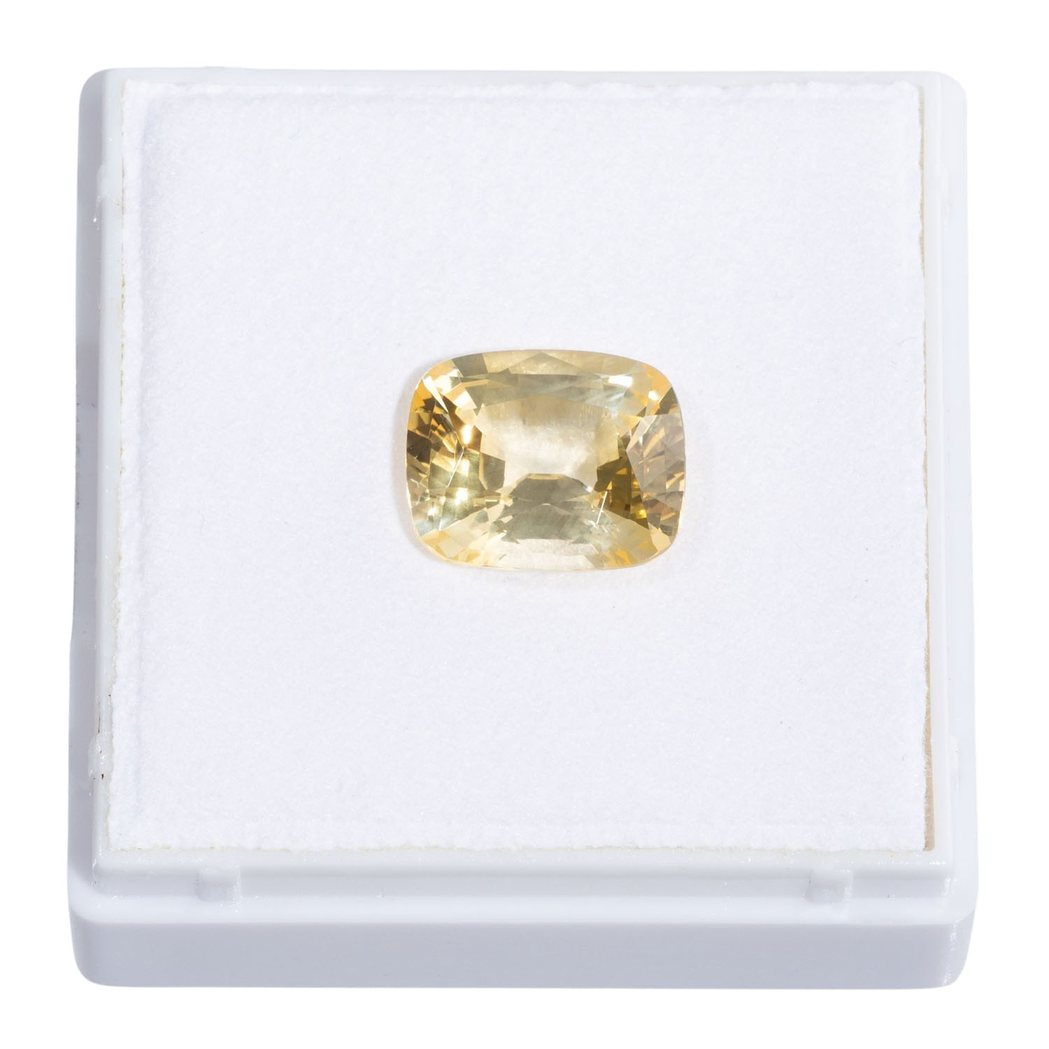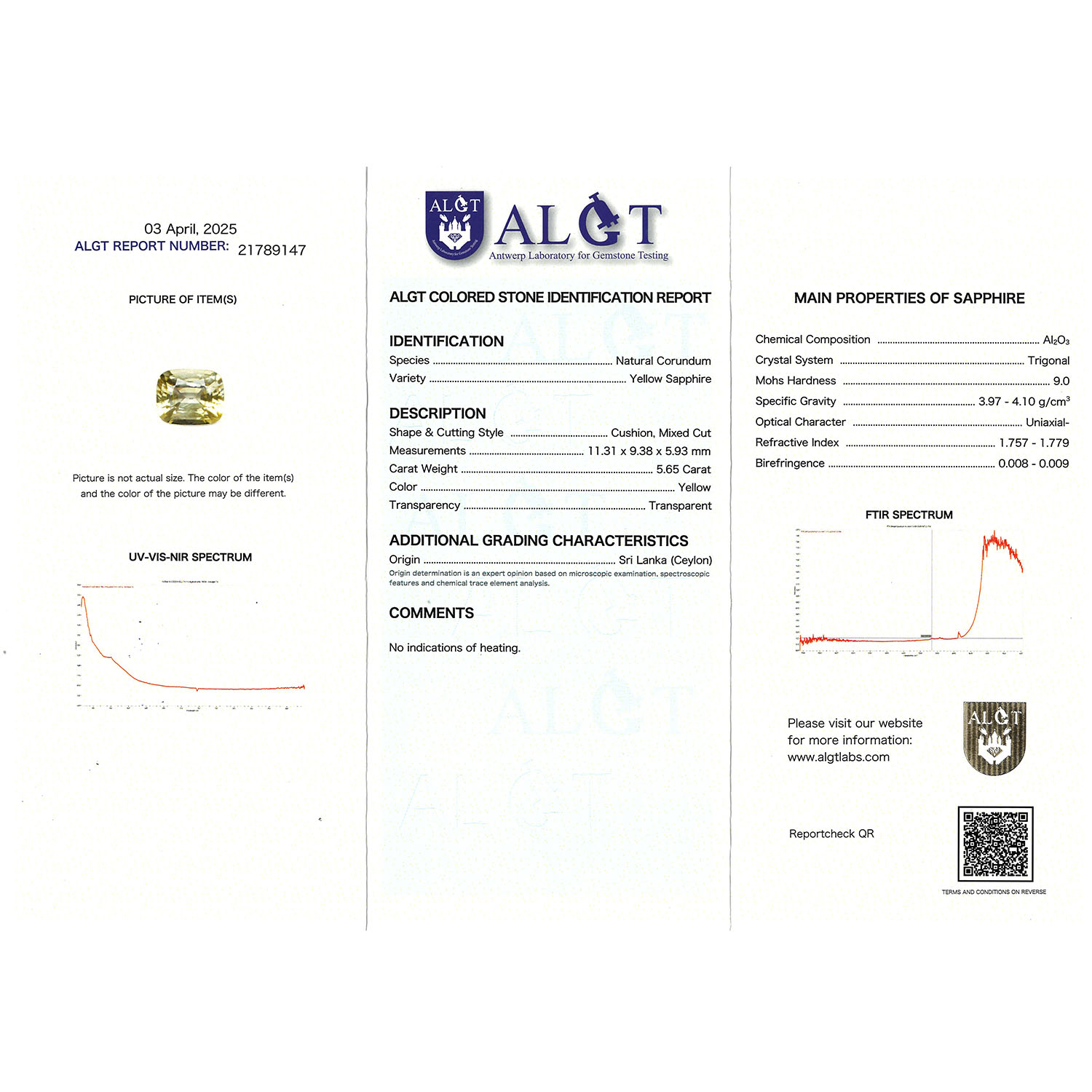 Loose yellow sapphire of 5.65 ct, mixed cut, cushion, 11.31 x 9.38 x 5.93 mm, no indications of heating, origin: Sri Lanka (Ceylon) with ALGT report (04/2025).