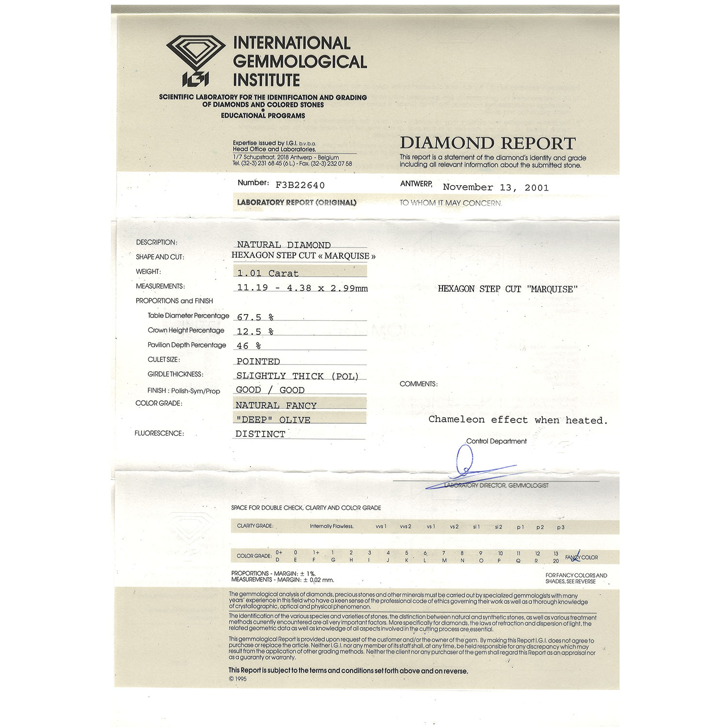 Natural hexagon step cut marquise diamond 1.01 ct, natural fancy 'deep' olive, 11.1 x 4x3 x 2.9 mm, diamond report IGI F3B22640 (2001).