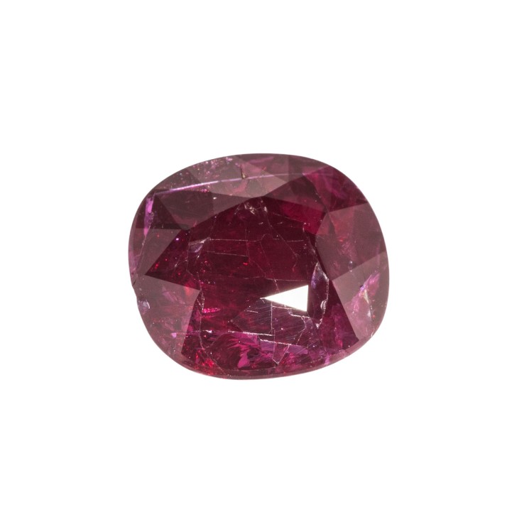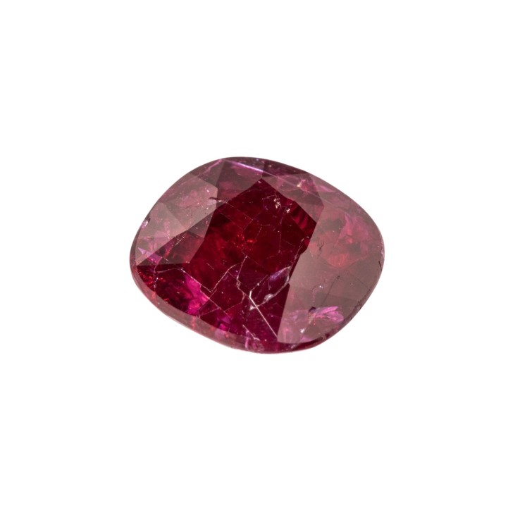 Loose ruby weighing 2.11 ct, star/step cut, cushion, no indications of heating, origin: Mozambique, numerous small cracks near the surface and chips, includes Lotus Gold gemstone report (11/2024).