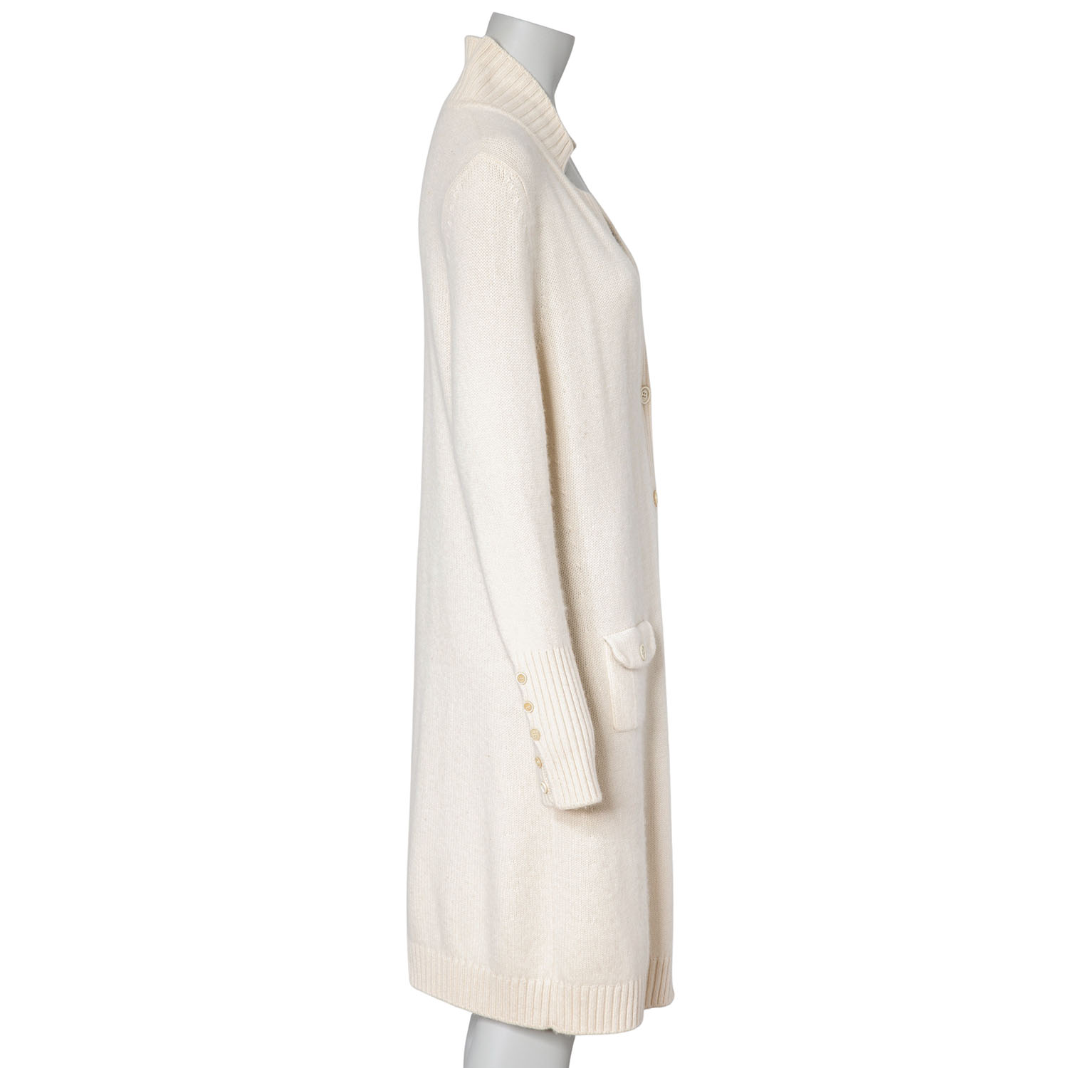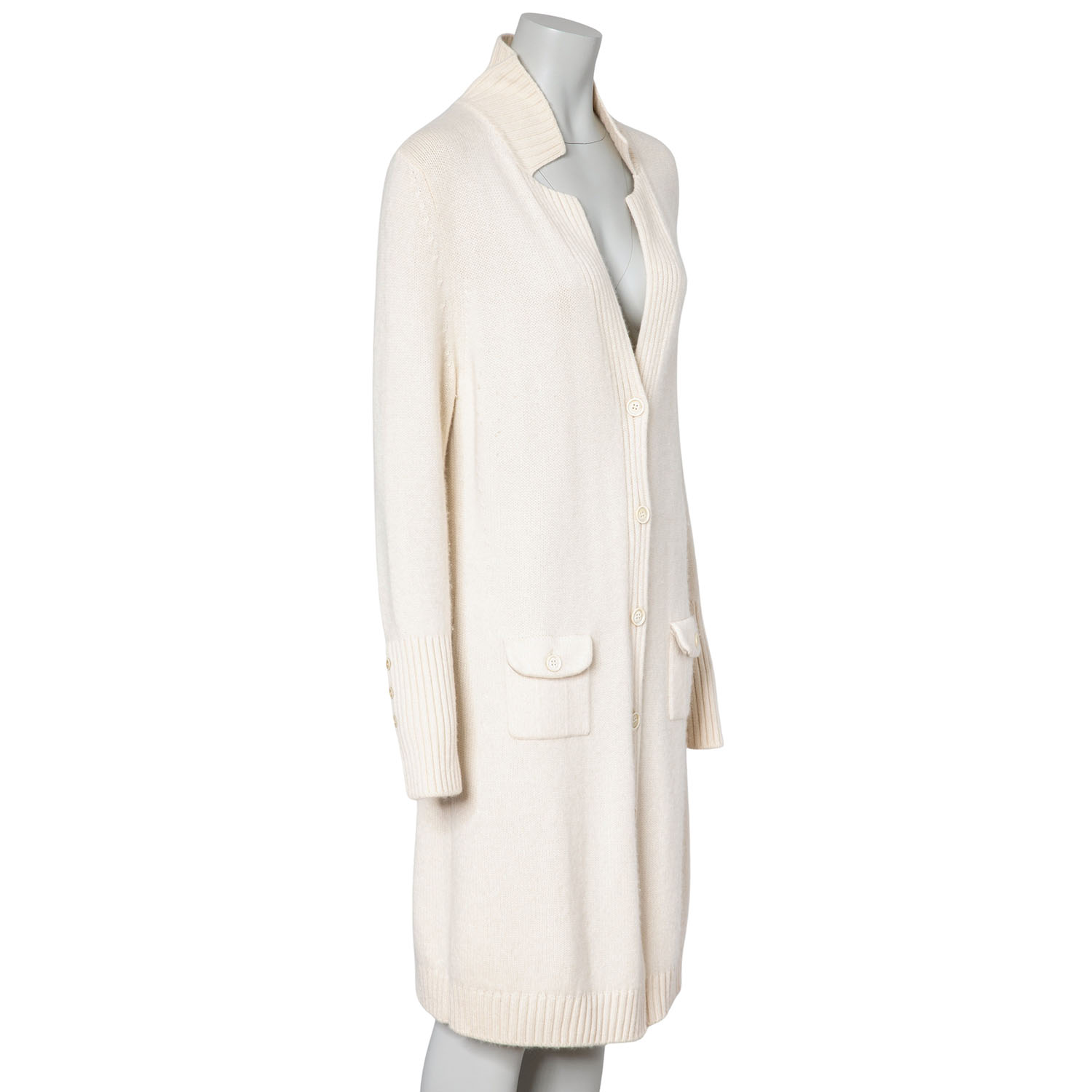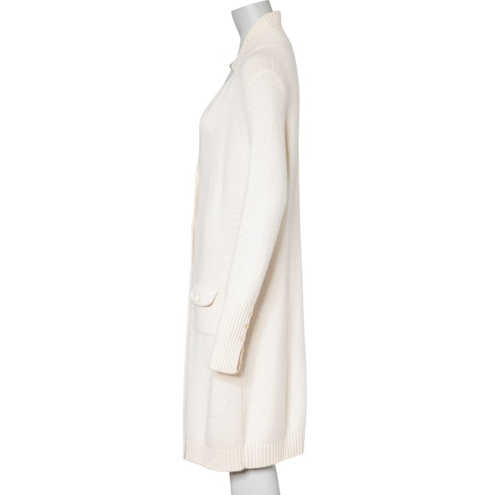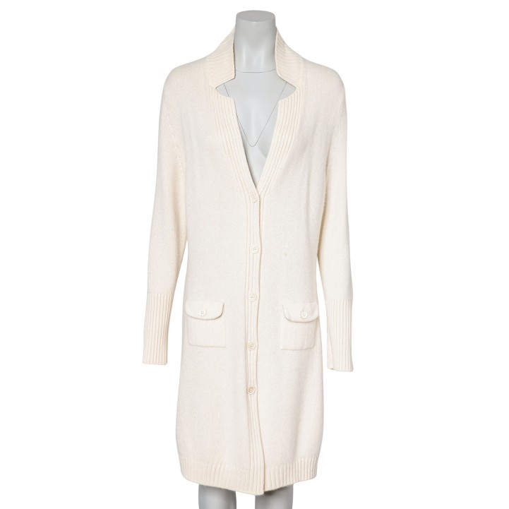 LORO PIANA Cardigan, size 40 (it. 46). 100% cashmere. Cream-coloured, long style with ribbed knit at the hems, flap pockets and lapel collar. Signs of wear present.