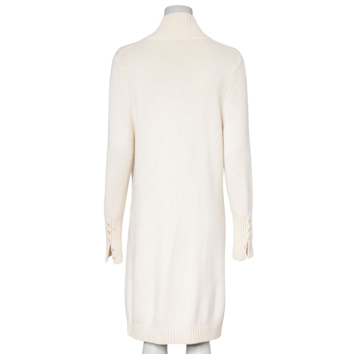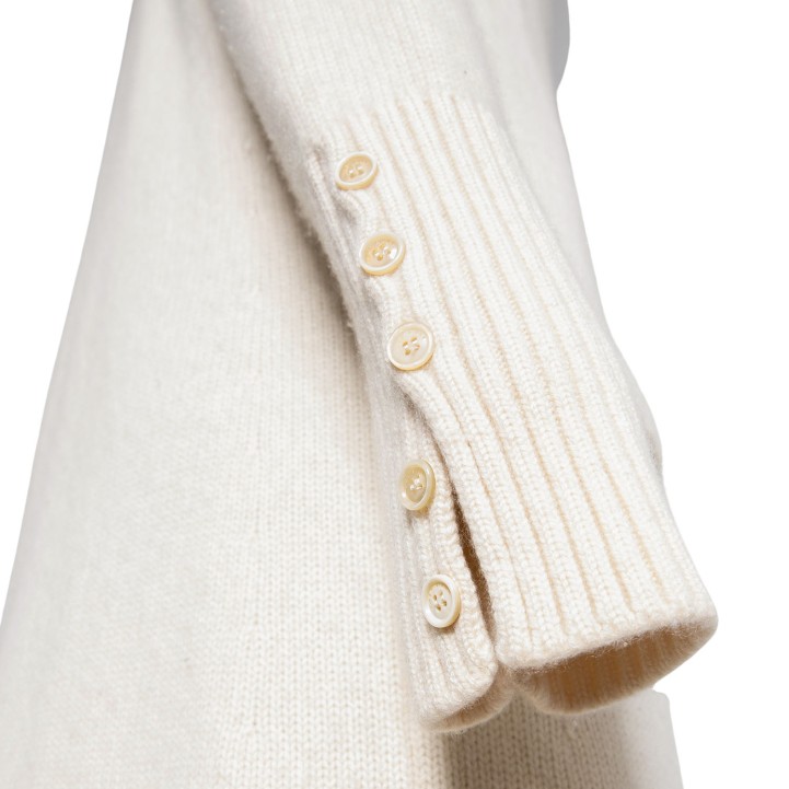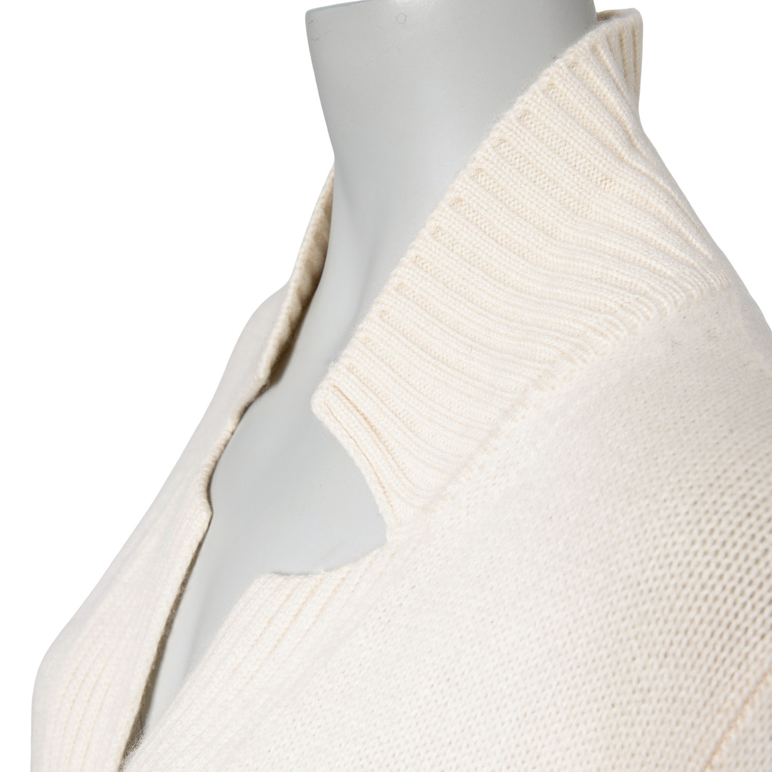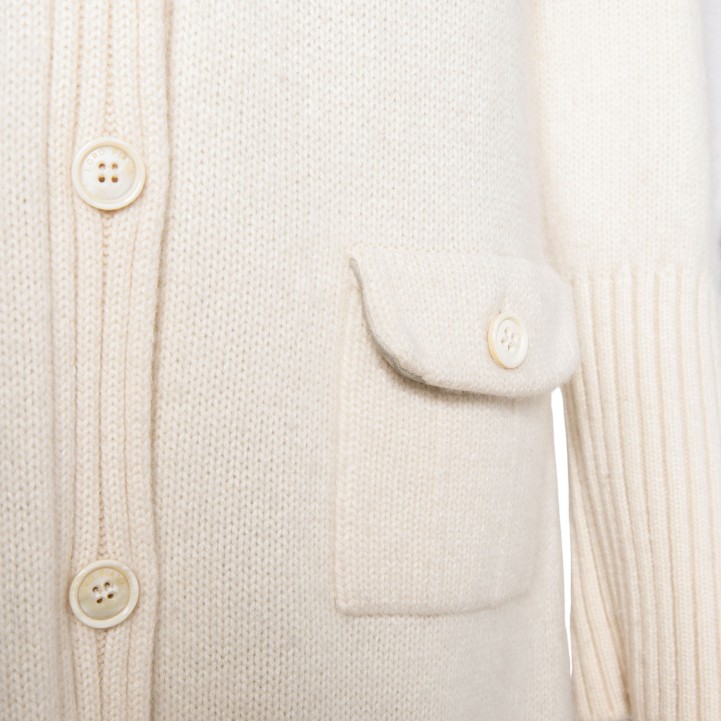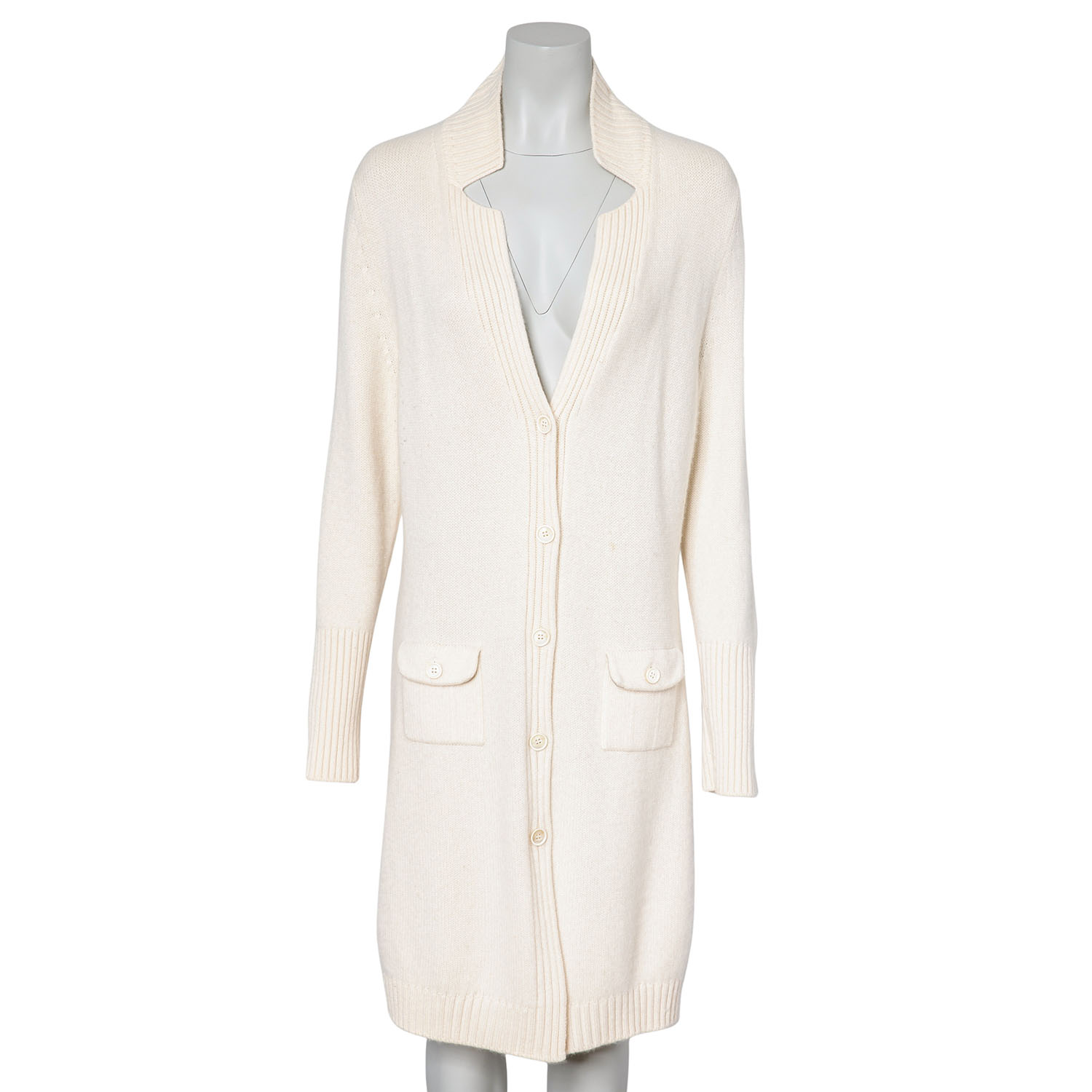 LORO PIANA Cardigan, size 40 (it. 46). 100% cashmere. Cream-coloured, long style with ribbed knit at the hems, flap pockets and lapel collar. Signs of wear present.