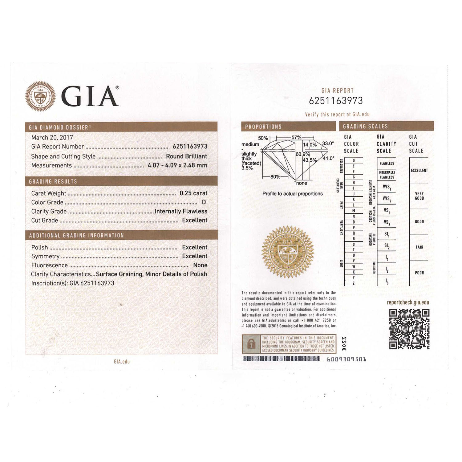 Loose brillant cut diamond 0.25 ct, EW (D)/IF, proportions: excellent, symmetry: excellent, cut: excellent, fluorescence: none, GIA certificate 6251163973 from 03/2017 included.
