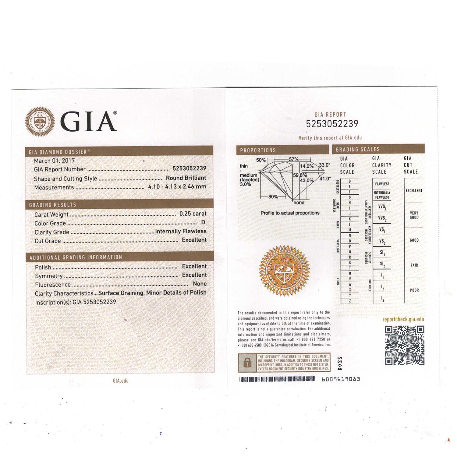 Loose brillant cut diamond 0.25 ct, EW (D)/IF, proportions: excellent, symmetry: excellent, cut: excellent, fluorescence: none, GIA certificate 5253052239 from 03/2017 included.