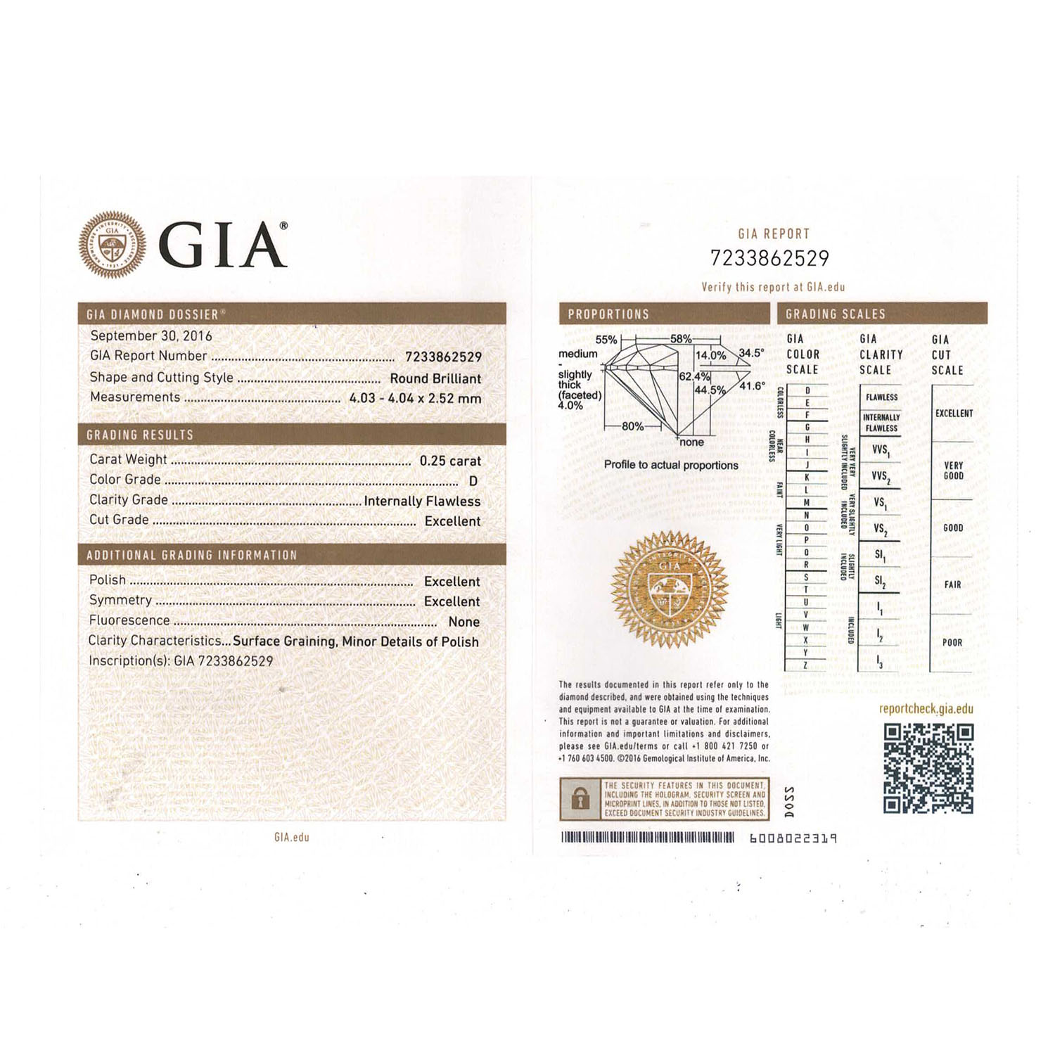 Loose brillant cut diamond 0.25 ct, EW (D)/IF, proportions: excellent, symmetry: excellent, cut: excellent, fluorescence: none, GIA certificate 7233862529 from 09/2016 included.