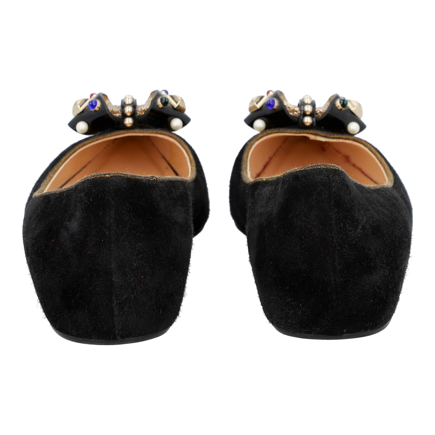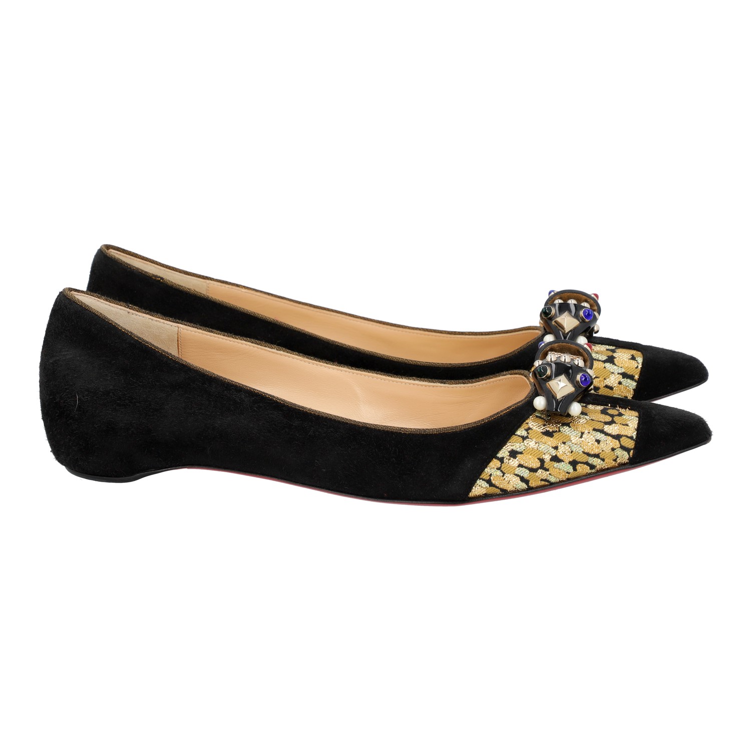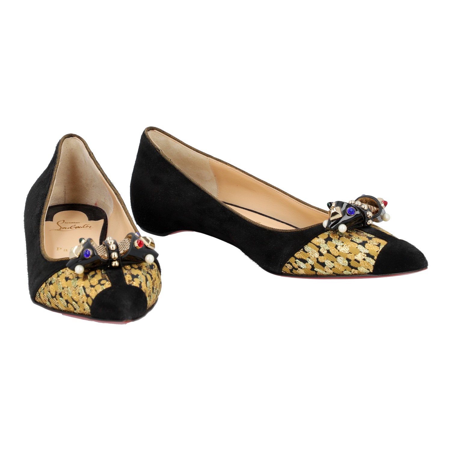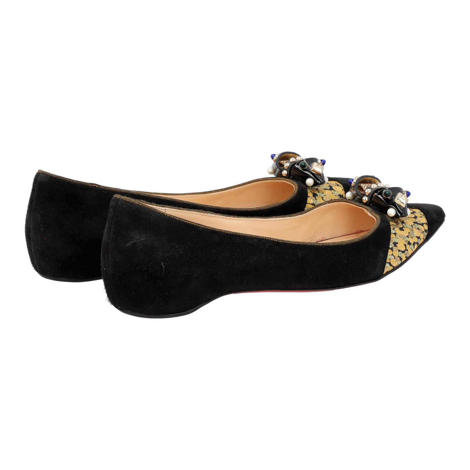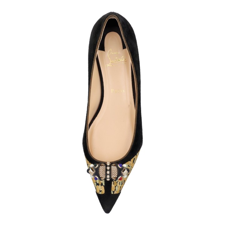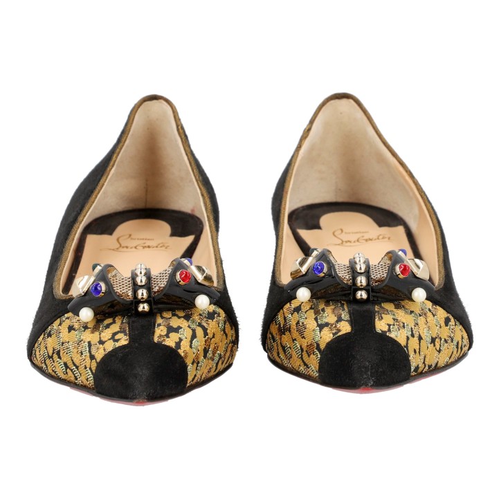 LOUBOUTIN ballerina flats, size 41. Black suede leather shoes with brocade detailing and a decorative bow. Signs of wear present.