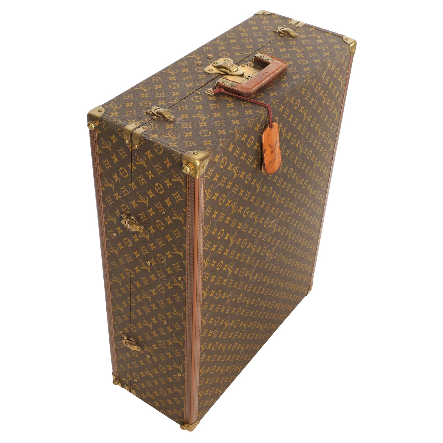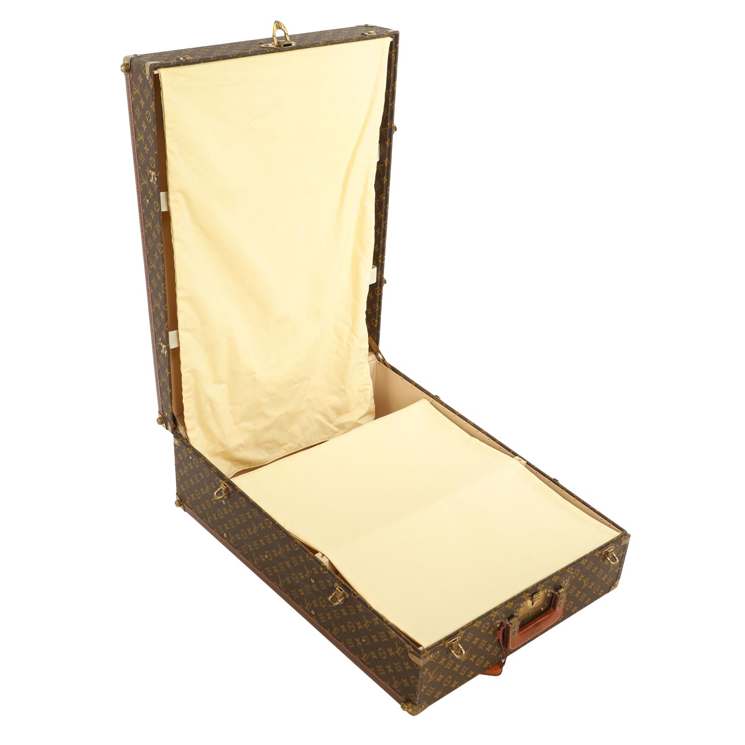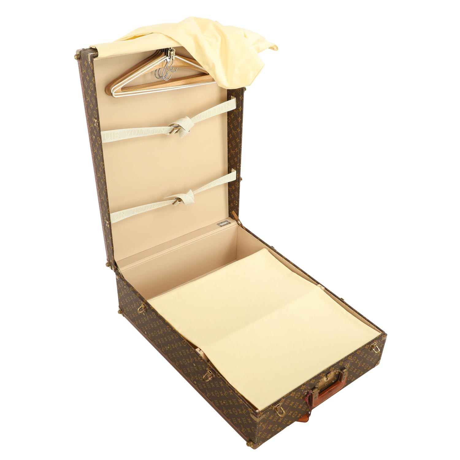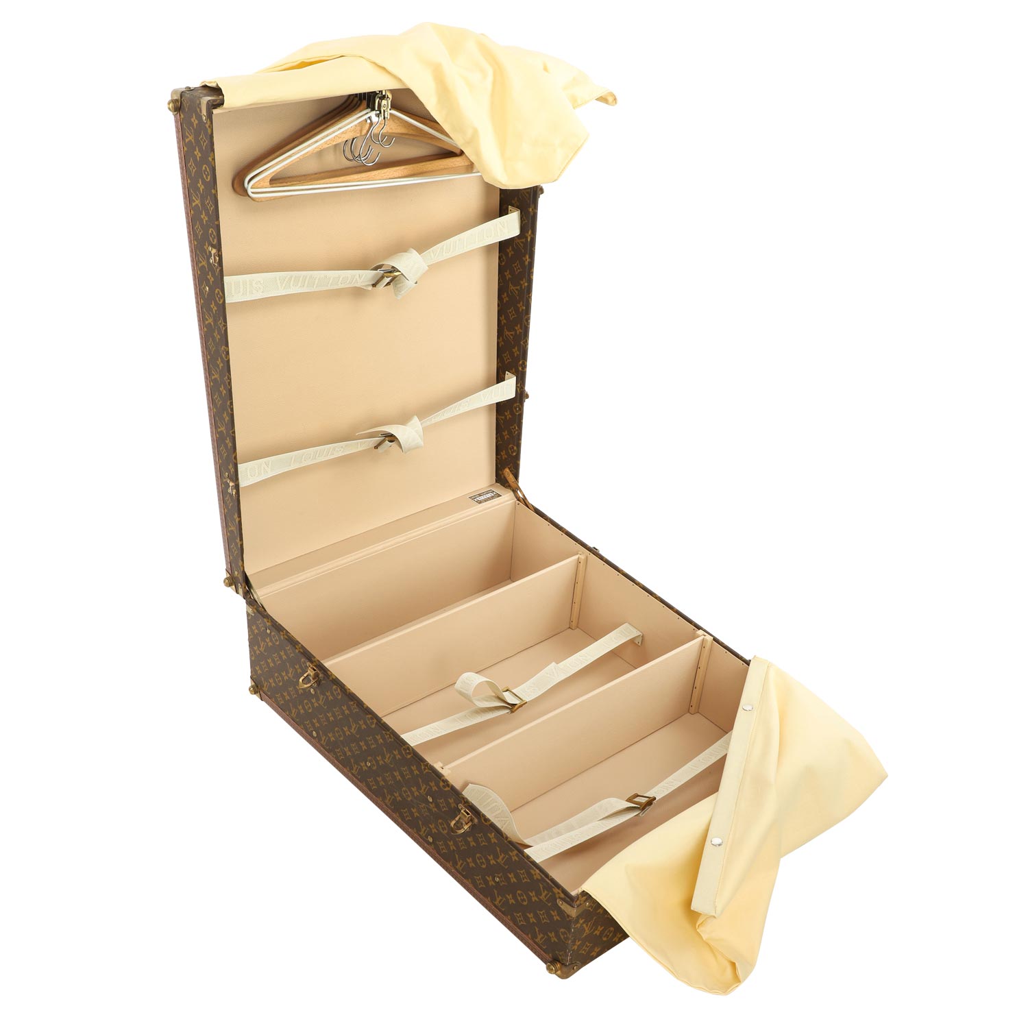 LOUIS VUITTON VINTAGE travel closet, size 75cm. Rarity - collector's item. Classic Monogram Canvas series with leather details and gold-tone hardware. Interior with 6 hangers (4x wood, 2, metal), four fastening straps, One side with dividers. Both sides with cotton curtain. Classic travel marks present, yet good, well-kept condition. 75x24x56cm.