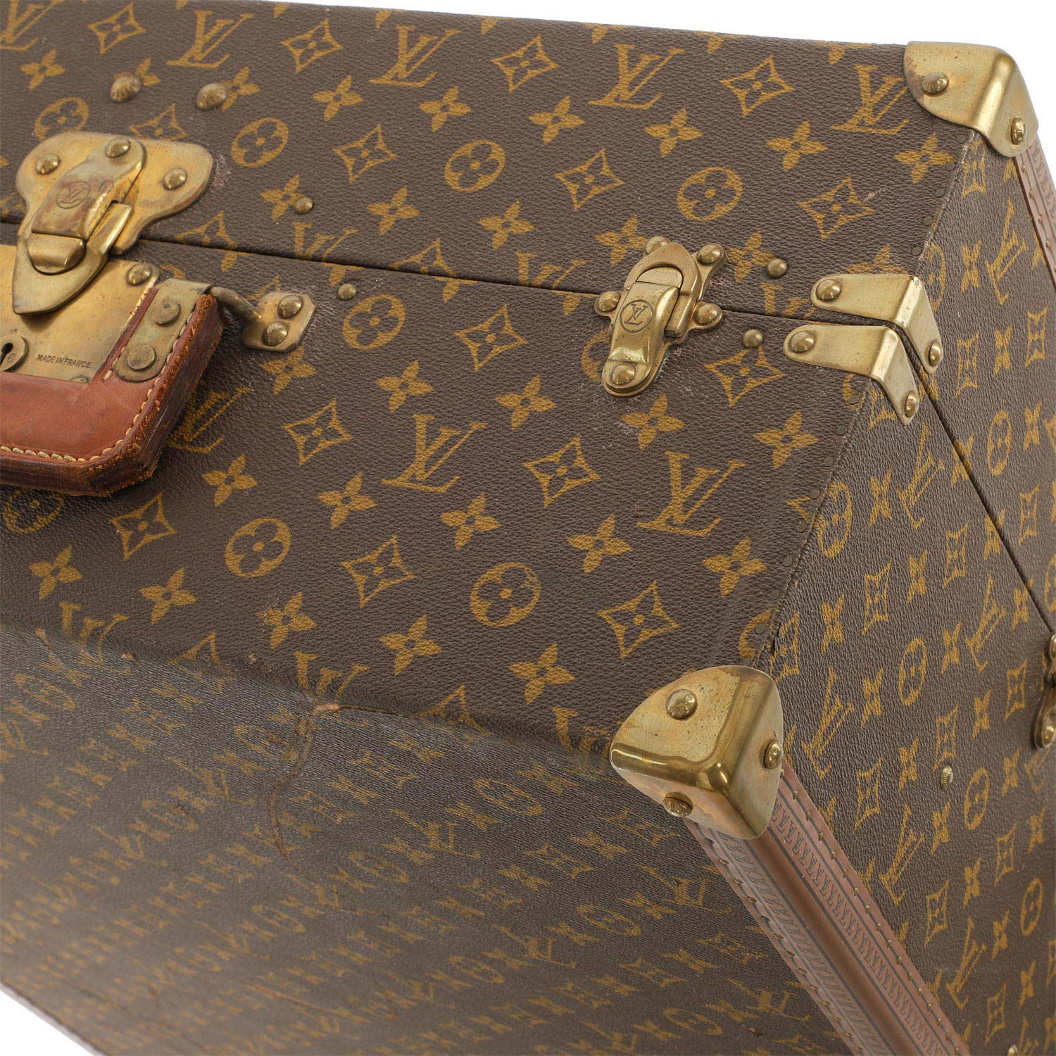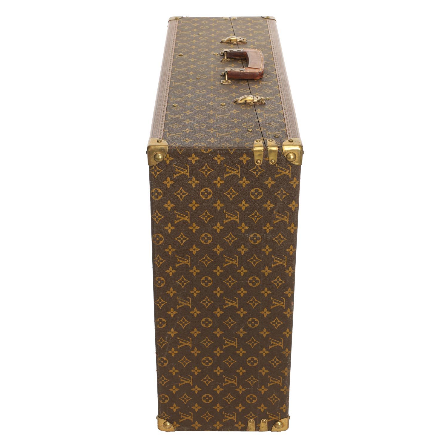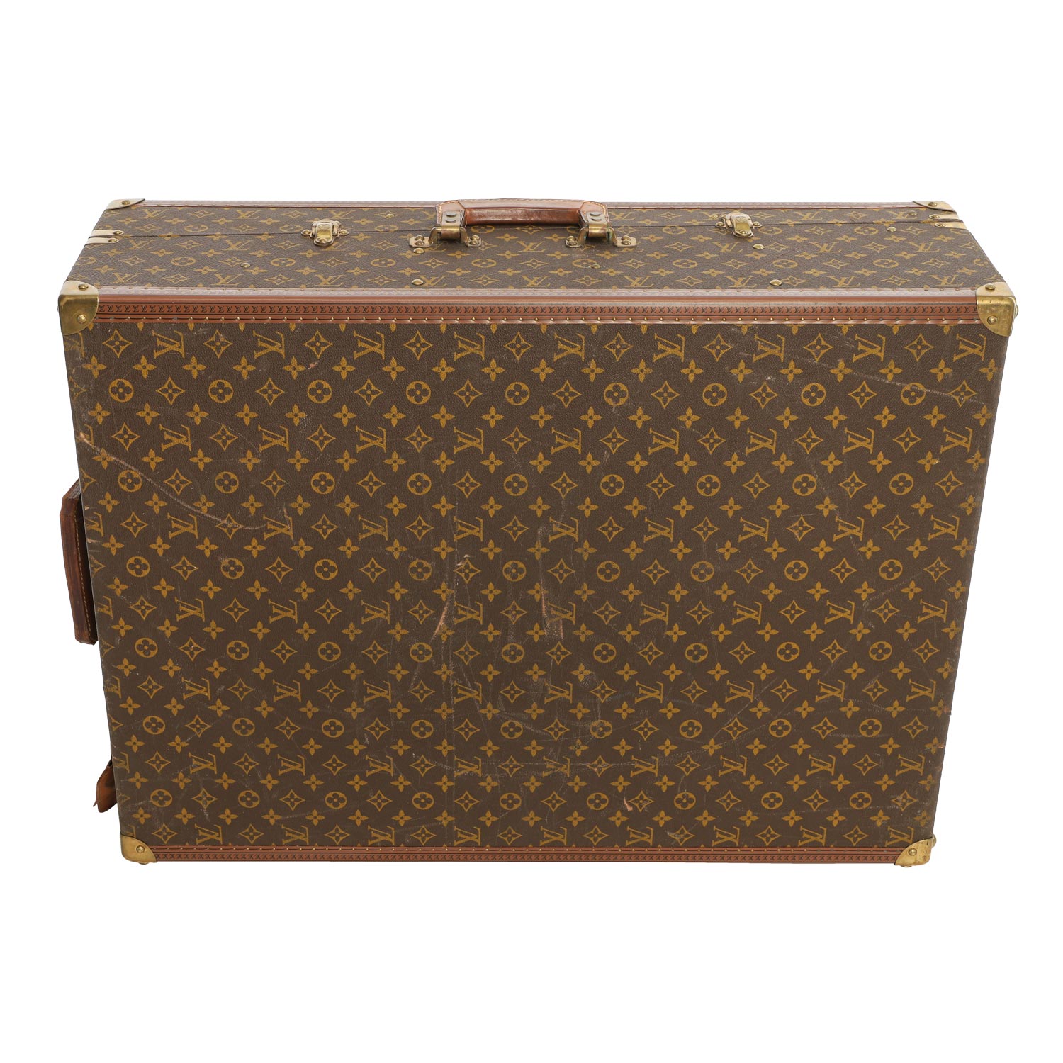 LOUIS VUITTON VINTAGE travel closet, size 75cm. Rarity - collector's item. Classic Monogram Canvas series with leather details and gold-tone hardware. Interior with 6 hangers (4x wood, 2, metal), four fastening straps, One side with dividers. Both sides with cotton curtain. Classic travel marks present, yet good, well-kept condition. 75x24x56cm.