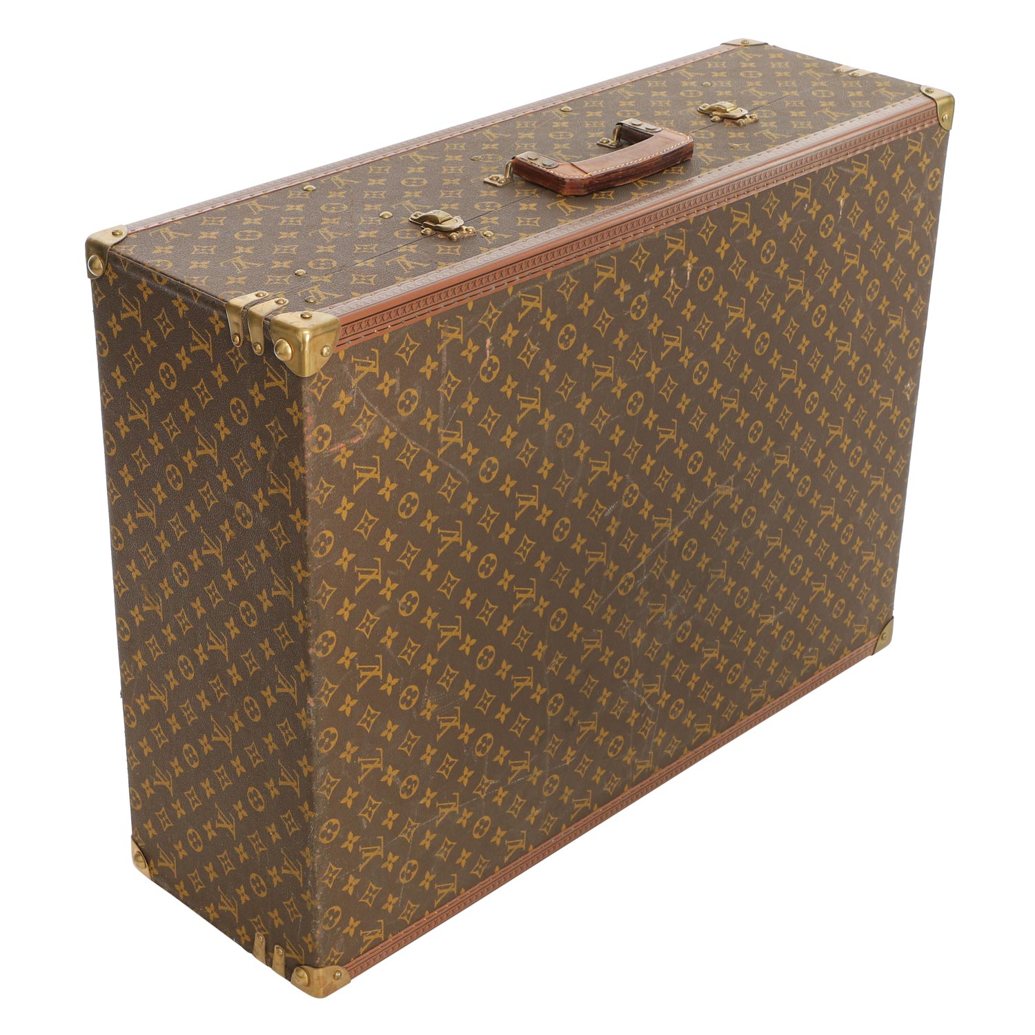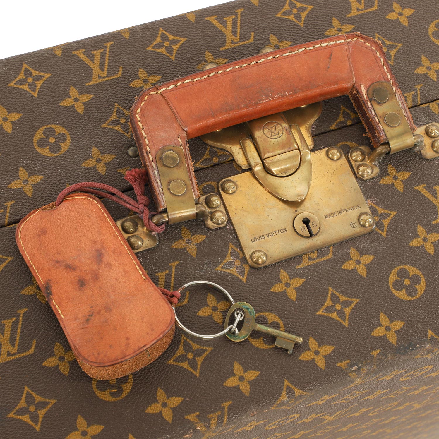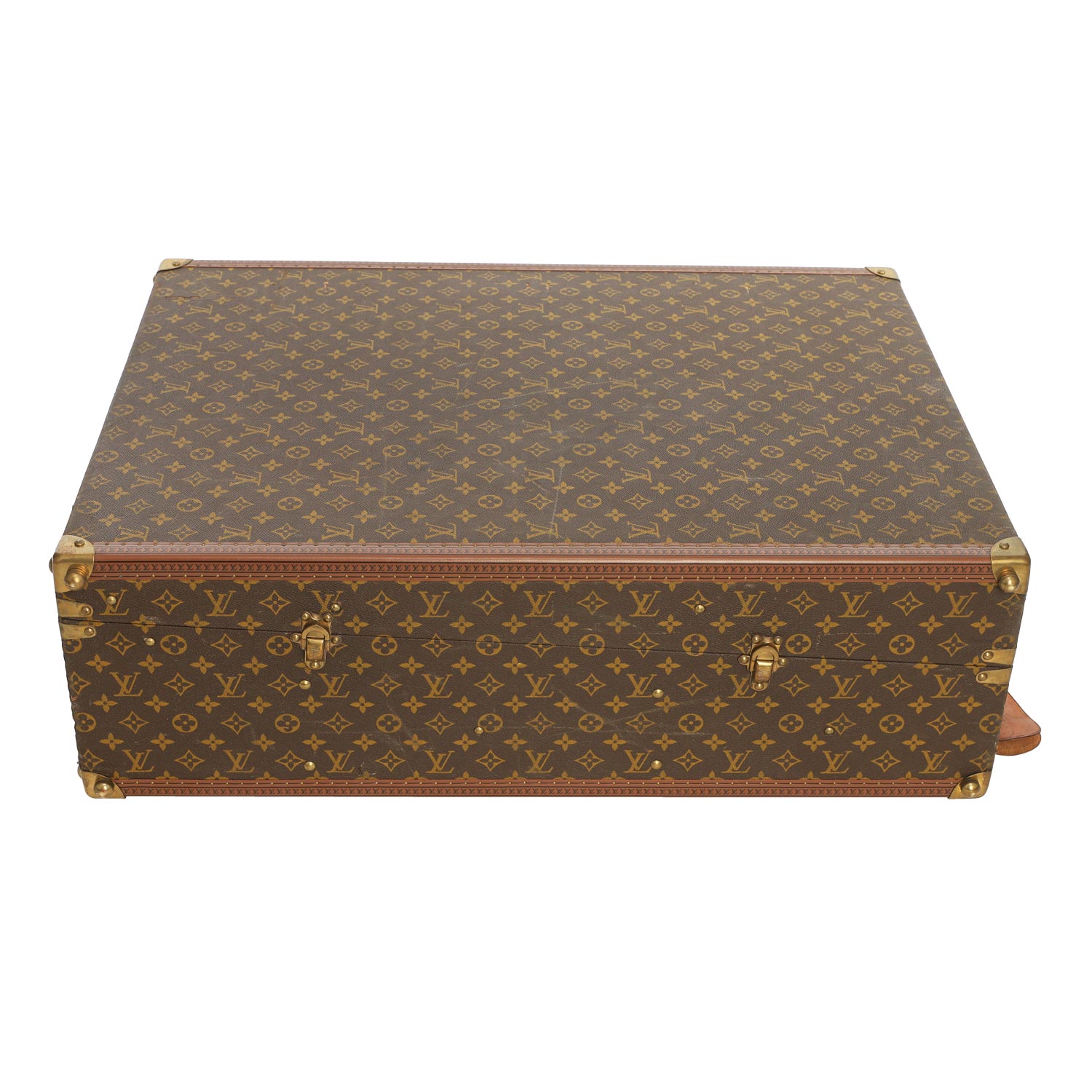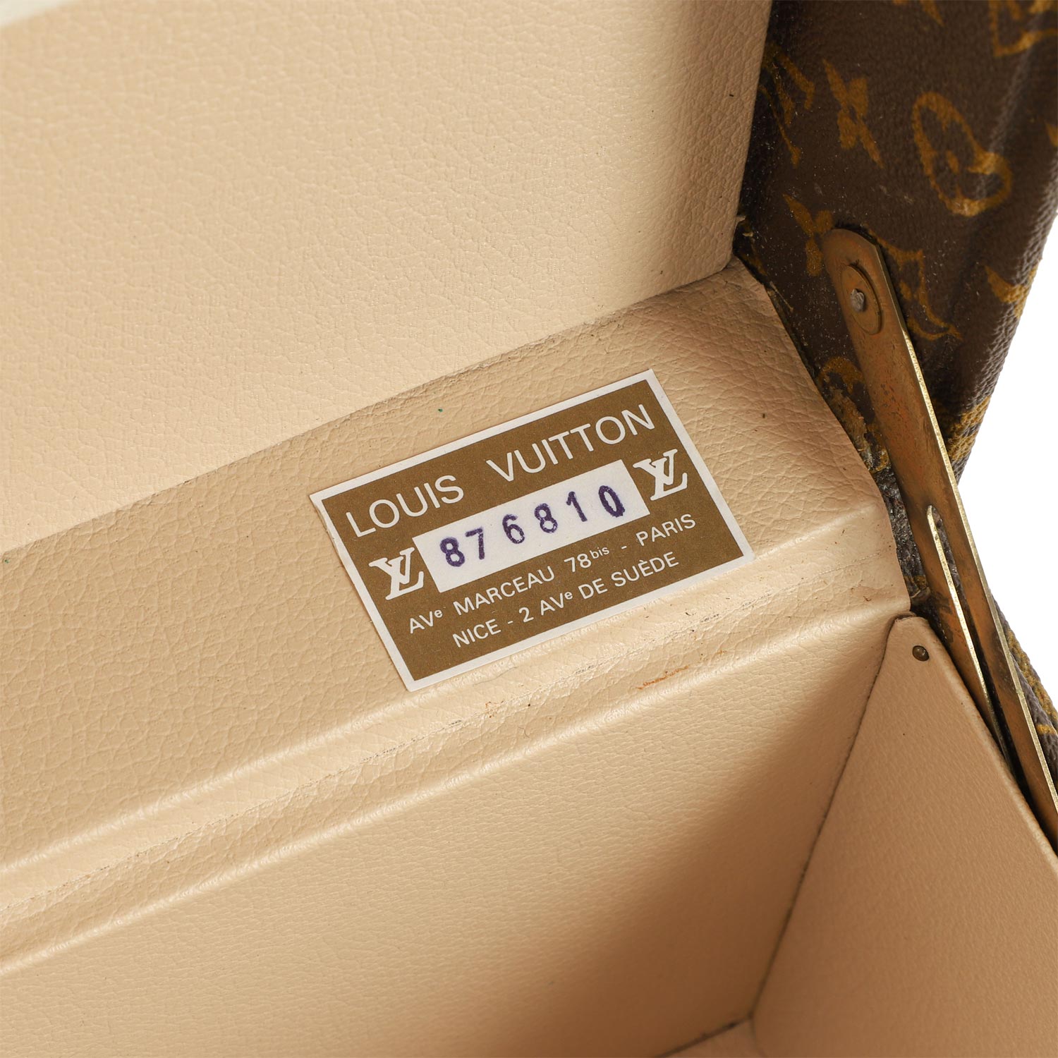 LOUIS VUITTON VINTAGE travel closet, size 75cm. Rarity - collector's item. Classic Monogram Canvas series with leather details and gold-tone hardware. Interior with 6 hangers (4x wood, 2, metal), four fastening straps, One side with dividers. Both sides with cotton curtain. Classic travel marks present, yet good, well-kept condition. 75x24x56cm.