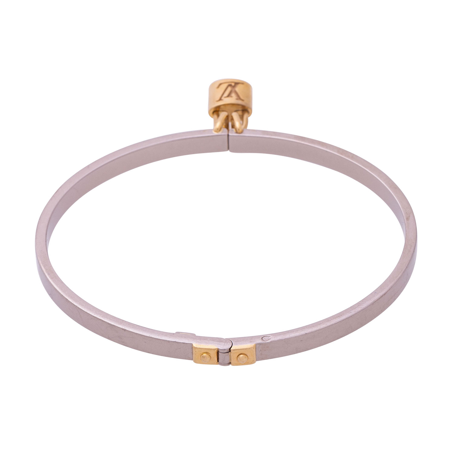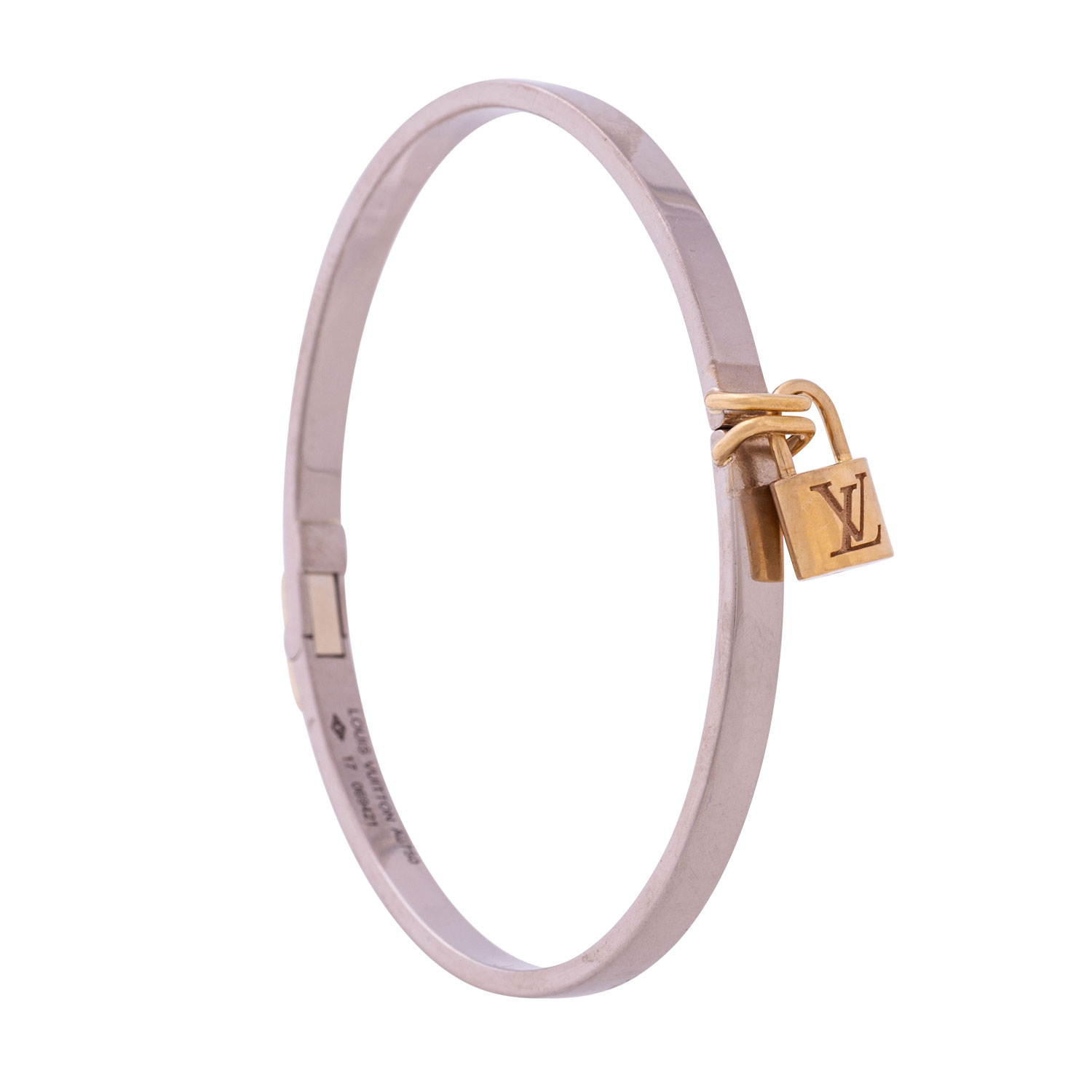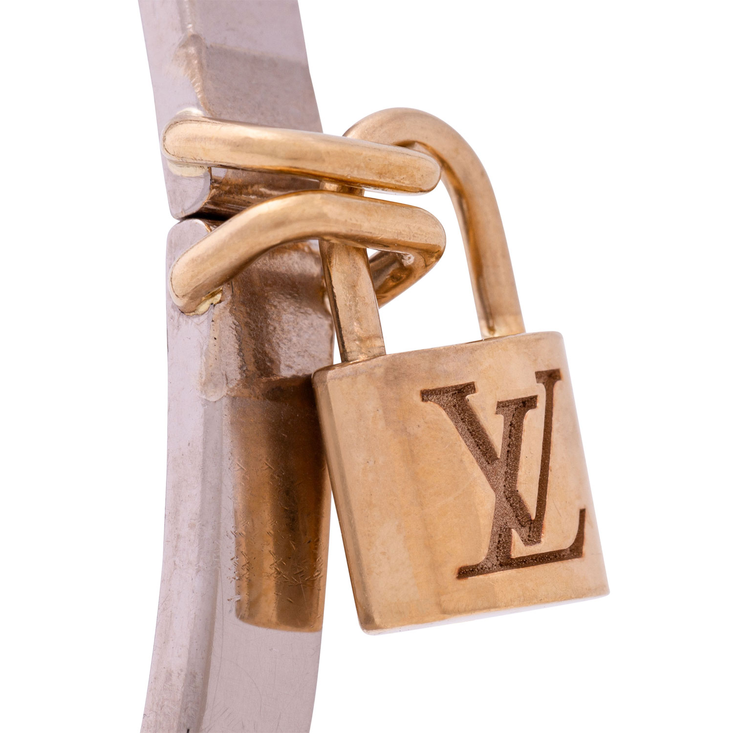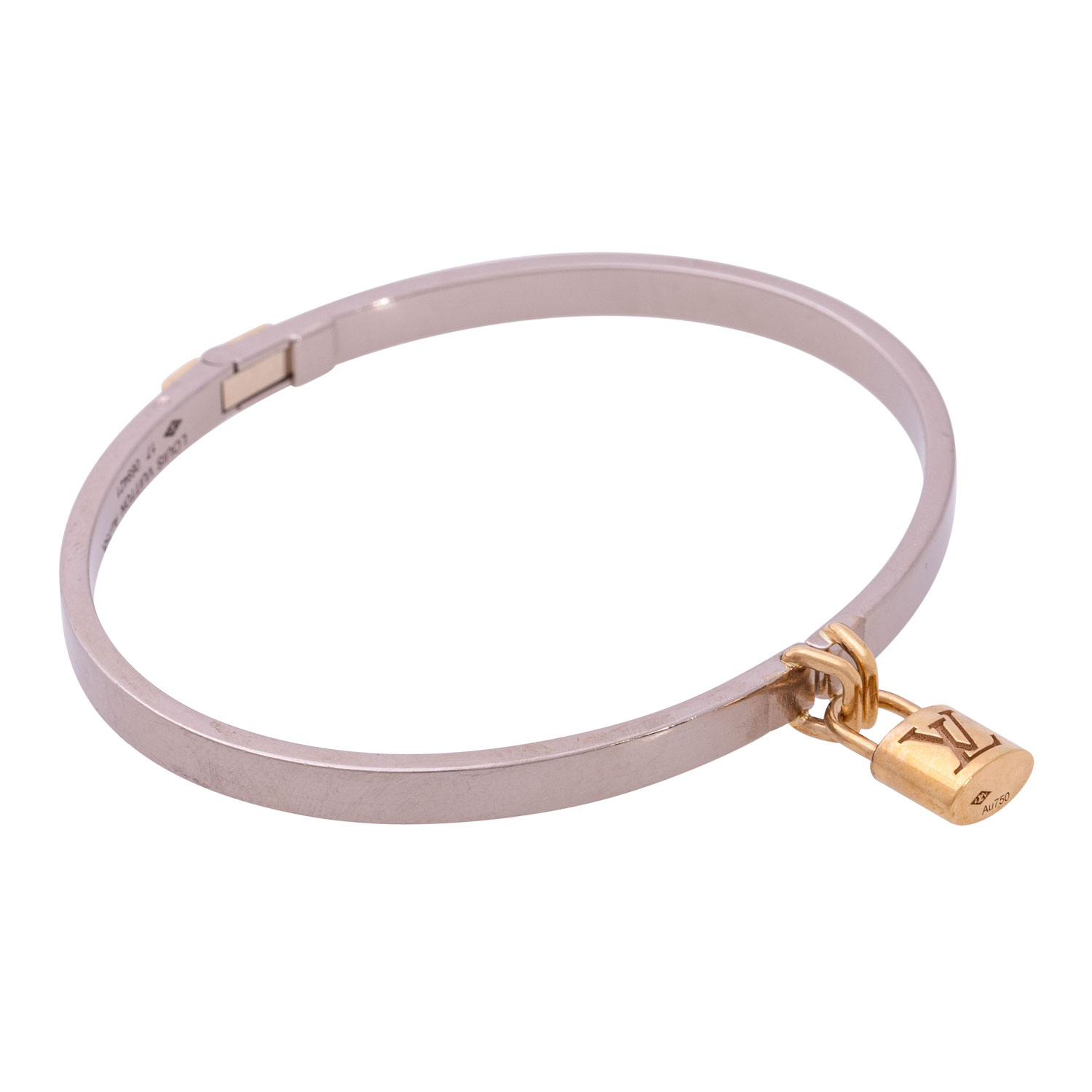 LOUIS VUITTOM 'LOCK IT' bangle, size 17. 18K 750 WG with lock pendant in 18K 750 GG. Strong signs of wear present.