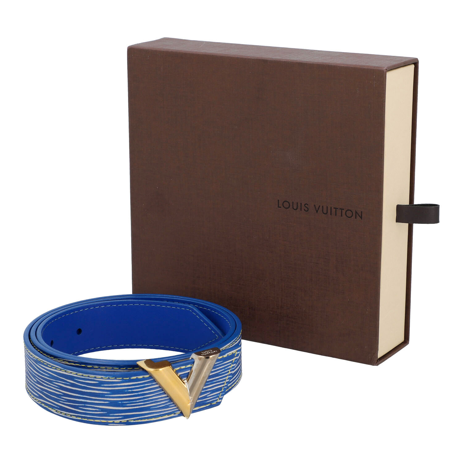 LOUIS VUITTON belt, coll.: 2015, L.: 85 cm. Epi leather series in denim blue with two-colour V-buckle. Box enclosed. Signs of wear present. B.: 3 cm.