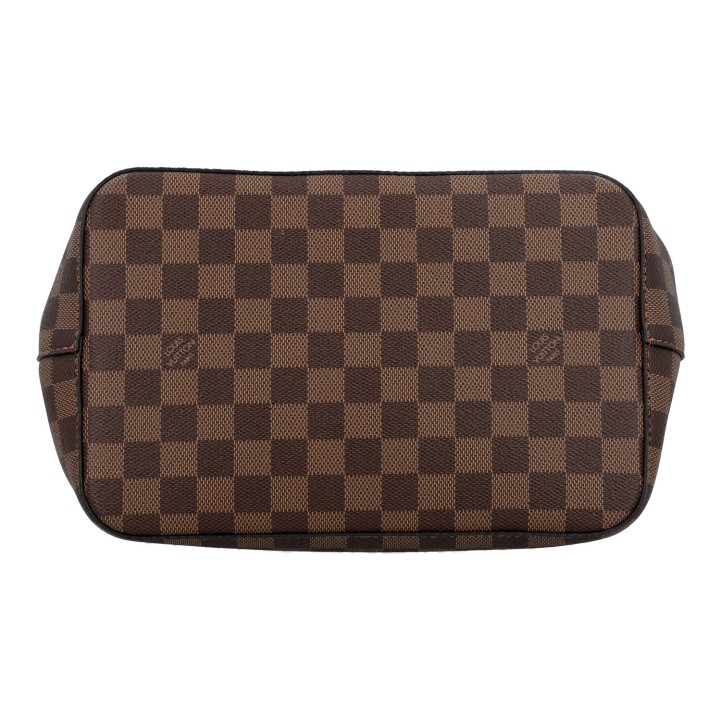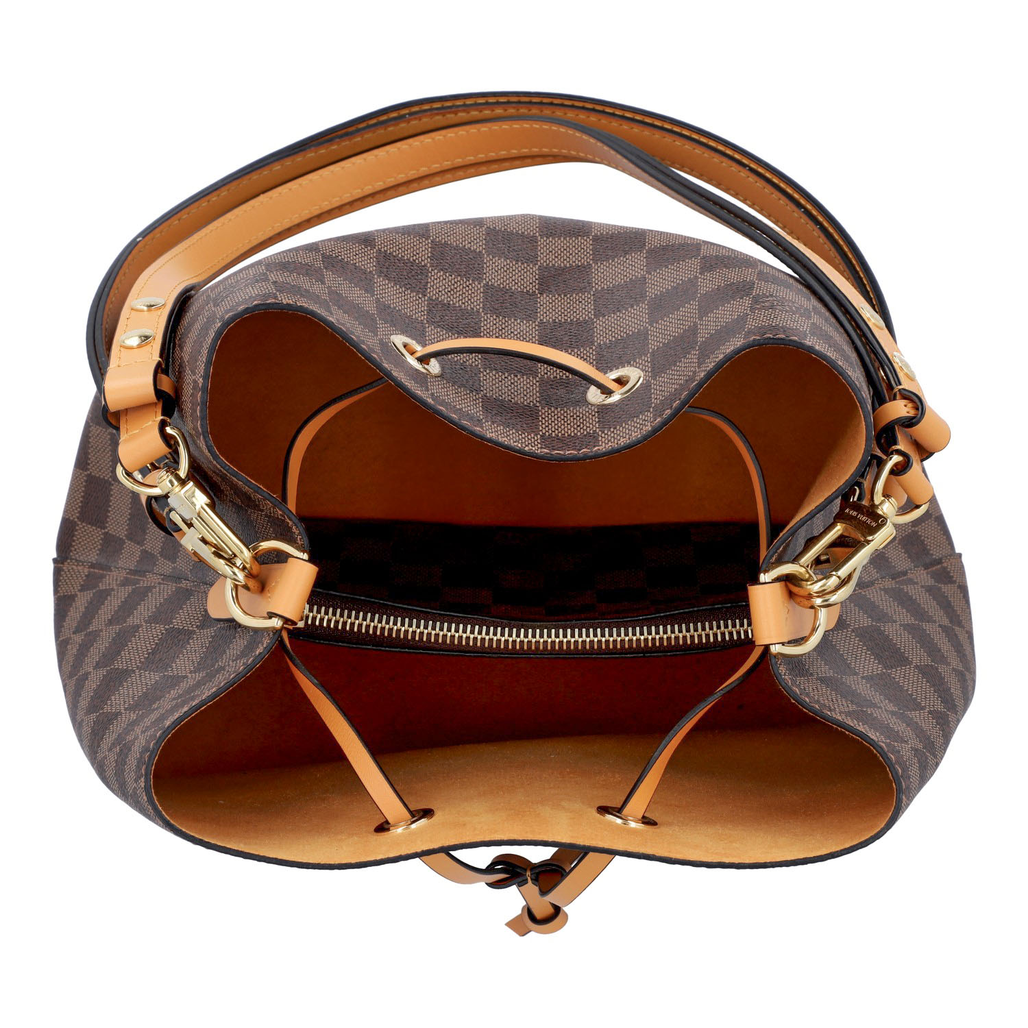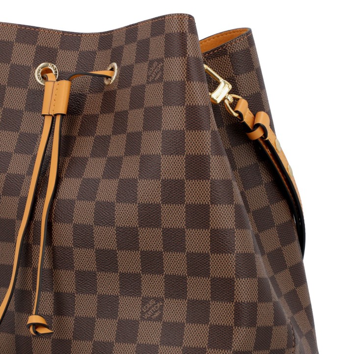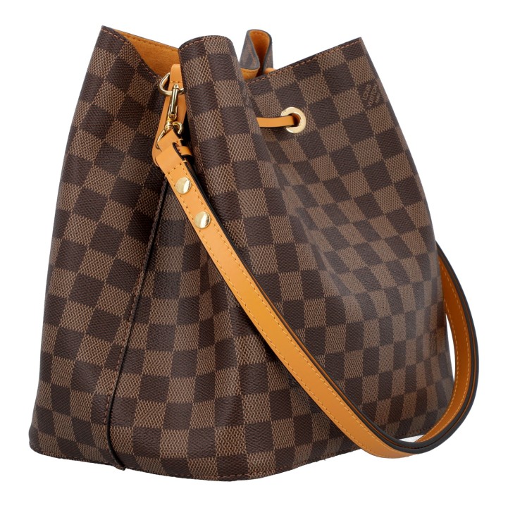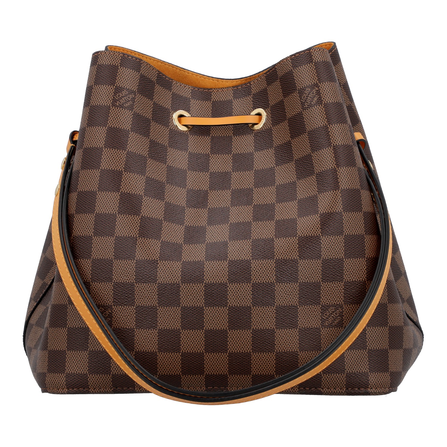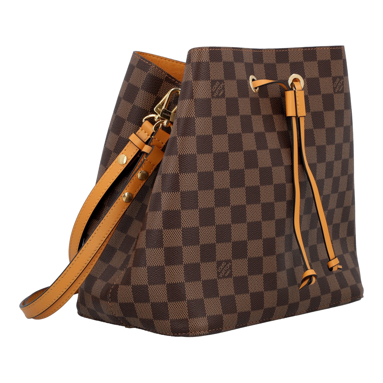 LOUIS VUITTON shoulder bag 'NEONOÉ'.Damier Ebene Canvas series with gold-coloured hardware and orange leather, drawstring closure and removable shoulder strap. Interior with zip pocket. Second shoulder strap and dust bag included. Signs of wear. 26 x 16 x 25 cm.