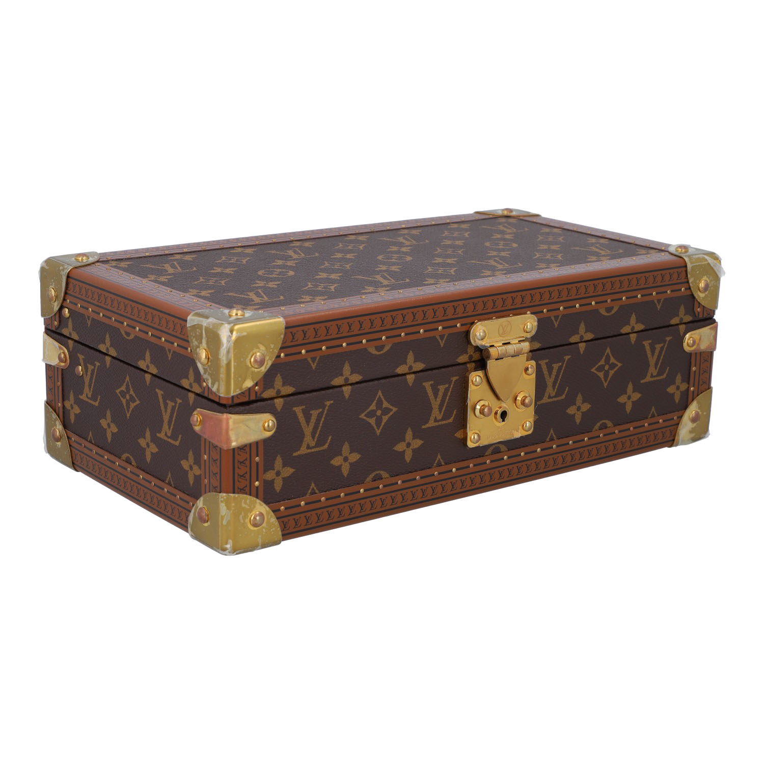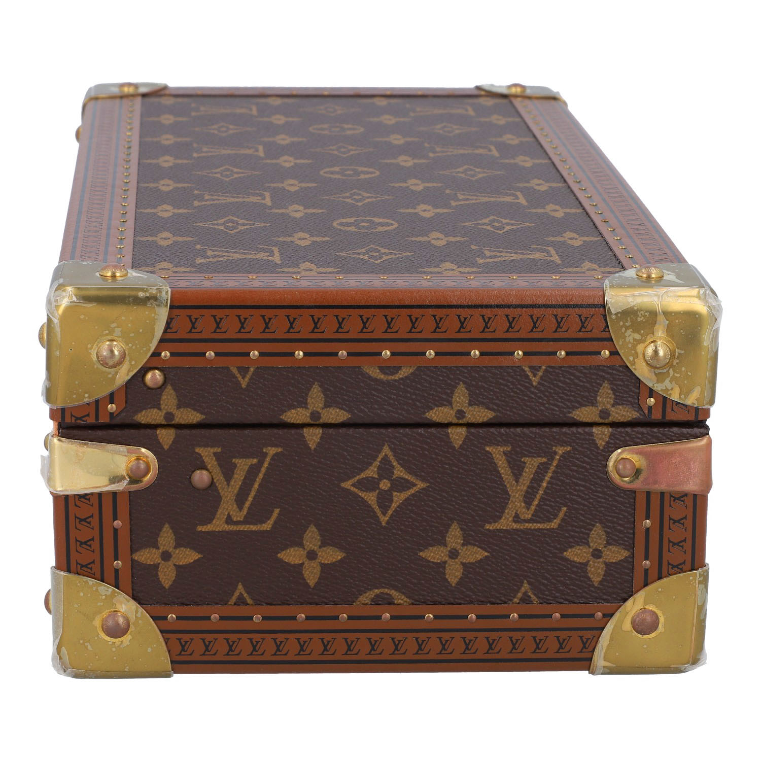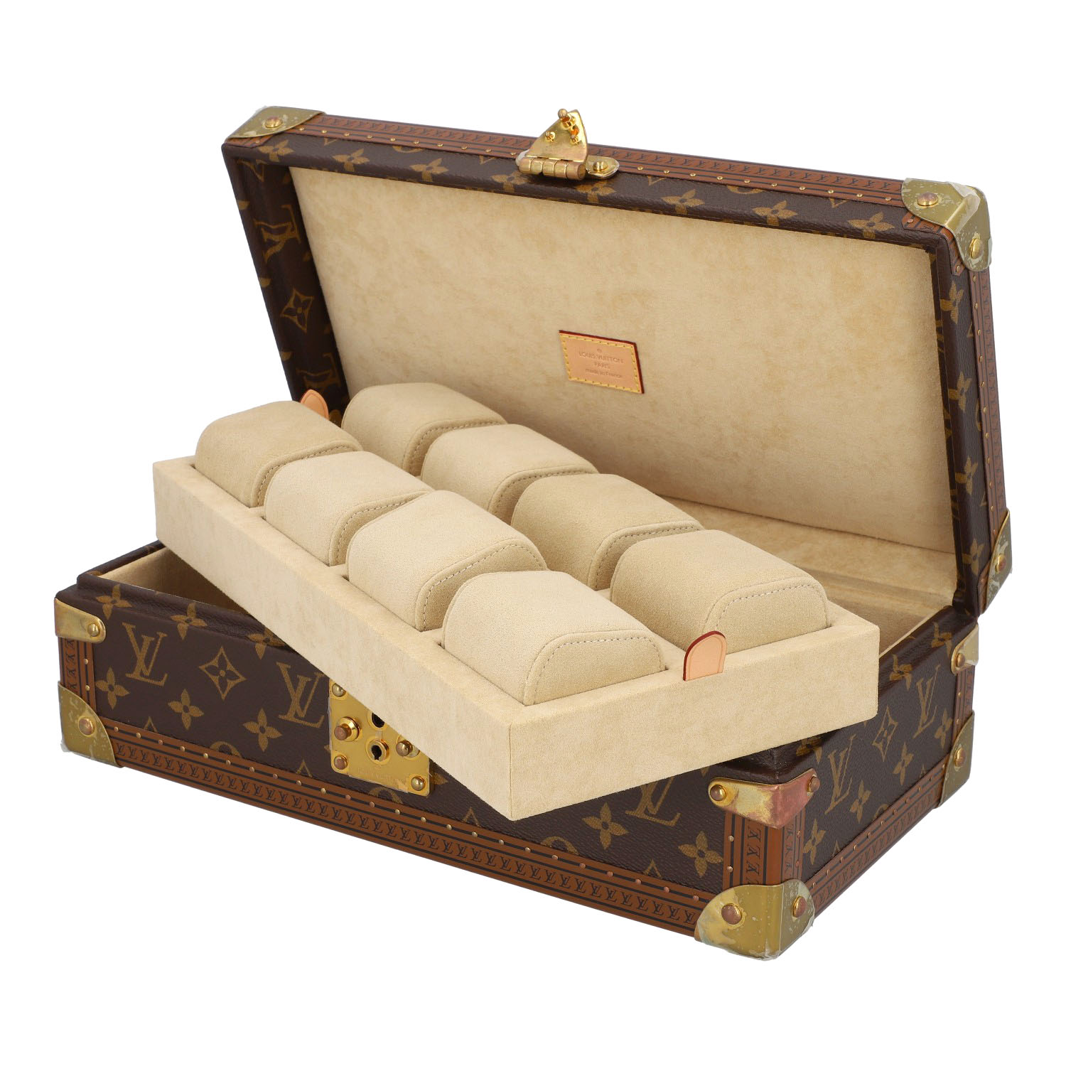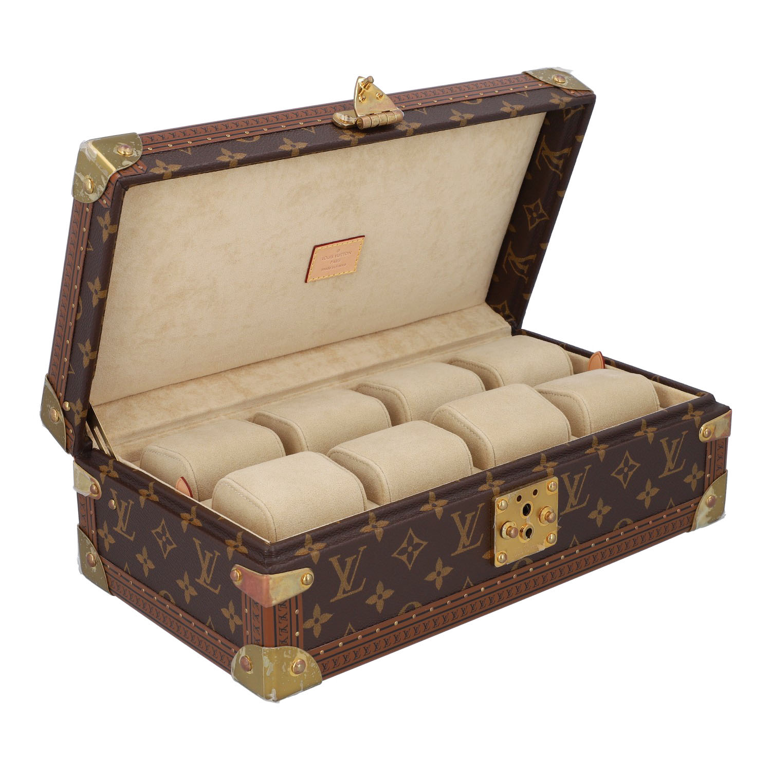 LOUIS VUITTON exclusive watch case - 8 watches. Current retail price: €6,900. Classic Monogram Canvas series with brass-colored fittings and decorative edging. Interior designed to hold 8 watches. Key and dust bag included. Very good condition. Hardware still wrapped in plastic.