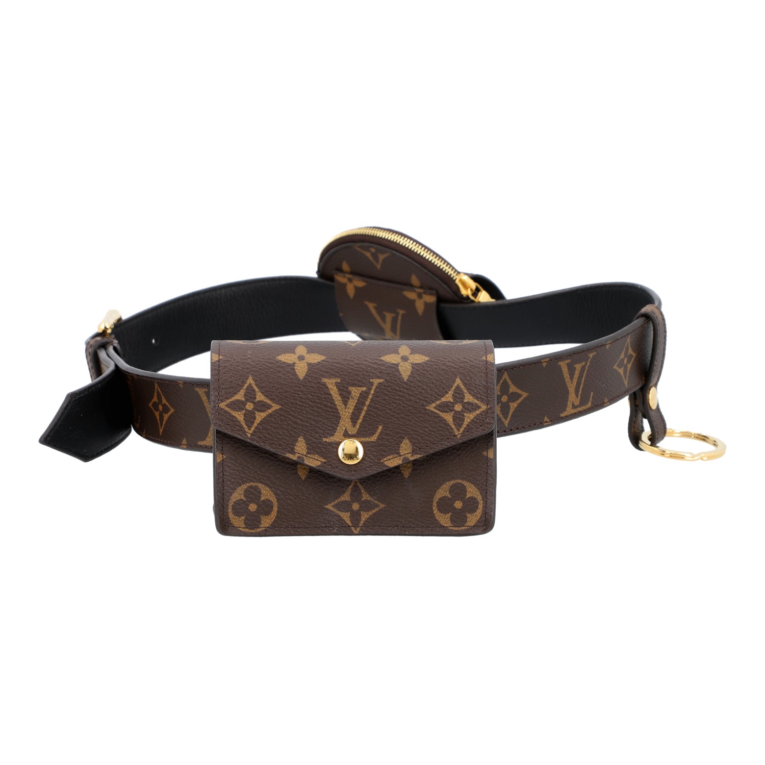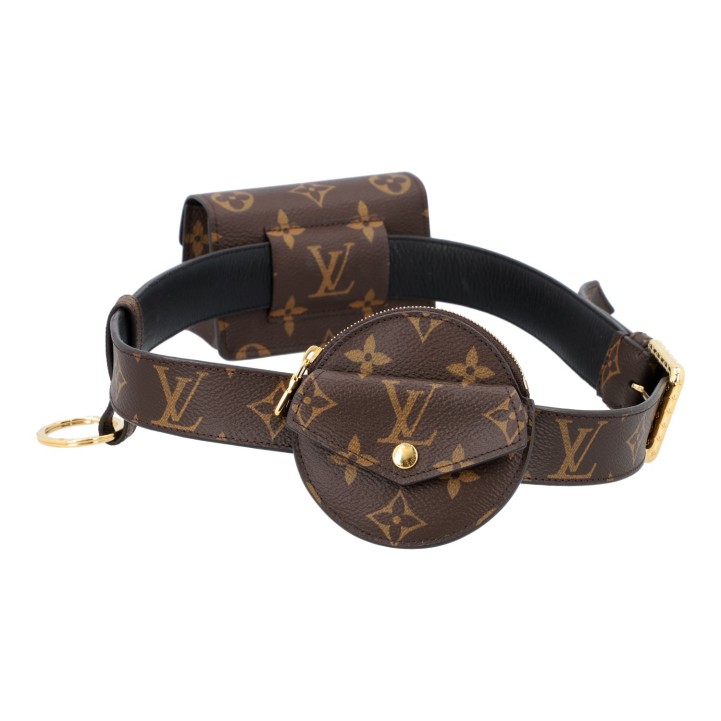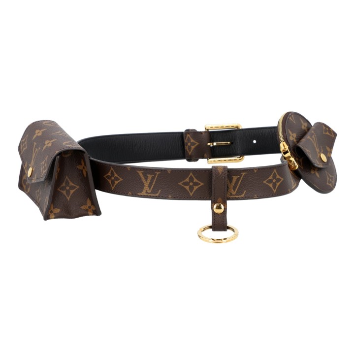 LOUIS VUITTON belt 'DAILY MULTI POCKET', L.: 80 cm. Monogram canvas series with gold-coloured hardware. Belt with two removable pouches – one round, one square with flap, press stud fastening, zip and a strap with key ring. Box and dust bag enclosed. Signs of wear present.