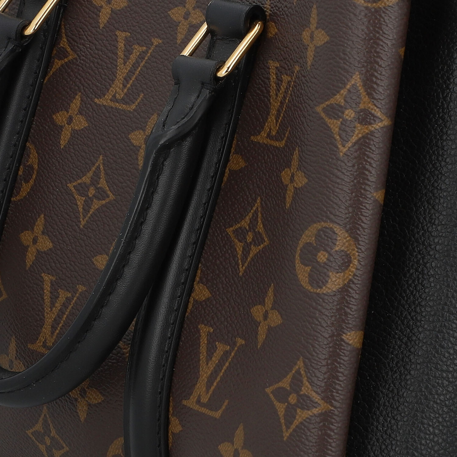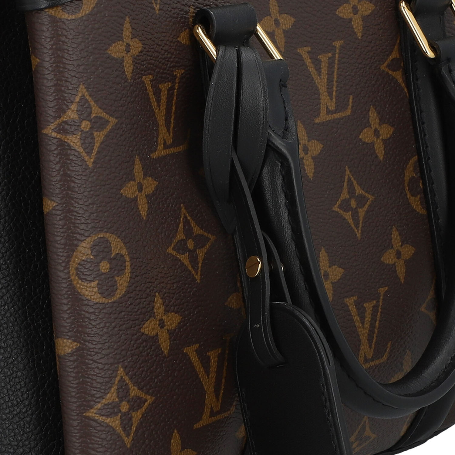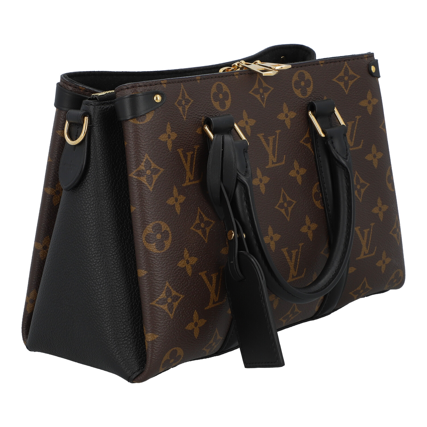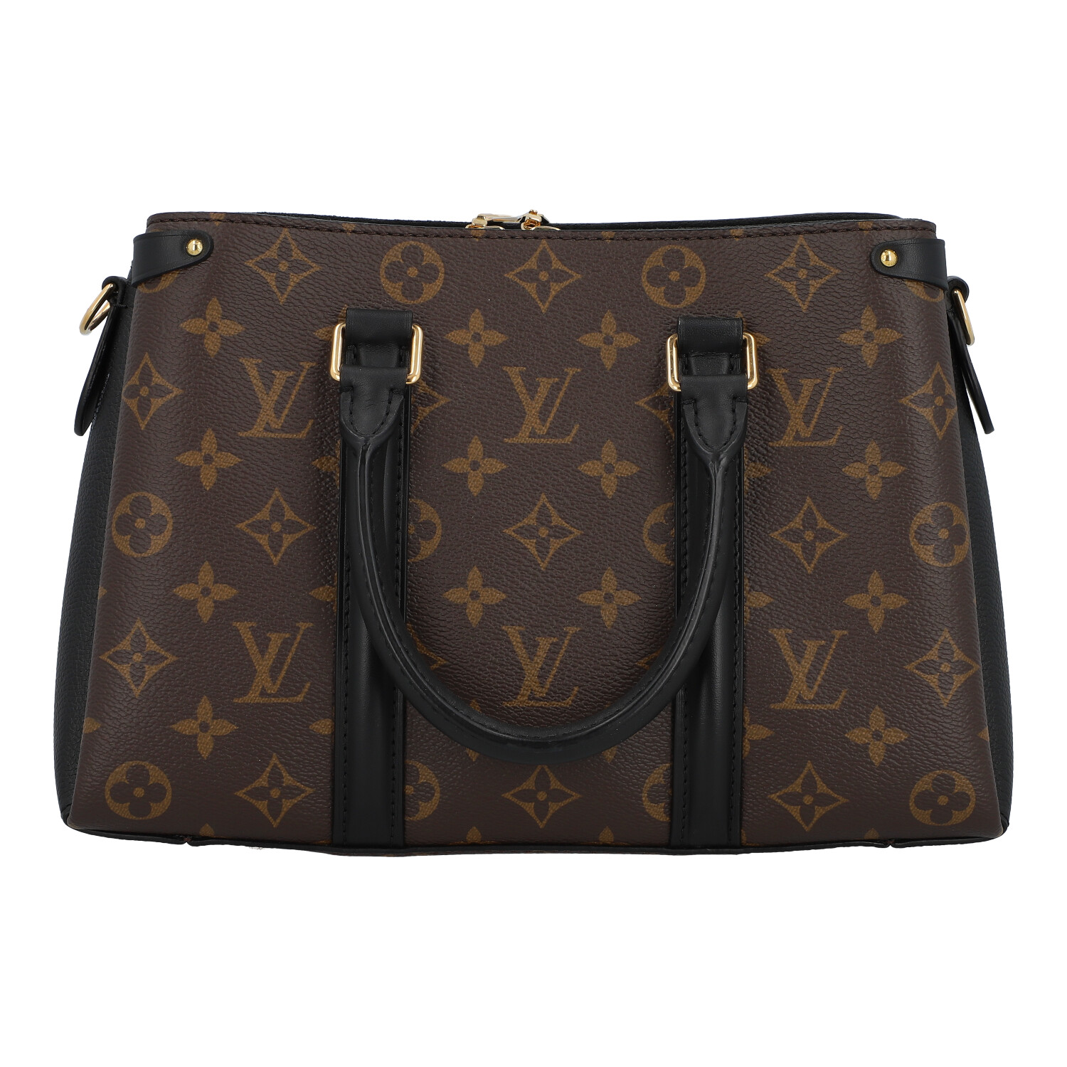 LOUIS VUITTON handbag 'SOUFFLOT BB'. Monogram canvas series with black leather details and gold-colored hardware. Main compartment divided into three large compartments, one with a zipper. One small side compartment. Box and dust bag enclosed. In very good condition, slight wear to the edges and slight signs of wear. 28x12x19cm.