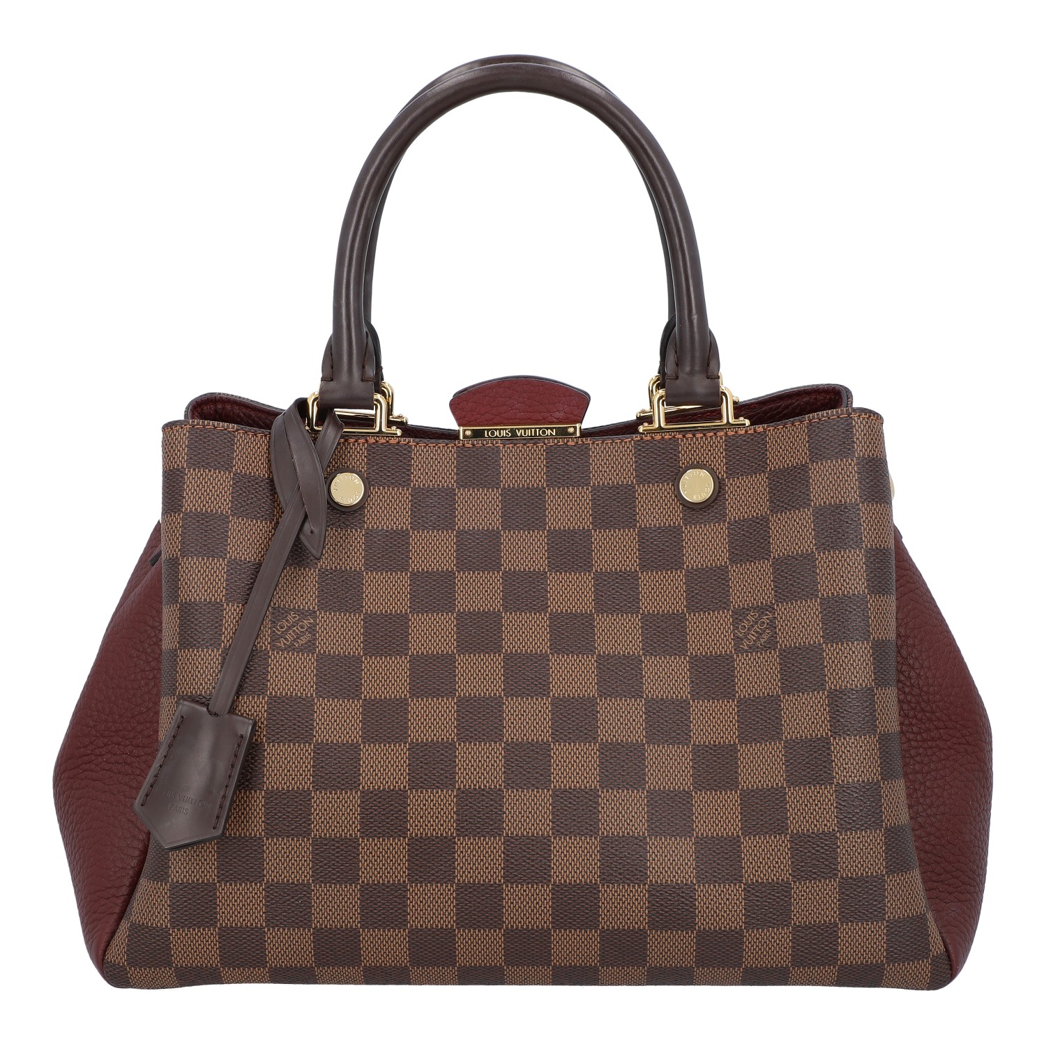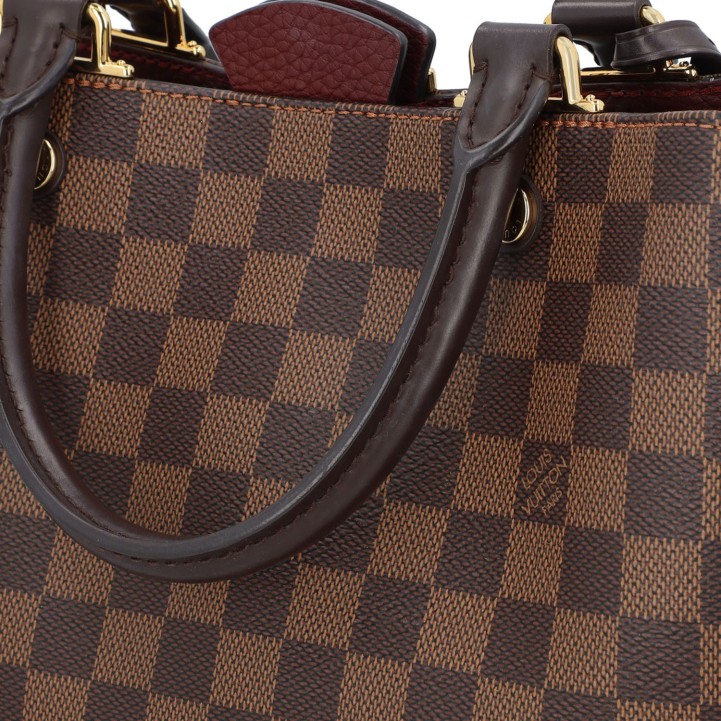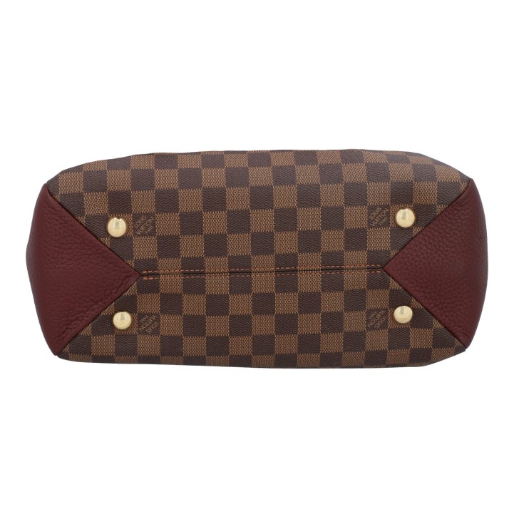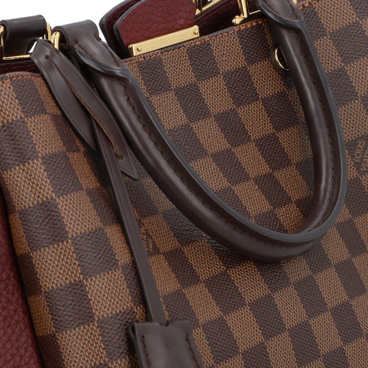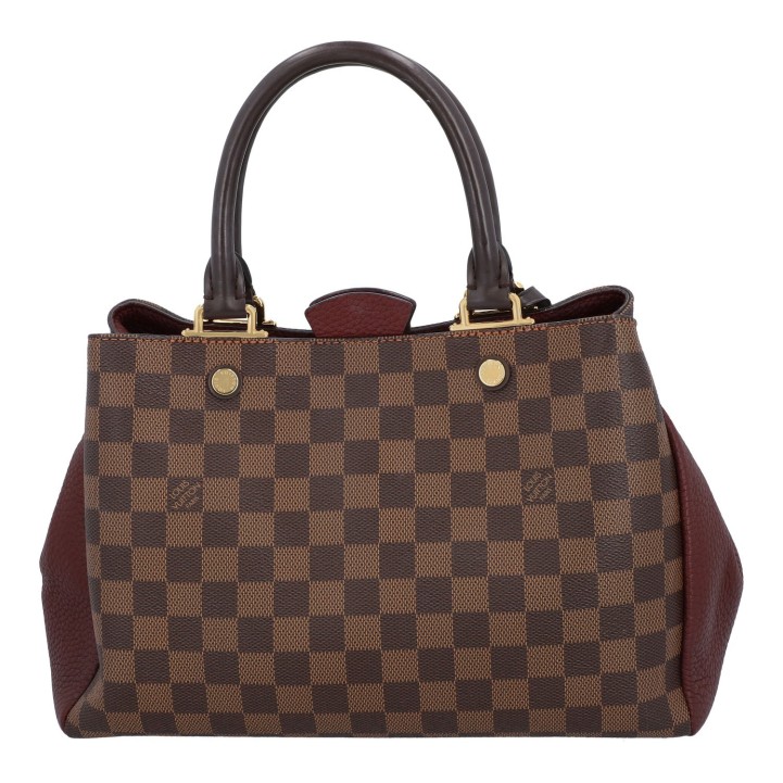 LOUIS VUITTON bag 'BRITTANY', coll.: 2017. Damier Ebene canvas series with gold-coloured hardware, dark brown and burgundy leather details, double handles and magnetic closure. Microfibre interior with three compartments, one of which has a zip. Signs of wear. 30 x 14 x 21 cm.