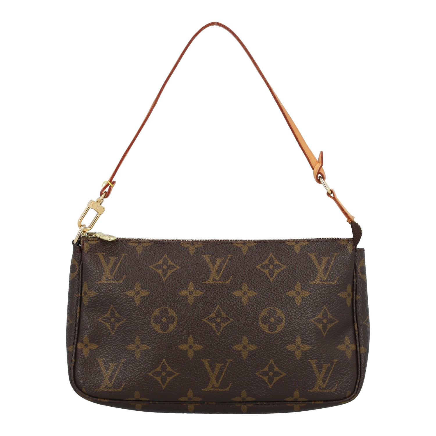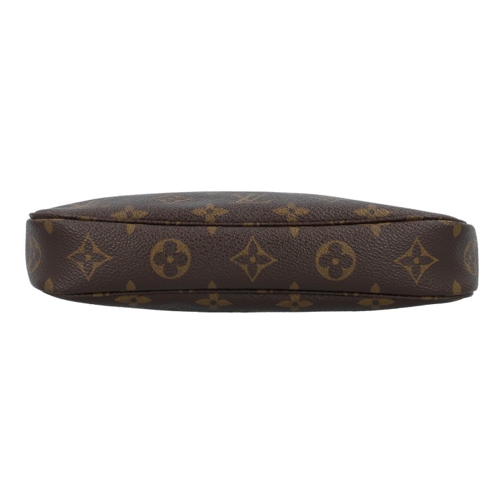 LOUIS VUITTON Pochette 'POCHETTE ACC.NM', coll.: 2003. Monogram canvas series with cowhide leather details, gold-coloured hardware and removable leather strap. Signs of wear present.