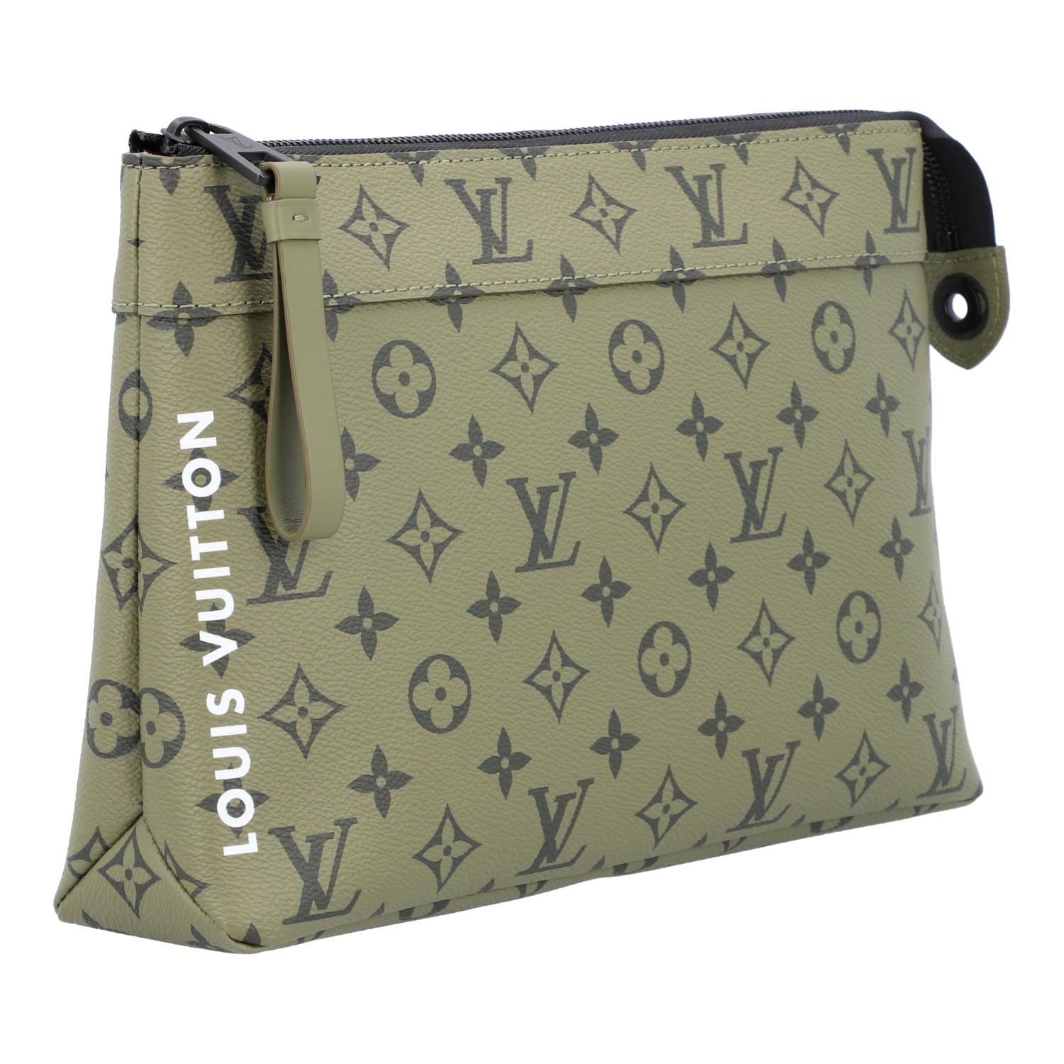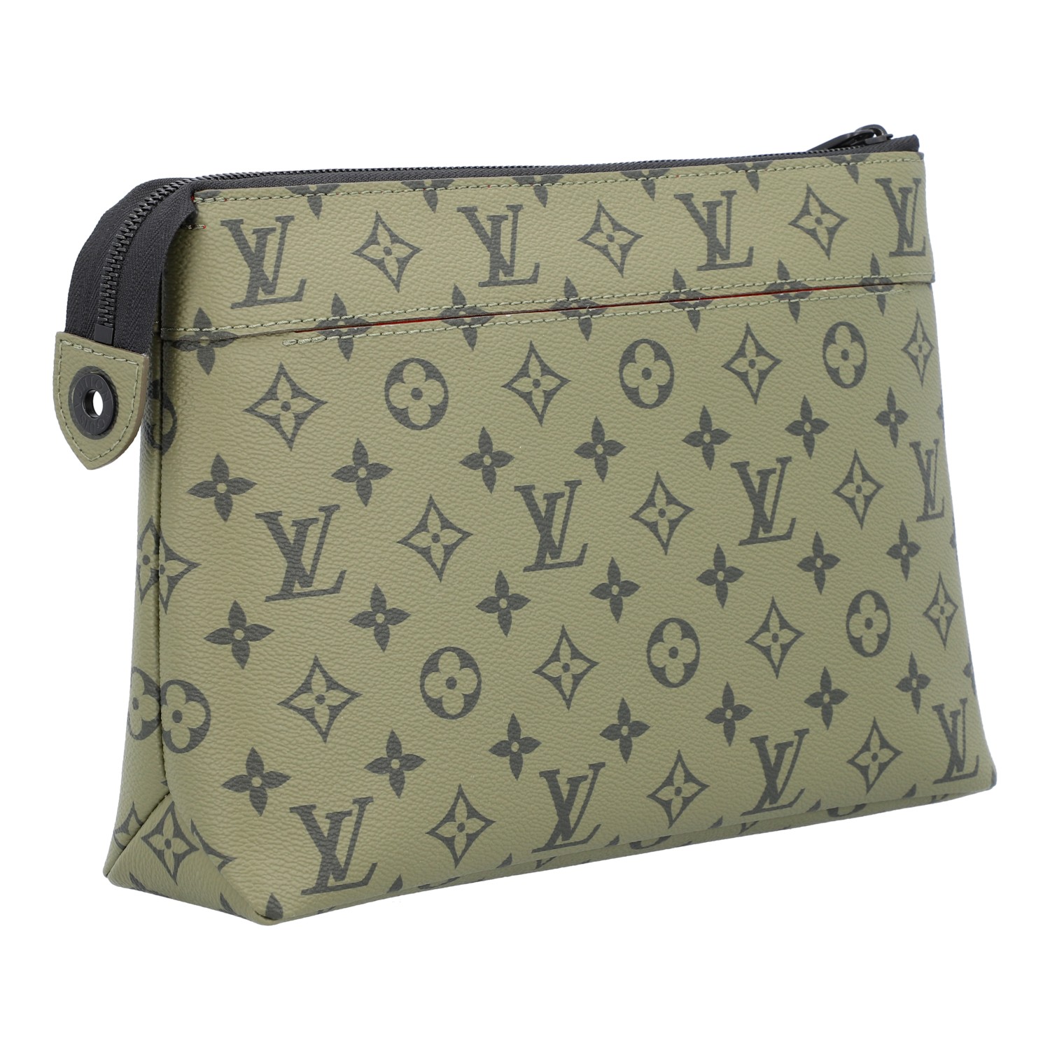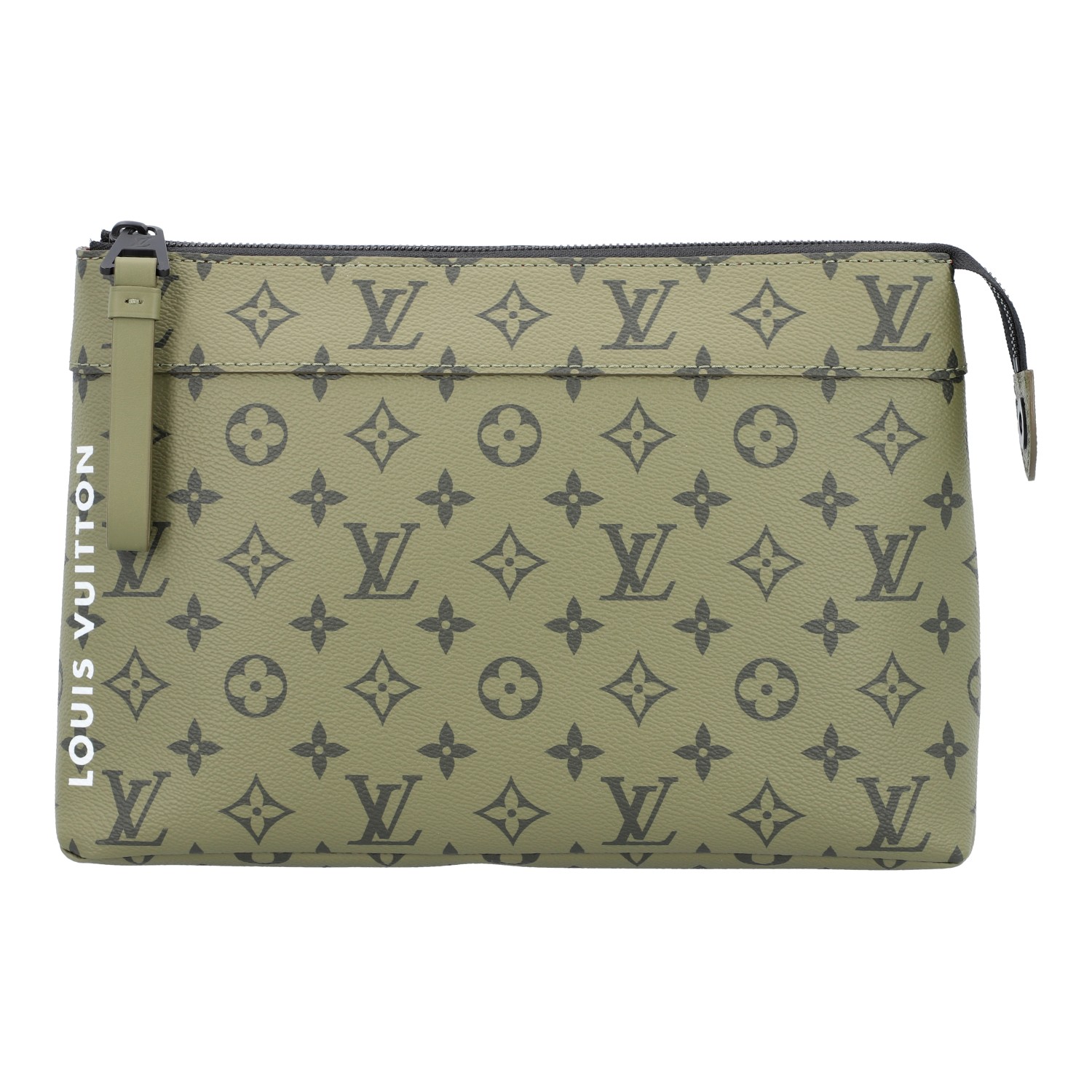 LOUIS VUITTON Pochette 'POCHETTE VOYAGE SOUPLE'. Monogram canvas in green with black hardware, zip closure and exterior pocket. Interior in orange canvas with three compartments. Dust bag included. Good condition. 29 x 7 x 19 cm.