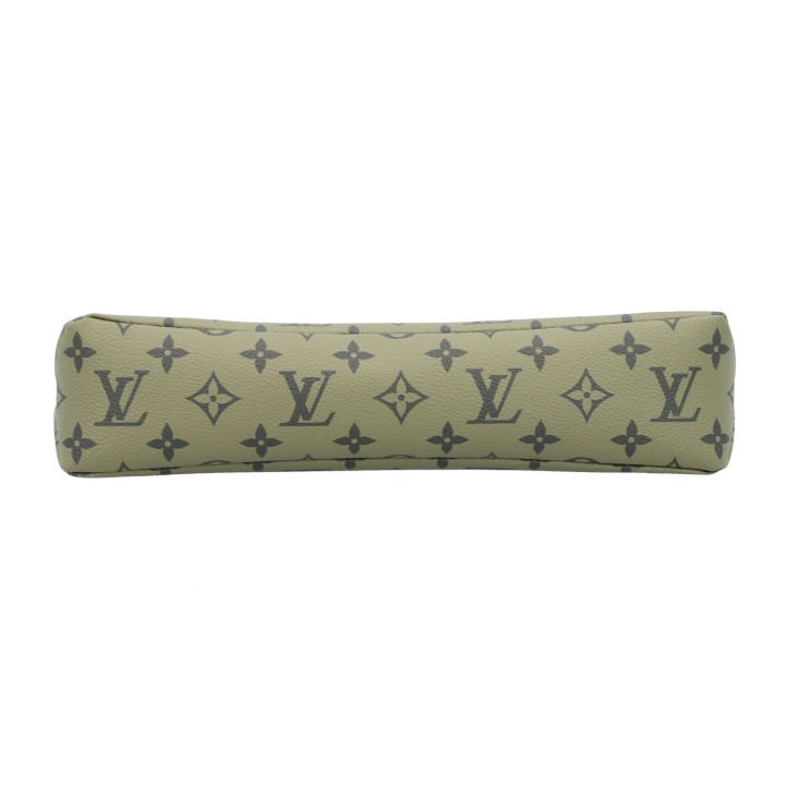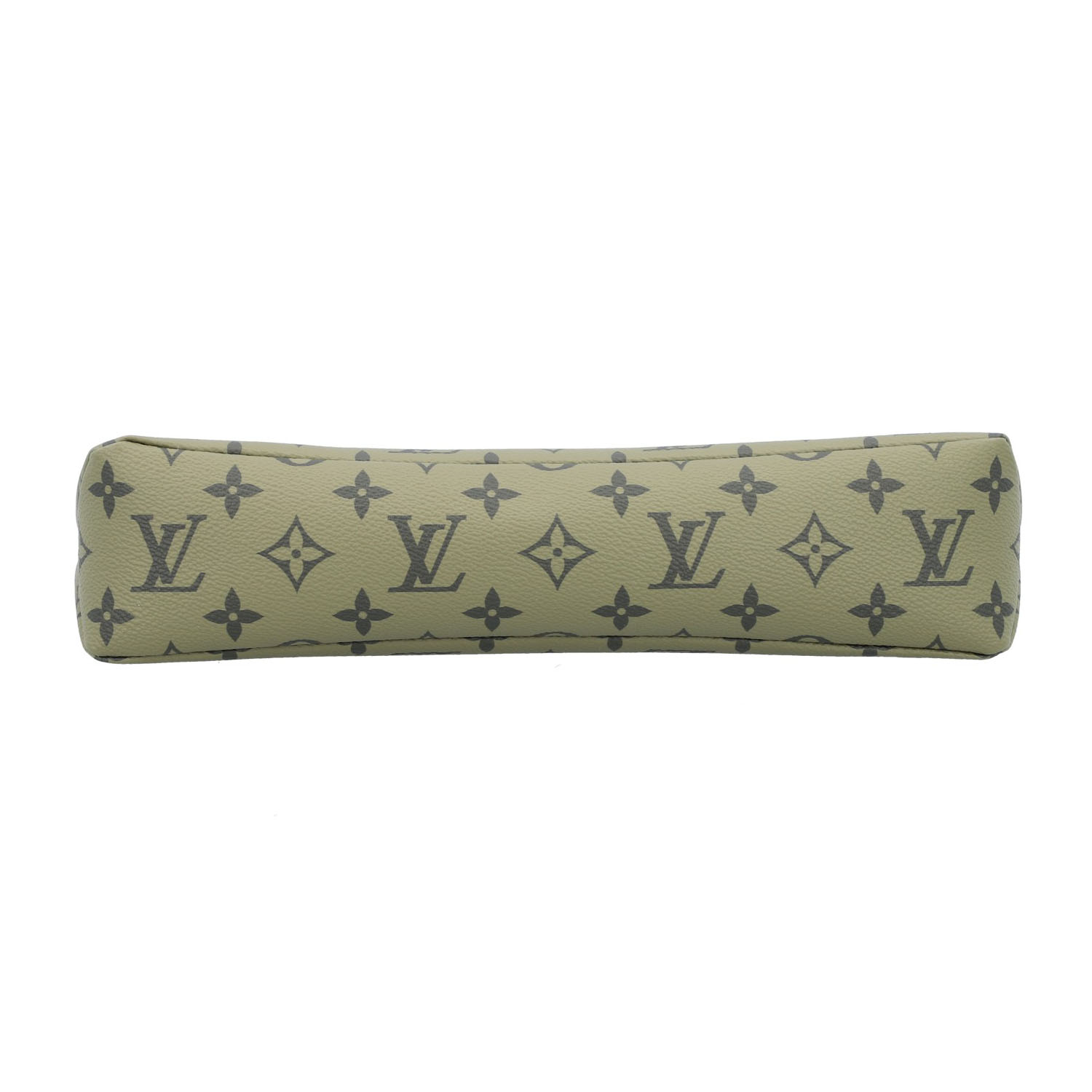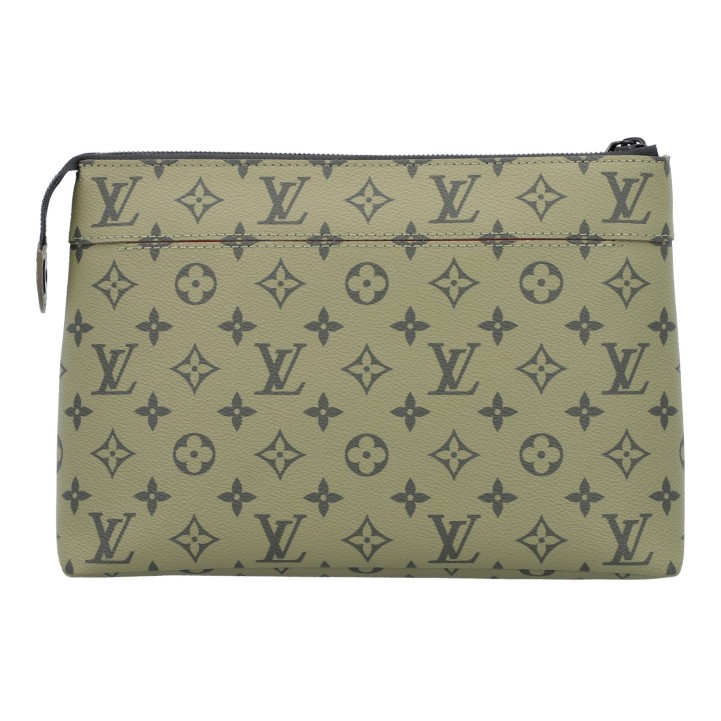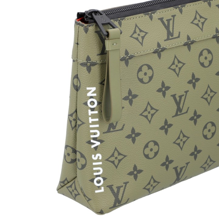 LOUIS VUITTON Pochette 'POCHETTE VOYAGE SOUPLE'. Monogram canvas in green with black hardware, zip closure and exterior pocket. Interior in orange canvas with three compartments. Dust bag included. Good condition. 29 x 7 x 19 cm.