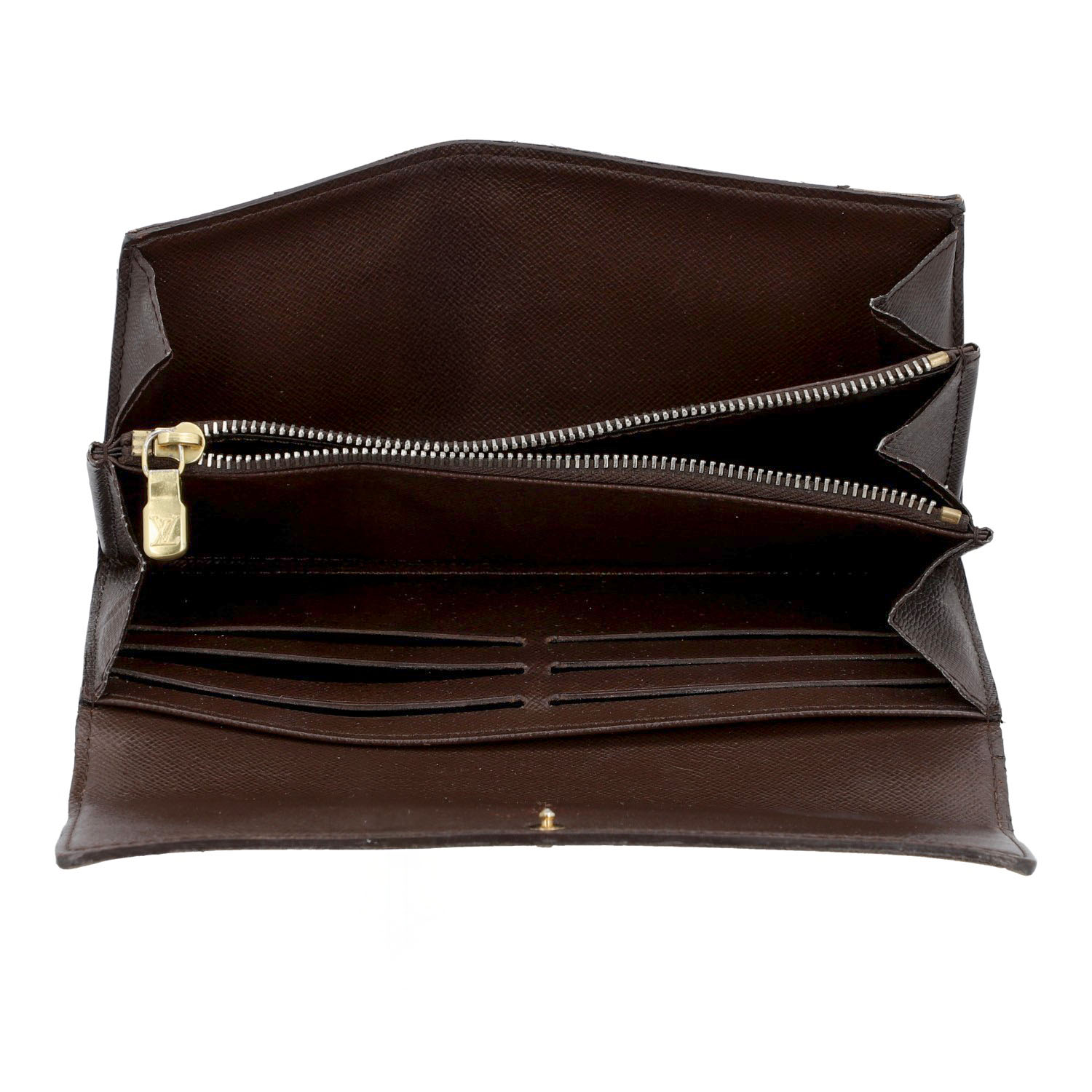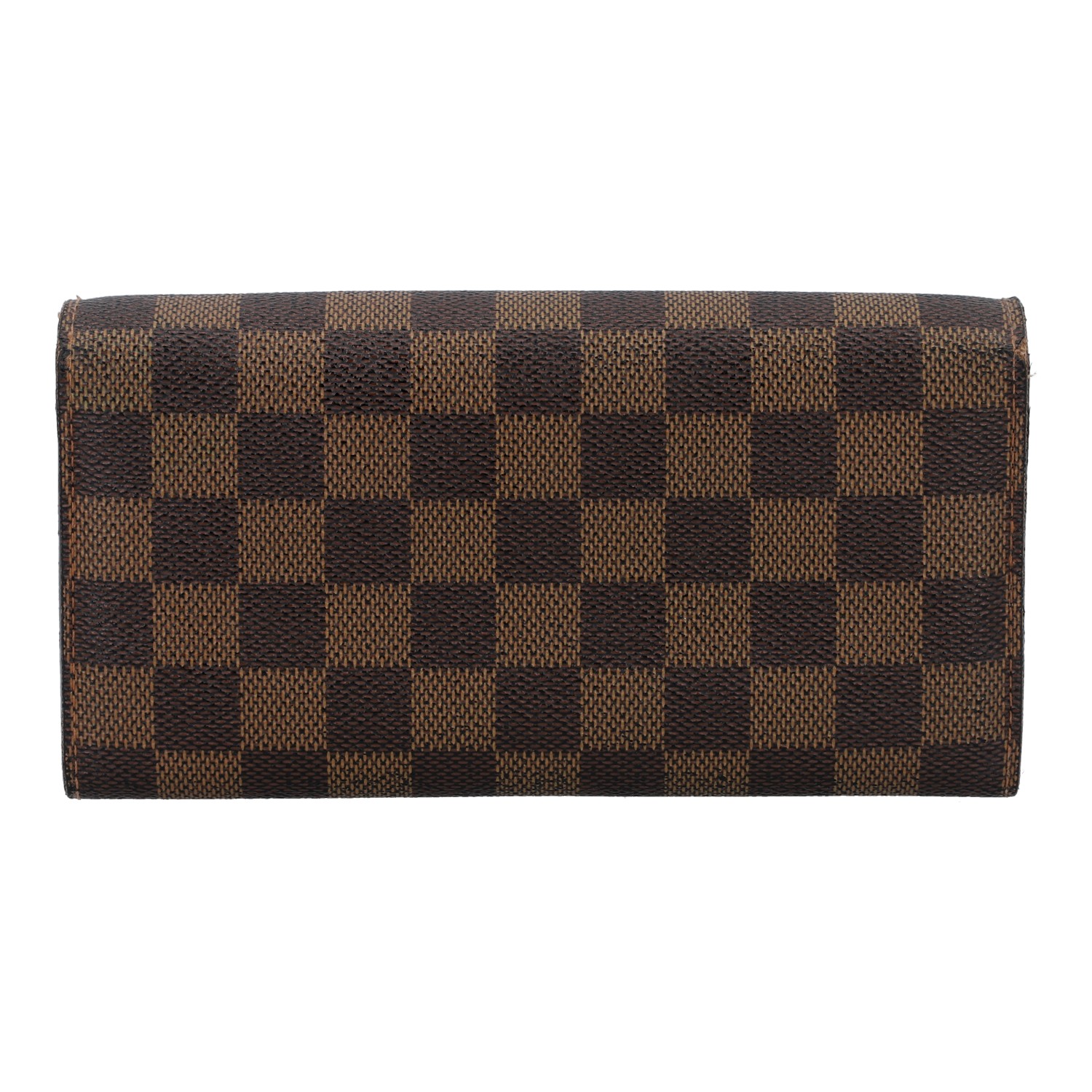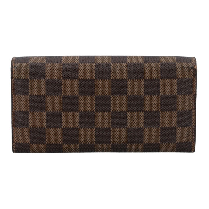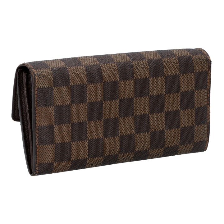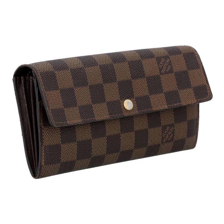 LOUIS VUITTON wallet 'SARAH', coll.: 2008. Current retail price: €560. Damier Ébène canvas with gold-coloured hardware and press stud closure. Interior with ten card slots, four large compartments, one with zip closure. Box and dust bag included. Various signs of wear.