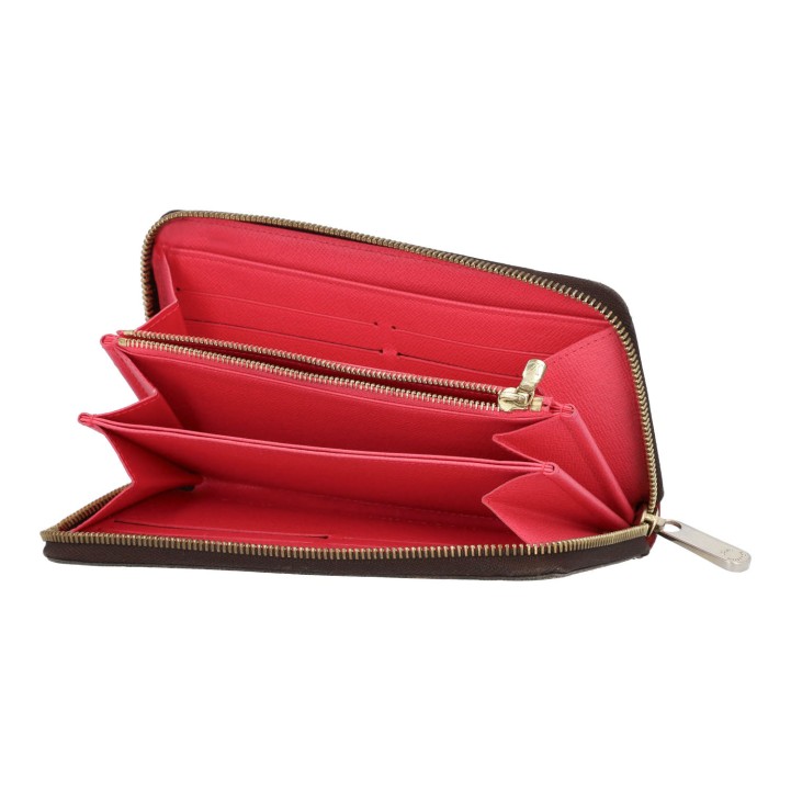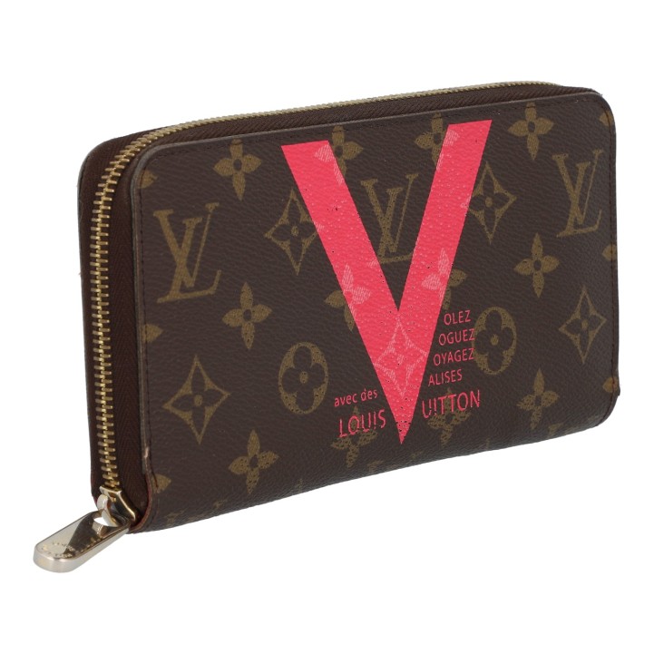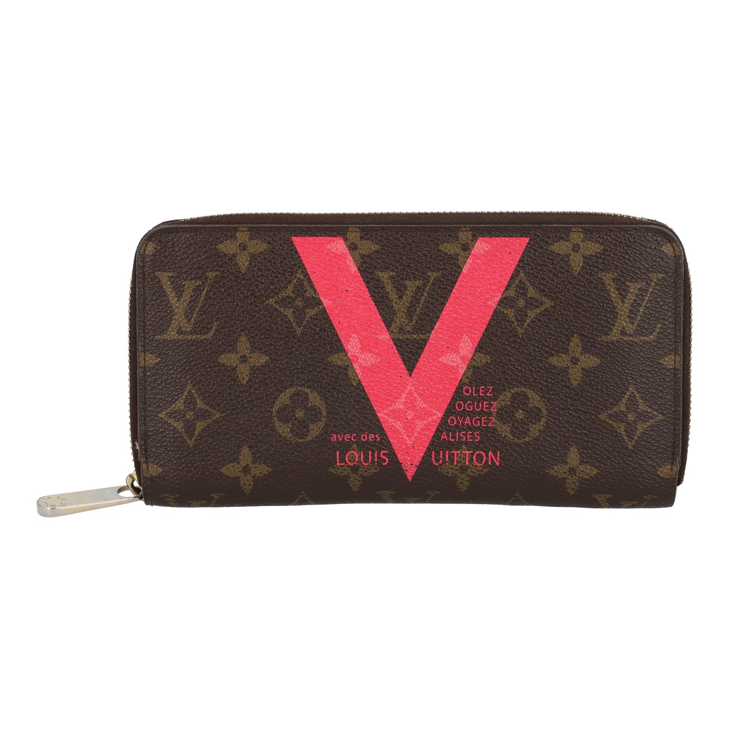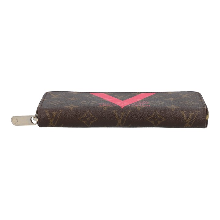 LOUIS VUITTON wallet 'ZIPPY MONOGRAM V', coll.: 2015. Monogram Canvas series with pink motif, gold-coloured hardware and all-round zip fastening. Pink interior with six large compartments, one zip pocket and eight card slots. Box and dust bag included. Signs of wear, some of the print has come off slightly.