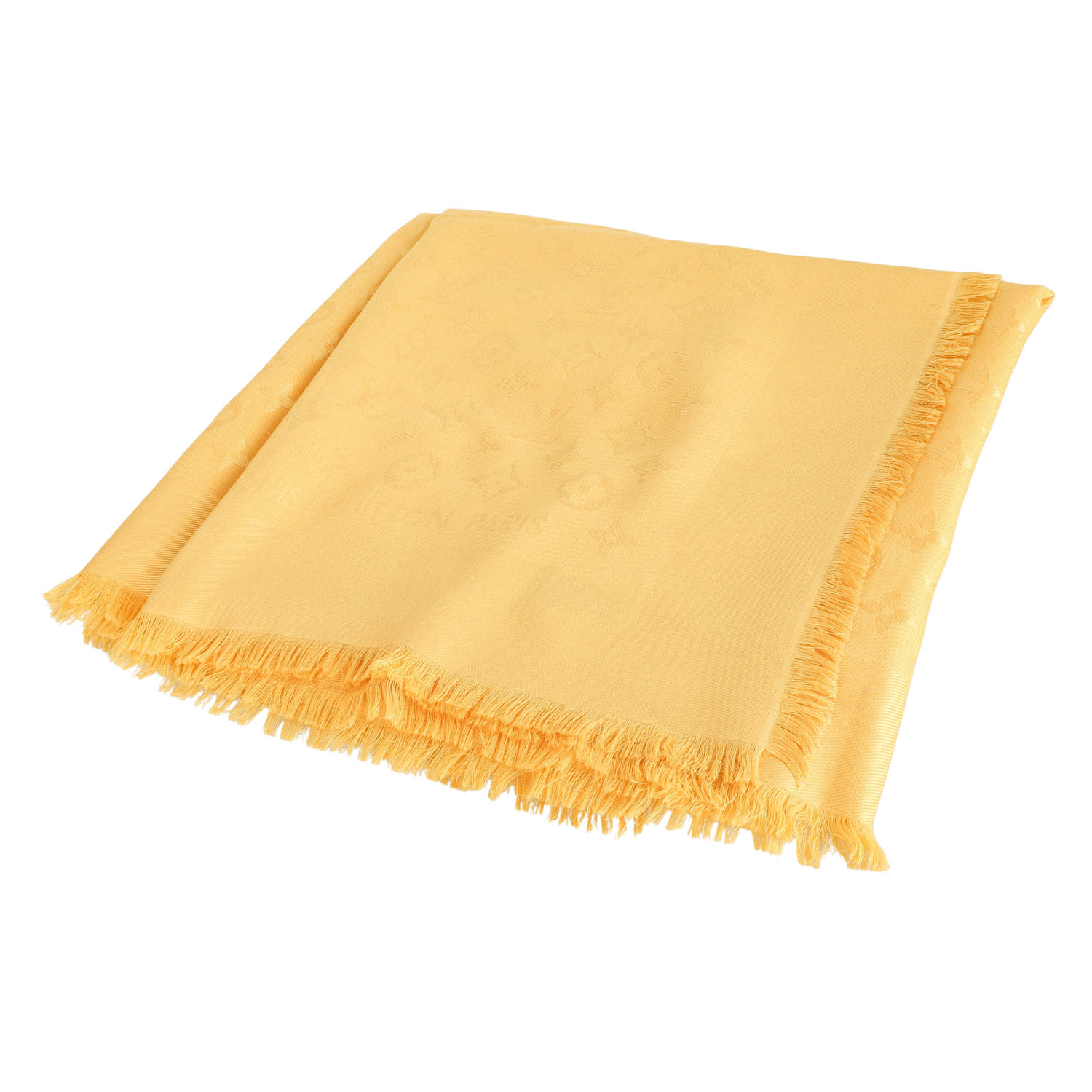 LOUIS VUITTON scarf 'MONOGRAM CLASSIC'. Retail price 490,-€ 60% silk, 40% wool in yellow with classic Monogram pattern and fringes. Good condition.